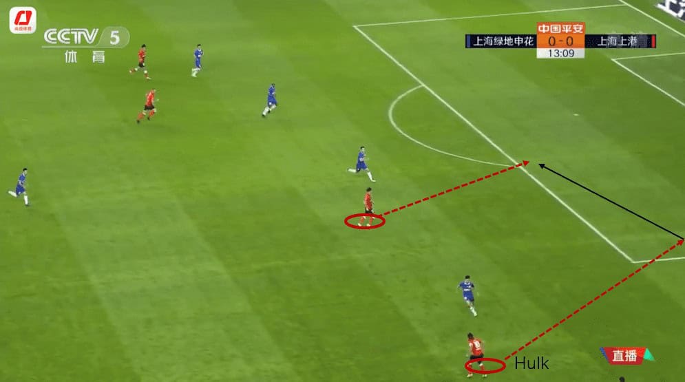 Also, Hulk was strong in the physique. His acceleration was fabulous and possessed skills to beat the opponent in 1v1. Therefore, SIPG would use of the concept of isolation on the flank to create 1v1 scenario for Hulk on the right flank. This would be achieved by clustering the pivots and four-back in the back, manipulating the man-marking approach of Shenhua. As Shenhua’s players all pushed and marked, isolation in the front line would be created and 1v1 scenario for Hulk can be created. This was the trigger for the ball-carrier to hit long to pick Hulk on the right. Then Hulk could go inside to shoot or outside to create finishing chances.