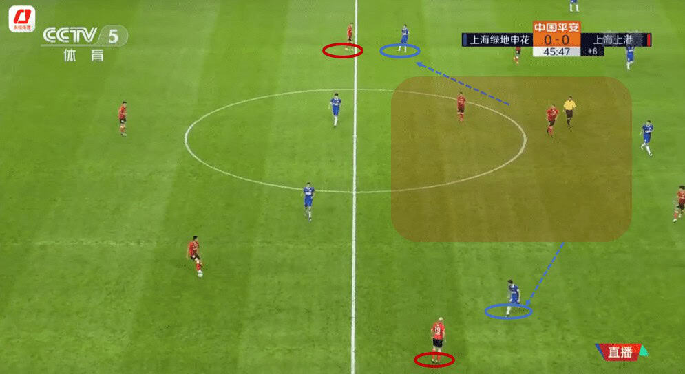 Thus, with the intention of preventing the ball played to skilful players and forcing mistakes, Shenhua tended to cut off the link from the back to midfielder players and front players. They adopted a man-oriented approach with a 1-4-4-2 mid-block, without much engagement on the ball but with traps.
