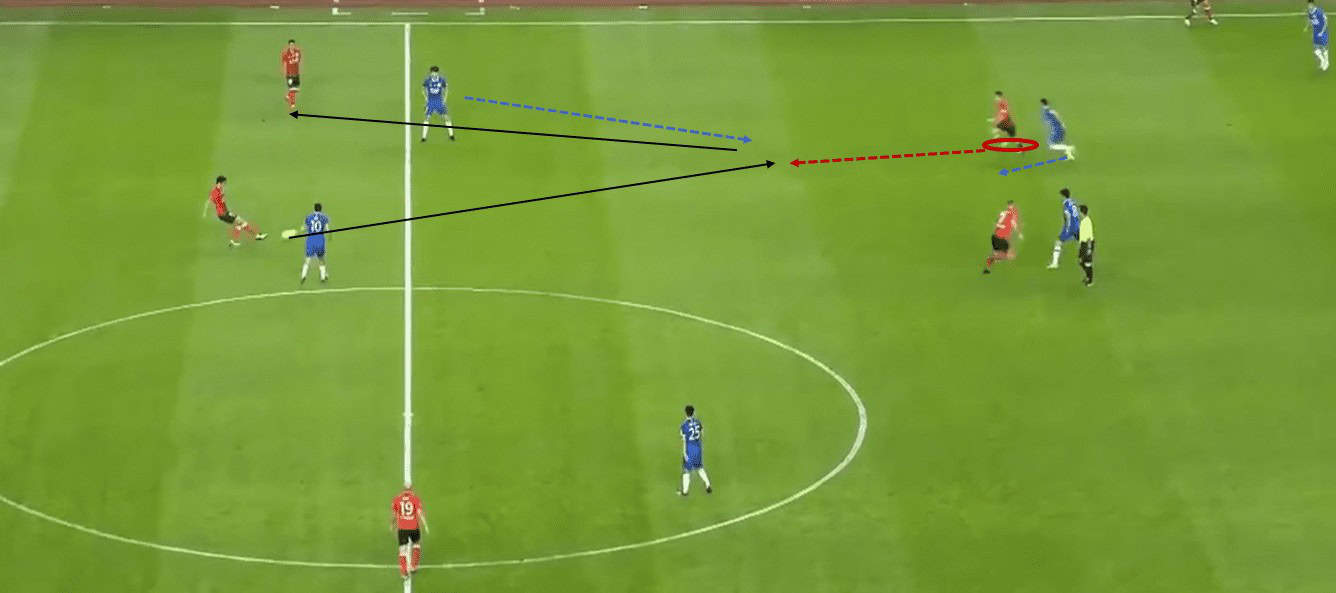 In the above image, the isolation was created in front on the right for Hulk. Then Hulk was picked from the back. In this 1v1 scenario, he accelerated diagonally towards inside and beat the opponent and the covering player was too late to arrive. He then played a cut-back pass to Fu Huan, who was in an opening to finish in the box.