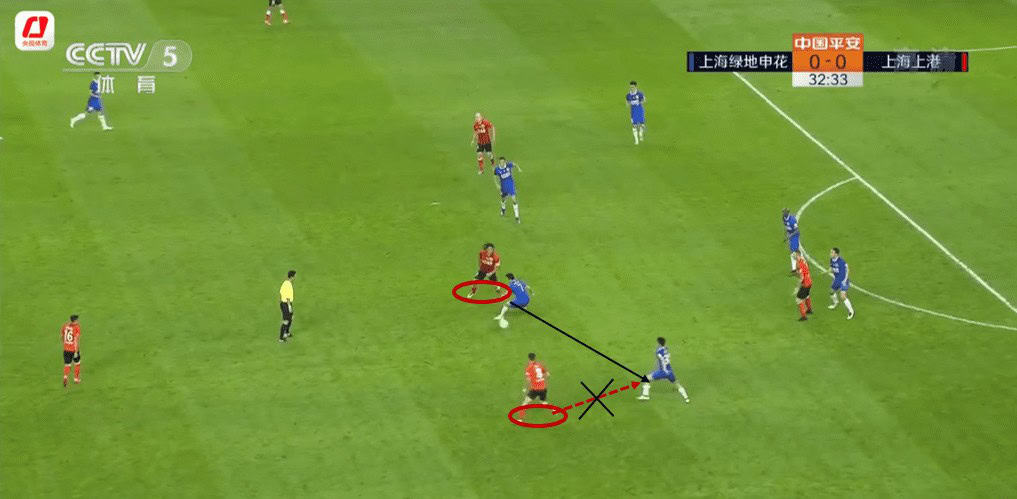 They left SIPG’s centre-backs to possess the ball unpressed and marked key players like Oscar and Mooy in a good distance. The distance of marking instigated SIPG’s centre-backs to take the risk and pass forwards. Then if SIPG’s centre-backs decided to pick a forward passing option that faced backwards, the pressure would come from the back to prevent turning and SIPG’s players into the trap. Shenhua’s pressing players from behind on this occasion would ideally poke the ball and dispossessed the opponent as their distance was close enough. Also, this would also trigger a doubling-up if there were teammates nearby and they would go and challenge the ball. This was the trap Shenhua utilised. If the ball wasn’t poked or recovered, it would also force the opponent to play back to the centre-backs. Centre-backs then might play long if they lost patience. In this way, Shenhua anticipated SIPG’s centre-backs or midfield players who couldn’t turn to commit mistakes in this stage.