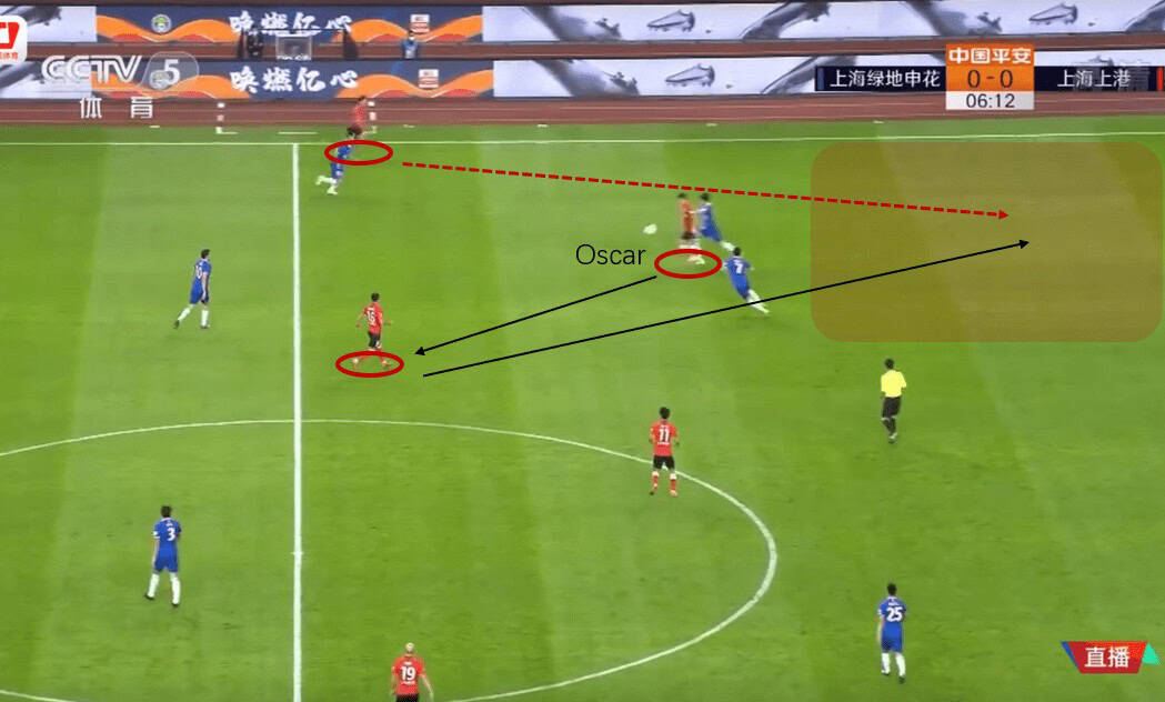 Oscar was the one who contributed a lot in breaking the marking mid-block of Shenhua. As he was deployed more on the left-flank in a 1-4-2-3-1 system, he was often tracked by the opposition right-back. In the first/second phase of the attack, he would drop into the midfield, attracting the Shenhua’s right-back to follow, freeing the left flank for the left-back Wang Shenchao to exploit. He would also serve as a link player to find the pivot in this stage, letting pivot to start the attack finding Wang Shenchao.