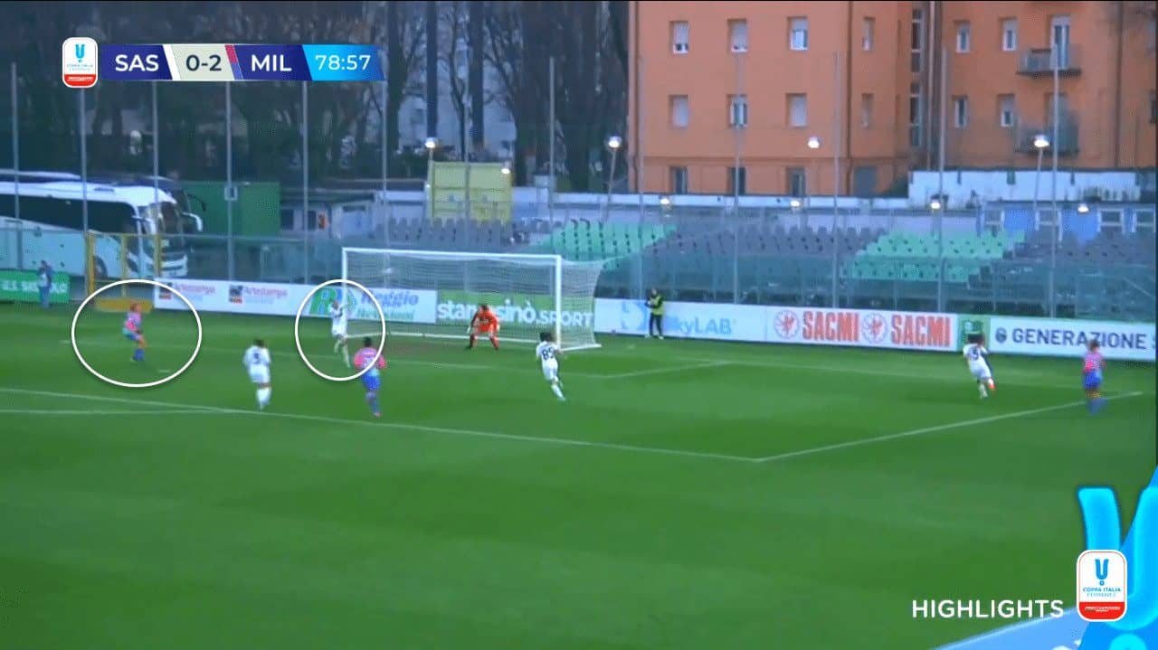 Moreover, exploiting the wings was another excellent choice by Corti since Dompig represented a real threat for Sassuolo throughout the game, knowing that Sassuolo’s defenders were not able to keep up with Dompig’s pace and that’s why they conceded a second goal in less than 15 minutes. The credit also goes to Árnadóttir, who saw Dompig’s run into space and provided her with an excellent through pass to meet her acceleration.