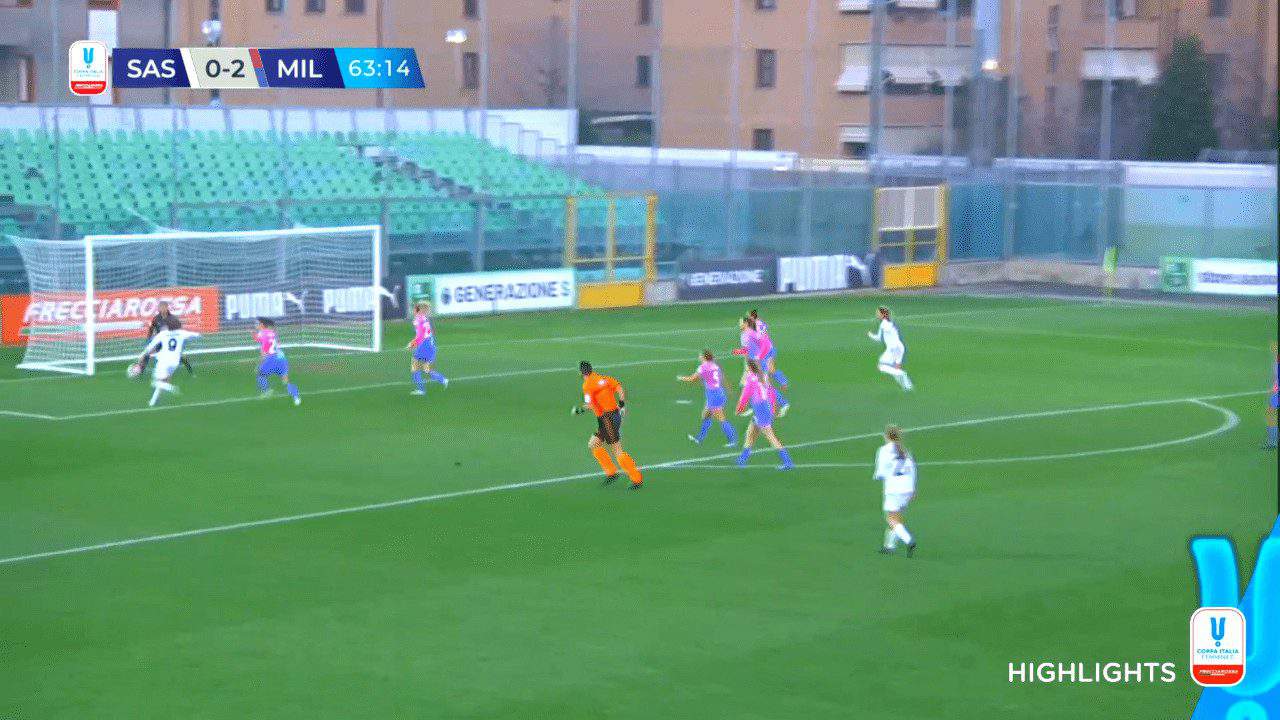 Milan was also capable of adding another goal or two because they were able to create numerous opportunities in this game, and perhaps the most notable missed chance was Vigilucci’s shot that was saved by Sassuolo’s goalkeeper following an excellent key pass from the right wing by Grimshaw. Vigilucci was positioned perfectly to successfully finish the action but failed to direct her shot where she wanted.