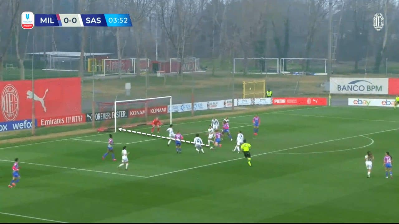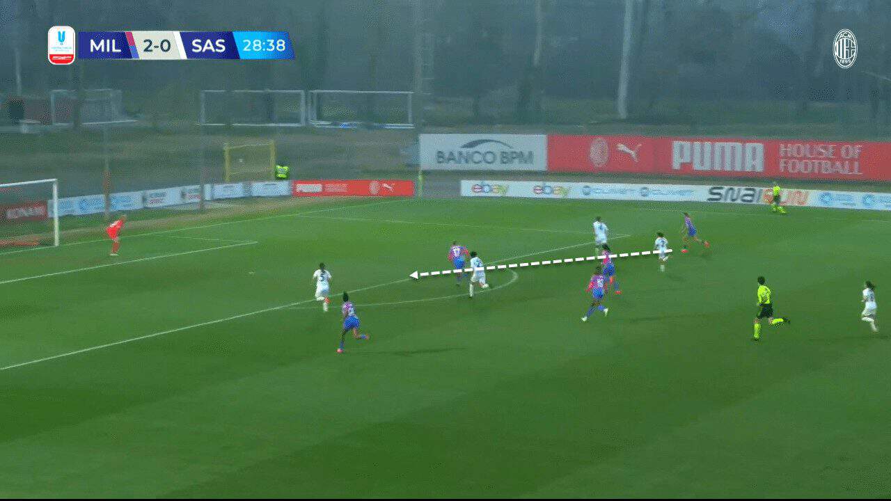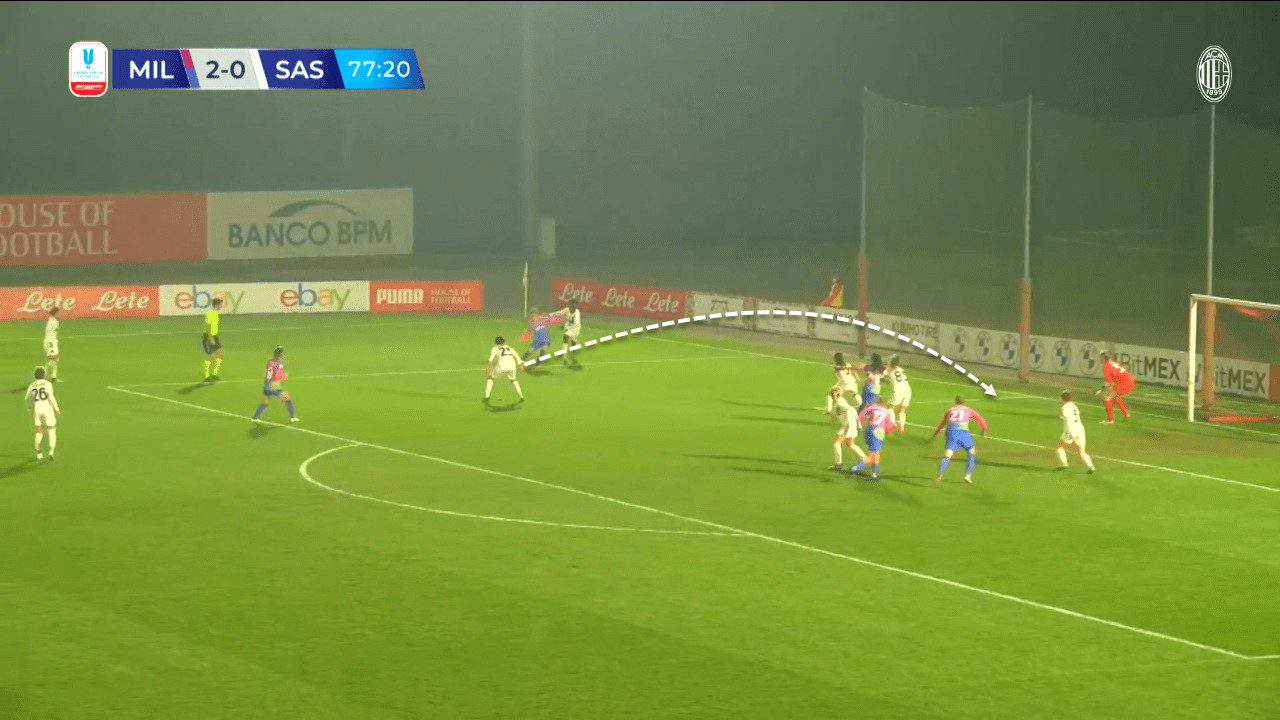 Having numerous reliable attacking options is another factor that helped Milan perform well even during the second half, with the subs of players like Stašková who provides remarkable attacking depth and allows wingers to rely on crosses since they knew that Stašková would be waiting for such crosses to win aerial duels and why not score. That’s exactly what happened in the second half as Soffia crossed the ball to Stašková, and the latter was able to finish the action on goal with some help from Vigilucci.