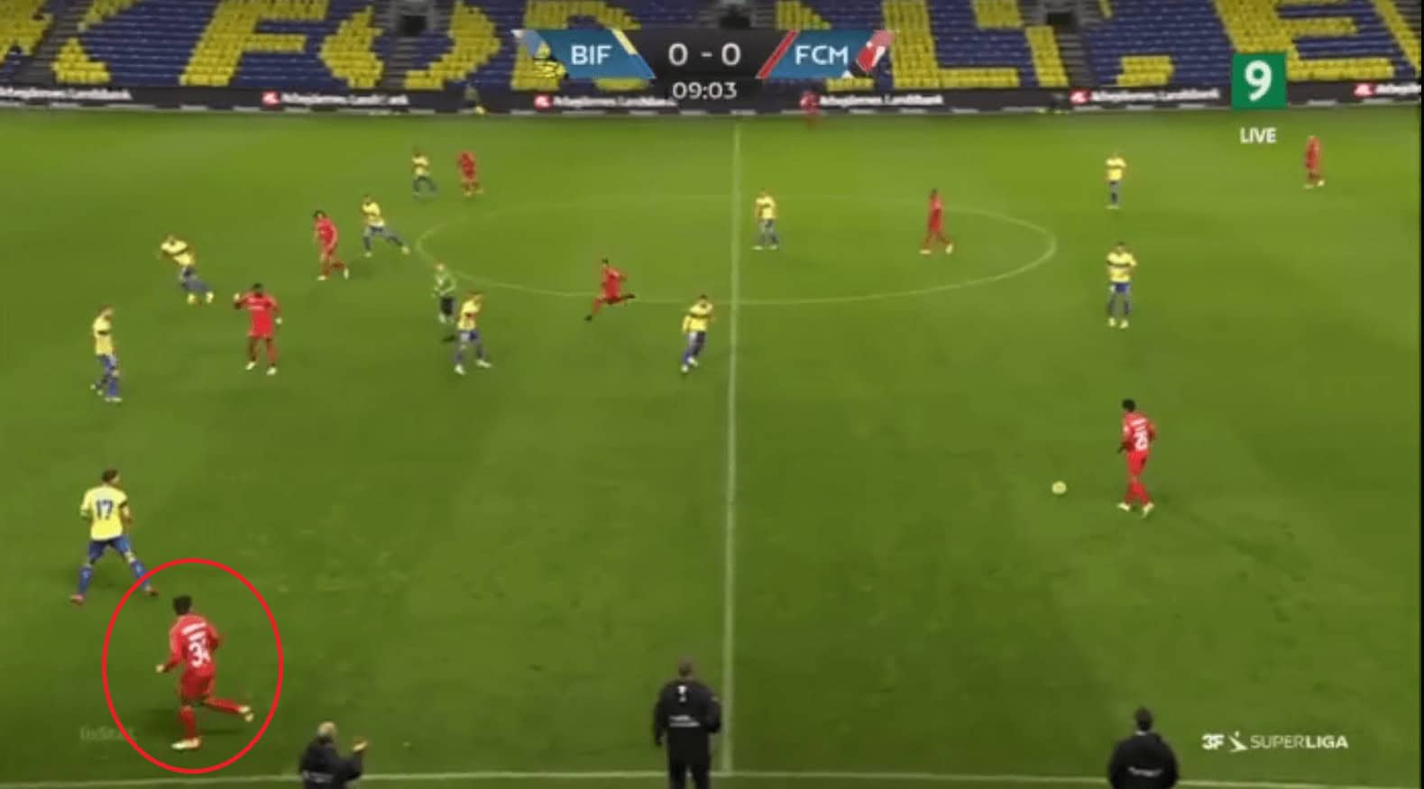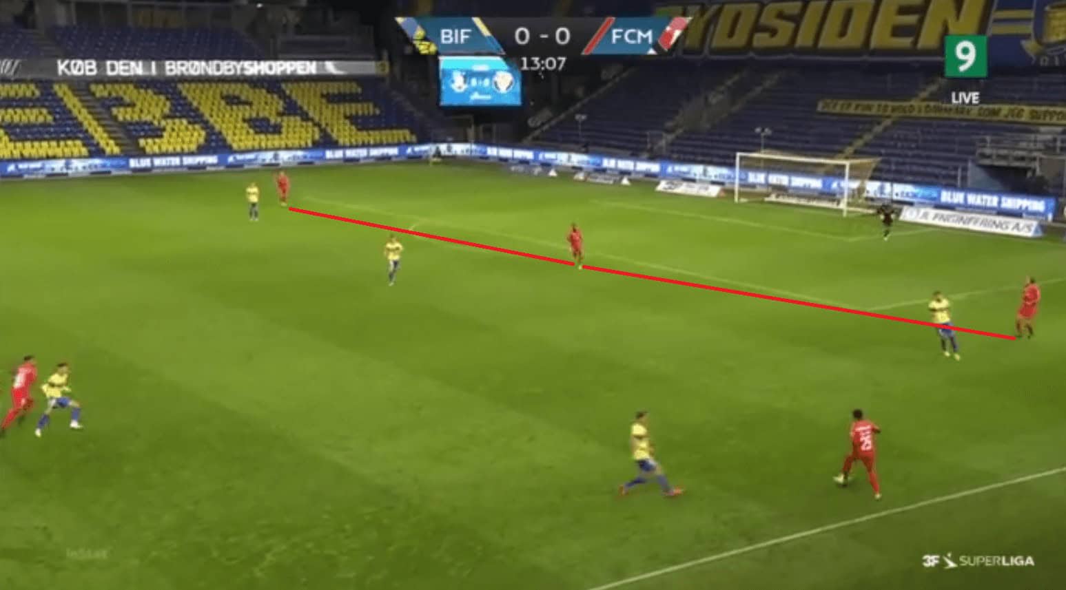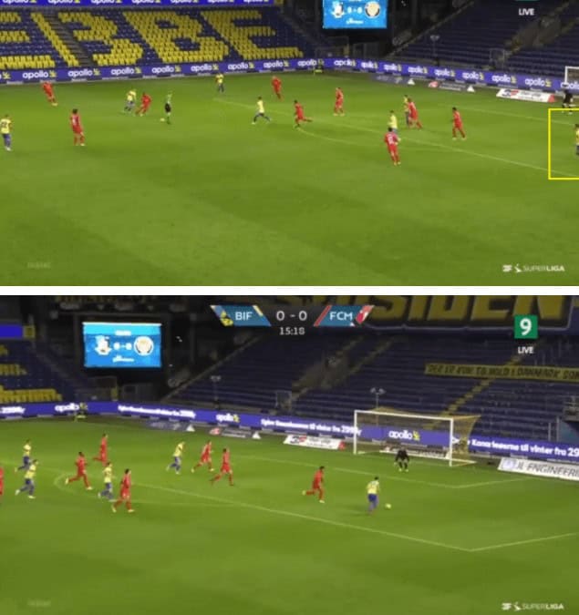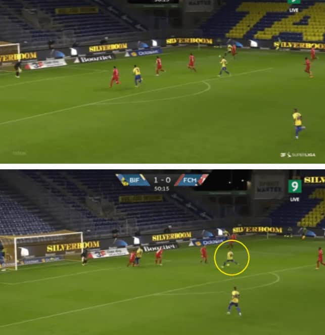 Their second goal was eventually scored from a cut-back in the wide right region during the second half. Brondby break at a good pace and find themselves with 2 runners inside the box and the Midtjylland players still finding their positions after tracking back, and one of the runners stops immediately to get the ball into space, as shown in the example below, and he receives the ball. He shoots without anyone closing him from forward as well as from behind.