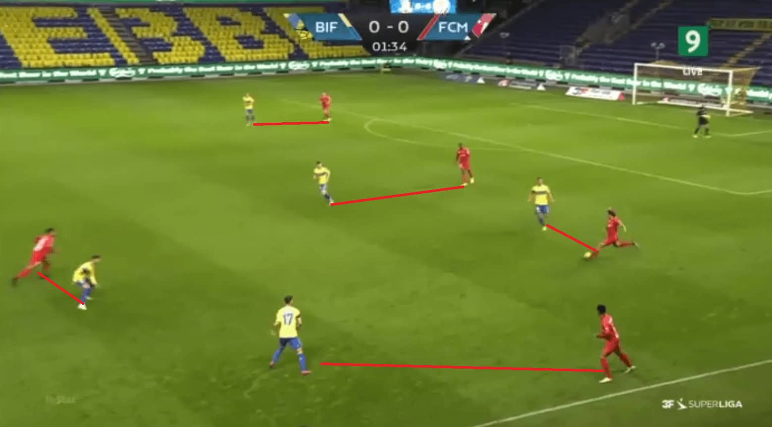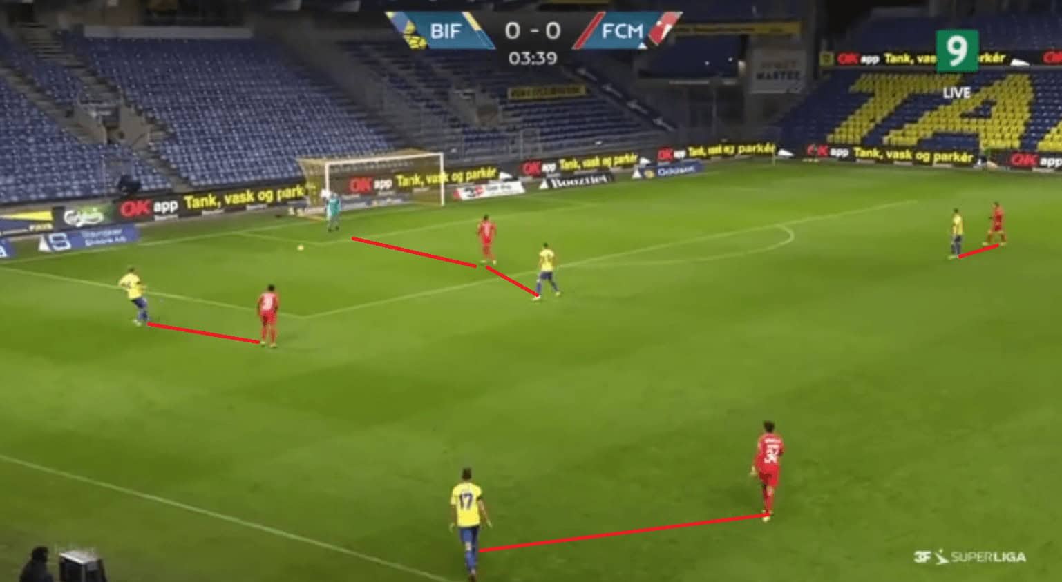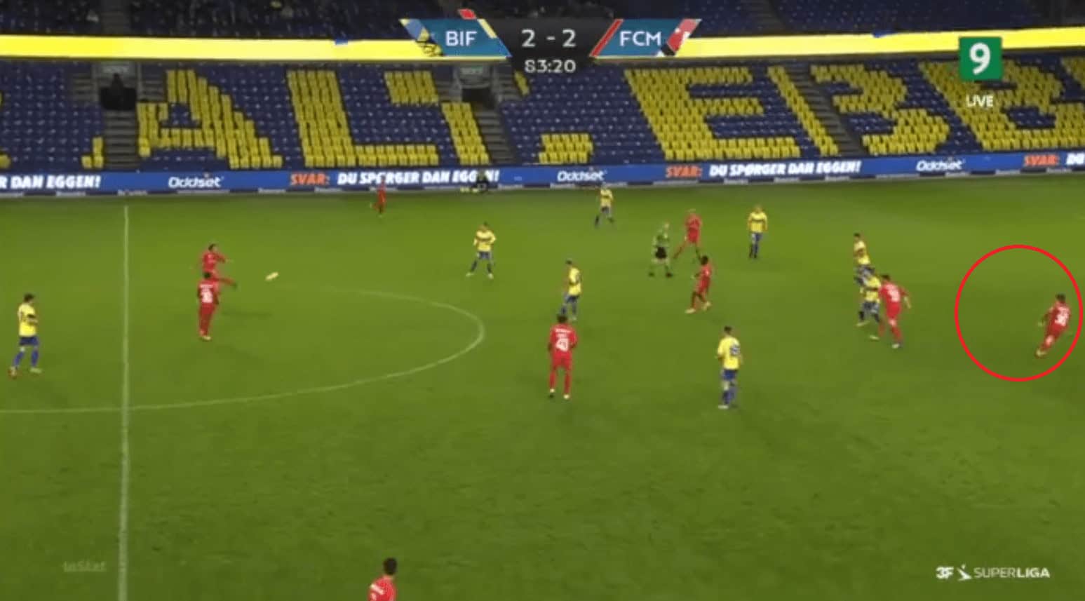 Their second goal was eventually scored from a cut-back in the wide right region during the second half. Brondby break at a good pace and find themselves with 2 runners inside the box and the Midtjylland players still finding their positions after tracking back, and one of the runners stops immediately to get the ball into space, as shown in the example below, and he receives the ball. He shoots without anyone closing him from forward as well as from behind.