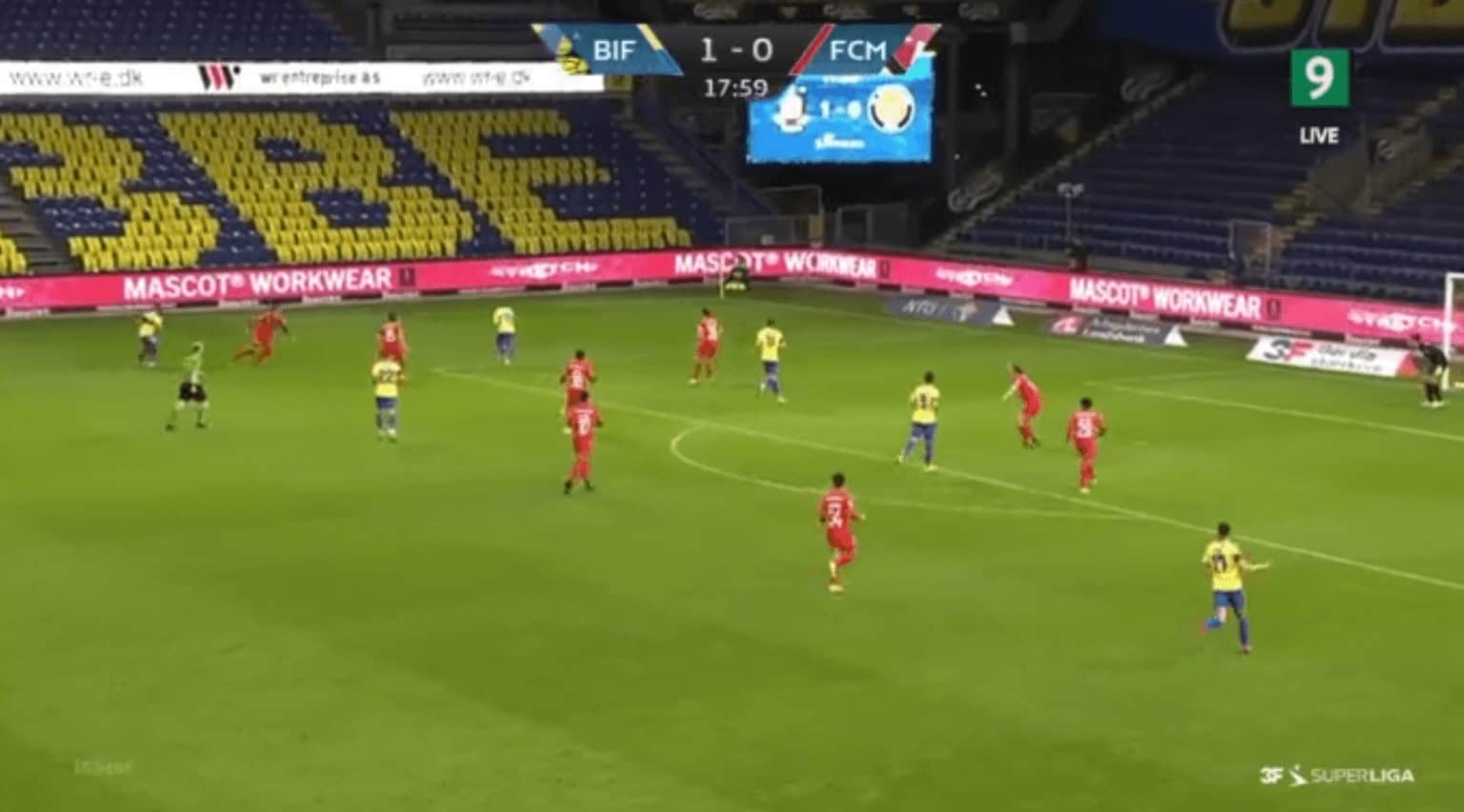 Brondby’s wing-backs pushed higher like any other wing-backs in a 3-5-2 system to make it a 3-2-5 with possession. The high positioning of the WBs forced Midtjylland backwards at times, and since they stayed wide, they either were left free, or they forced the defence to stretch. This also led to the first goal as Bruus staying wide meant that Midtjylland ignored him completely and he was left without a marker. A simple ball was played to him, and he immediately took a shot to score their first goal.