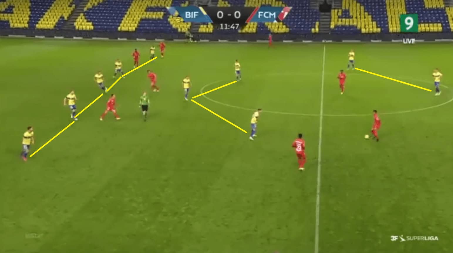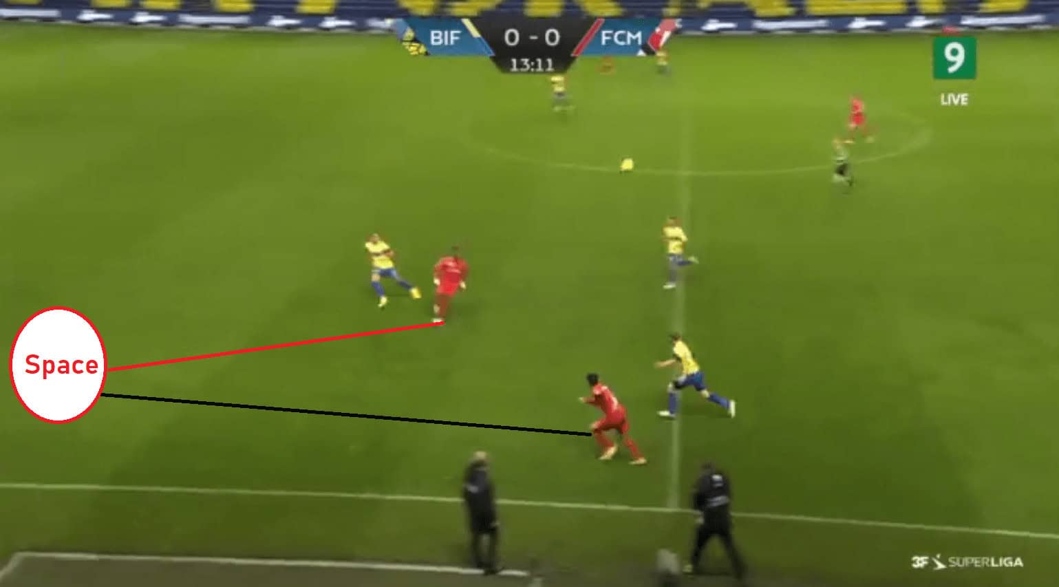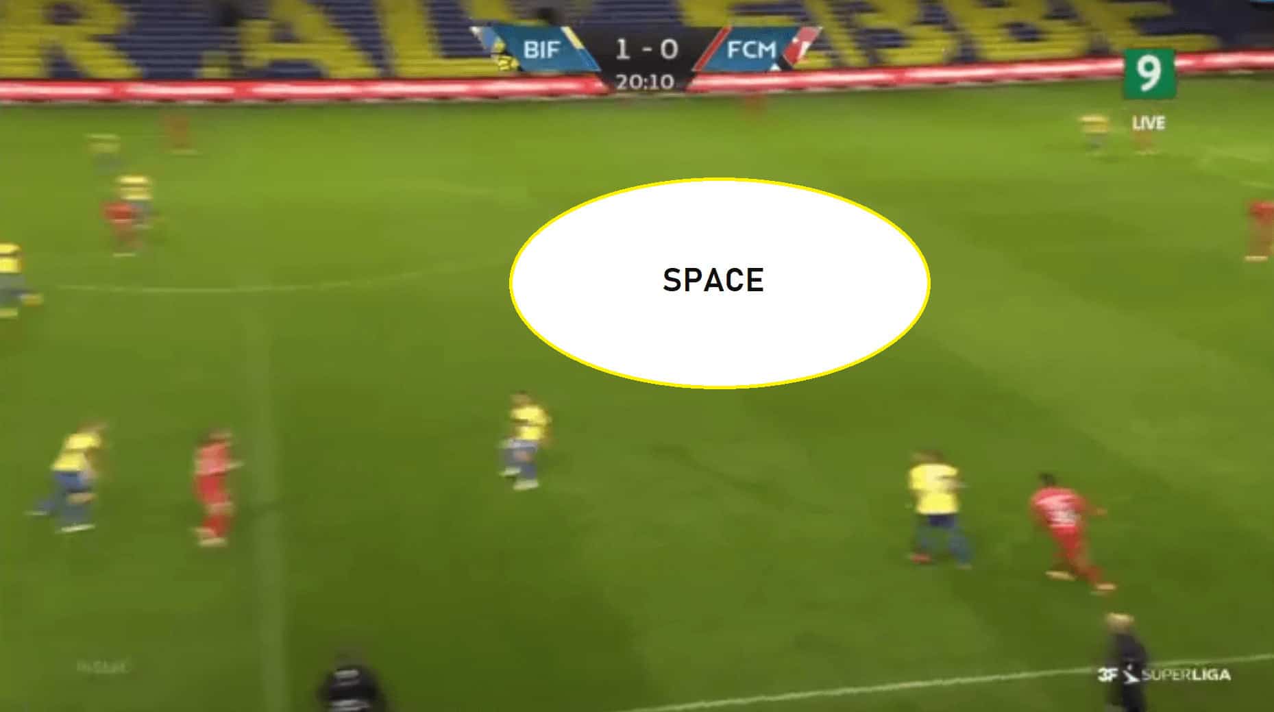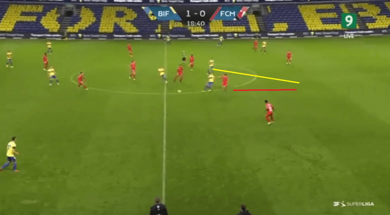But this distance in between the lines was not always visible as sometimes the defensive lines failed to push forward along with the attack and the midfield lines. This left a huge space in the centre of the pitch with no Brondby players covering the space there.