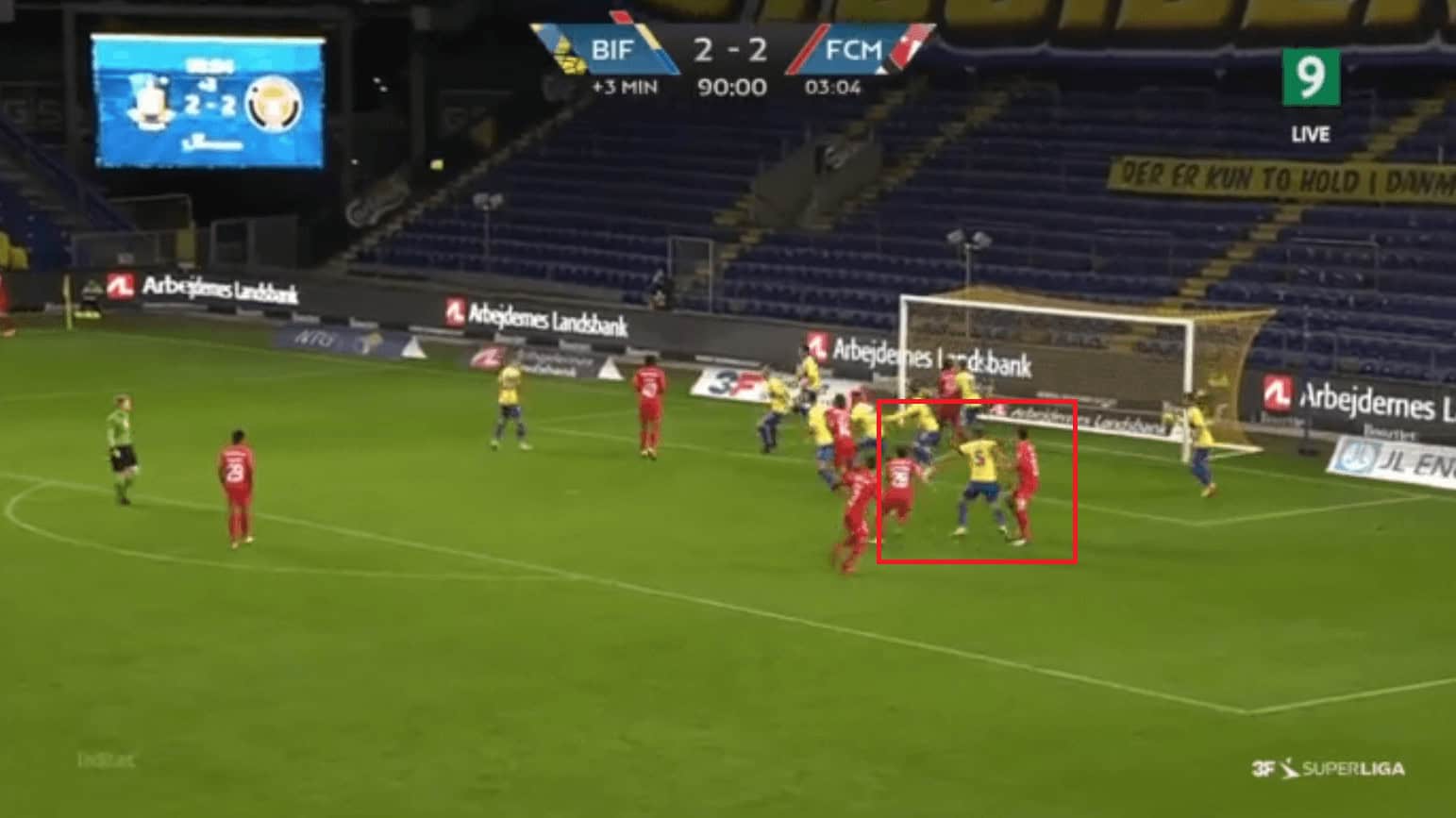 Later they won from a corner that saw them use a good set-piece technique to win the game. In the image below, we can see that apart from the 3 Midtjylland players getting man-marked the other Brondby players completely in a zonal system overcrowding the six-yard box. This left a free man (number 28) without getting marked, and he created a 2v1 situation with his teammate for a marker. And that teammate blocked the markers run, and it left Sviatchenko (number 28) to take a header and score the winner.