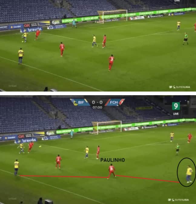 Brondby mostly looked to play out from the back when they had possession. Their tactics were to draw the Midtjylland’s midfield and forward line to the press high and then launch a long ball to the forwards and isolate them with the defensive lines in a 1v1 or 2v2 situation. In this example, we can see that Paulinho, the left-back goes higher to press the Brondby wing-back. Now another midfielder drop at the same time (black-circle) and Paulinho is left in two minds as to press them. The CB who has possession immediately launches a long ball.