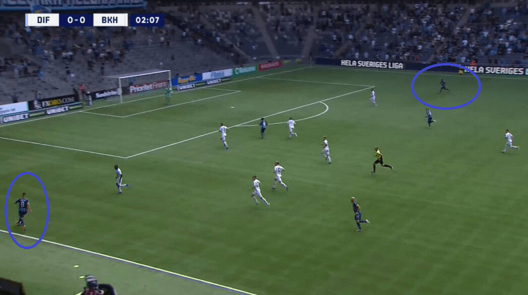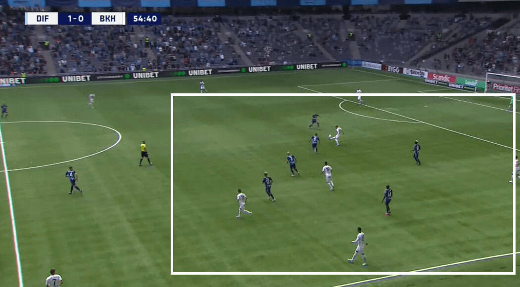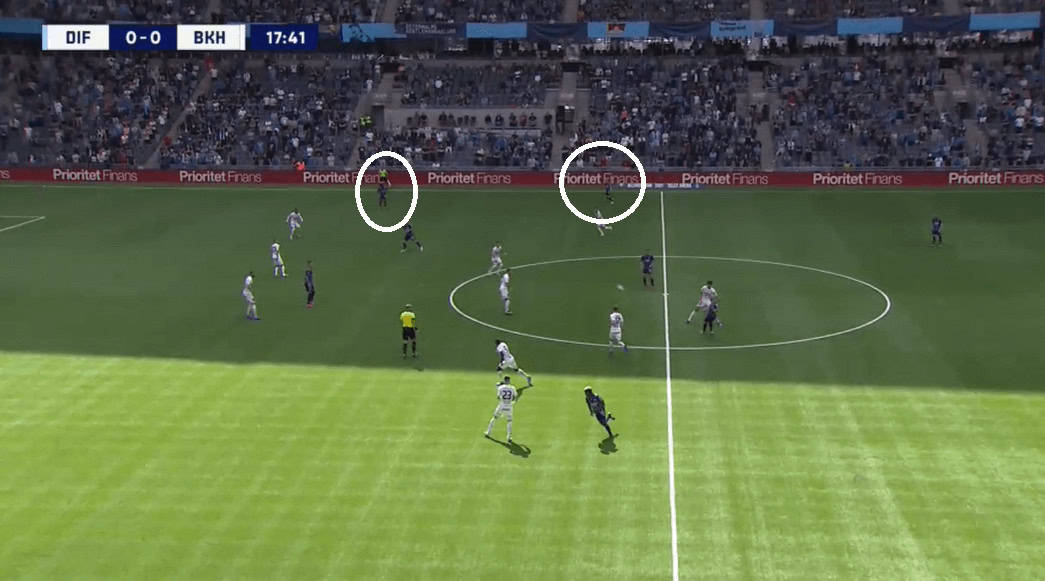 In a 4-3-3 system resembling modern-day possession-based teams like Pep’s Manchester City, Djurgardens went out to dominate the game by controlling the possession as well as the proceedings. The wingers positioned themselves very wide like in the image below. The idea was to stretch Hacken’s defence and find spaces in between the CBs and FBs. The wingers’ positioning meant that there were multiple instances where they were able to attract the full-backs while the CM made blindside runs into the boxes through the half-spaces.