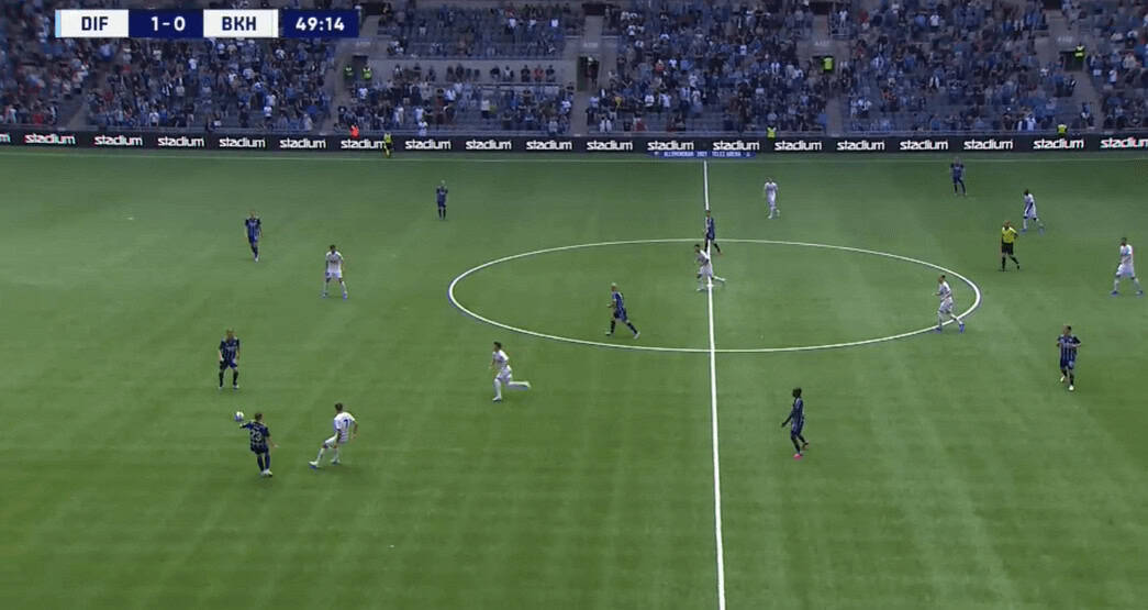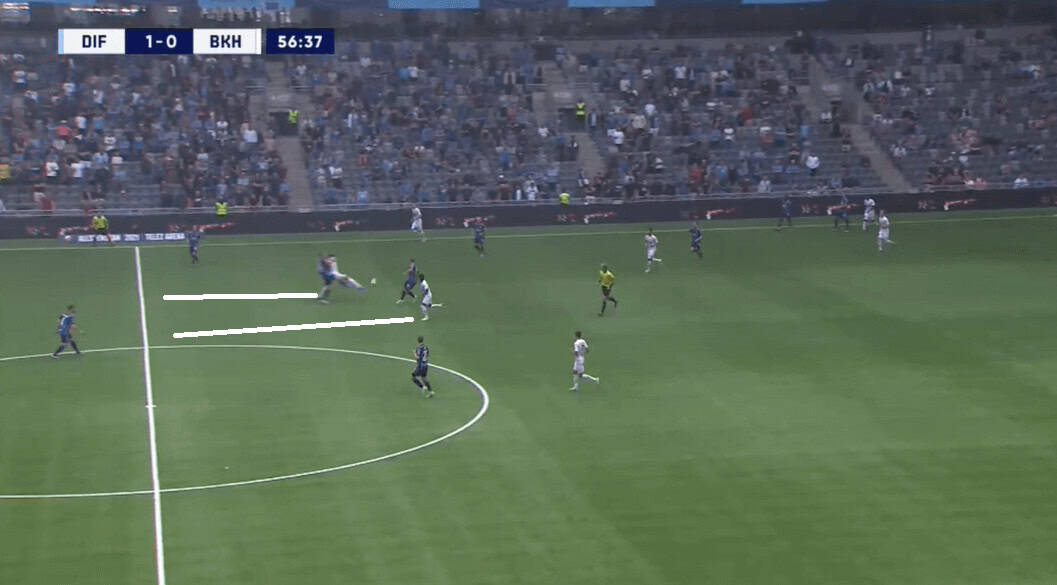 In the second half, Djurgardens made a small tactical change to take the lead. They decided to drop their forward deep into the half-spaces instead of staying wide. This is to initially pin the full-back or the centre-back and dropping deep would mean that they would be dragged from their position and open spaces behind them for the midfielder or other forwards to make runs into.
