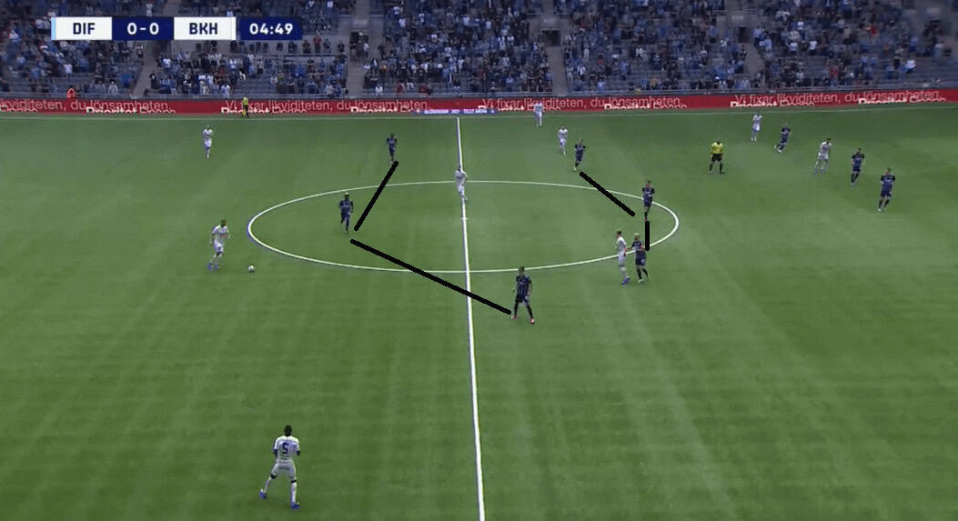 The league leaders pressed in a 4-3-3 shape which is quite rare as very few teams at the top level, like Liverpool and PSG under Tuchel, press in a 4-3-3 shape. Djurgardens were more concerned about locking the central areas of penetration and decided to provide the wide areas with space. The idea was to obviously push Hacken out wide and give them to use the less threatening zones on the pitch.