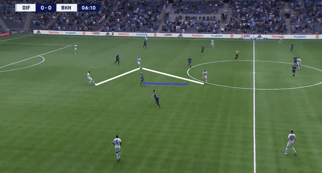 Whenever the striker dropped deep, he dragged the CB along with him and also another forward make an opposite run into the space vacated by the CB. This was executed a couple of times before it resulted in Hacken equalising. We can see an example of this in the image below.