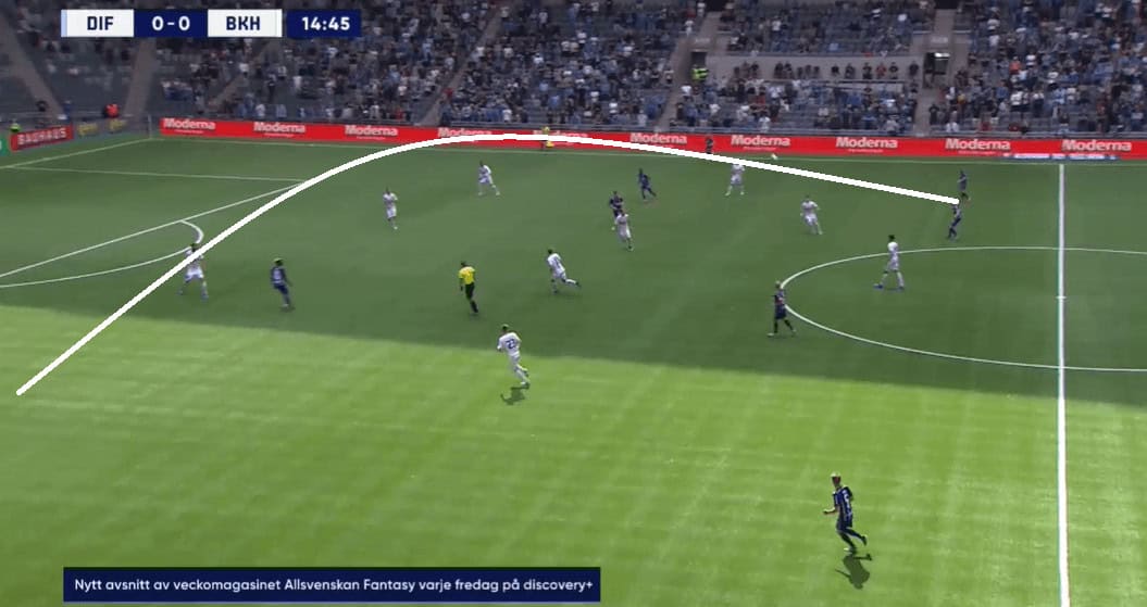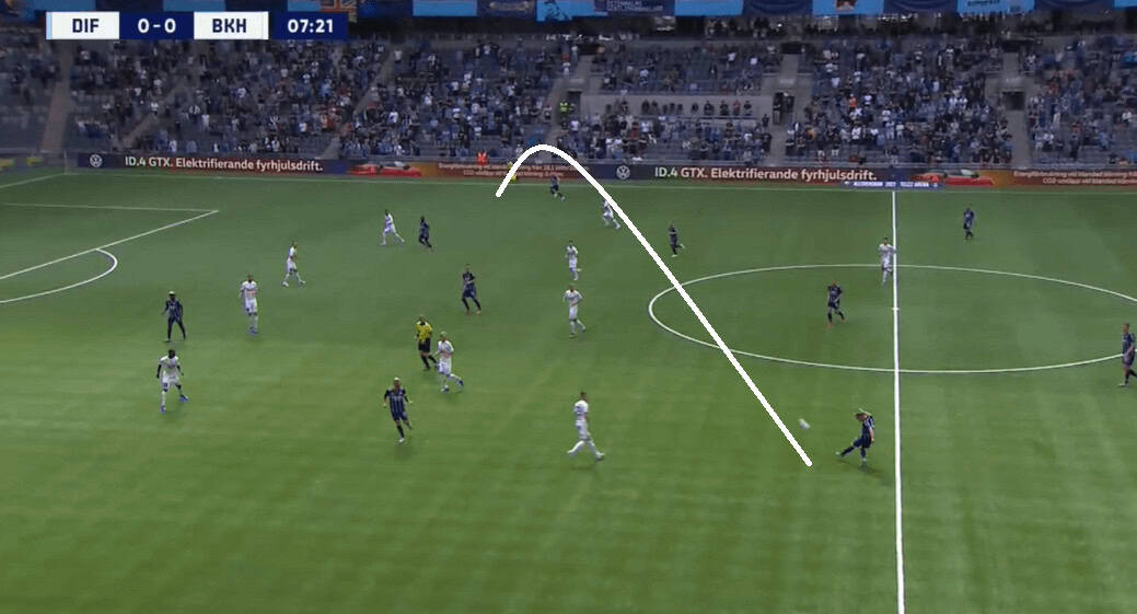 When RB tends to be higher the winger on that side would show his flexibility in positioning by staying in the interior and pinning the Hacken full-back. This means that a switch would be open to the RB and Djurgardens would make use of that to quickly shift the ball to the opposite side. The immediate switch to the other side would be enabled due to the LB dropping deep and being involved in moving the ball to the middle third. This means that again he can now naturally play a switch to the opposite flank with his body shape like in the image below.