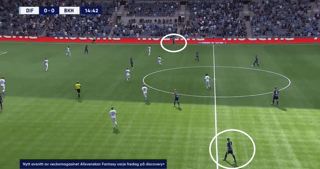 This was something that Hacken enjoyed and looked to make good use of the flaws in their strategy. They would look to start and attract Djurgardens players to one side before using an anchor to shift immediately to the underloaded side.
