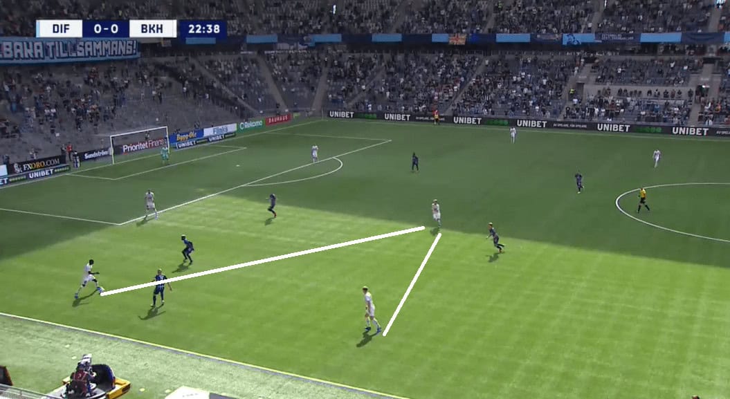 Djurgardens also did use some double spacing on the flank where they would place two wide players on the same horizontal lane on the opposite side while the full-back of Hacken on that side would be pinned to stay inside. Once the ball immediately goes to that flank the two players would combine and look to create immediate overloads against that full-back who is yet to reach either of them in time. This gives them extra time to think about who will be underlapping or overlapping like in the image below.