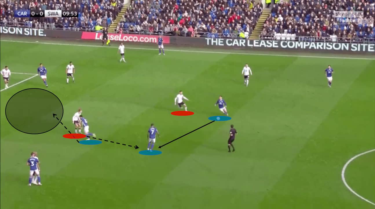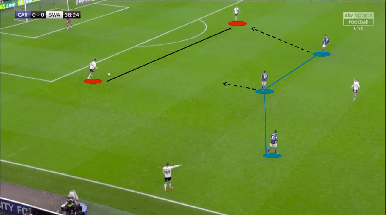 The graphic shows the space that can be created between the lines by committing the defender to the ball. Whyte’s run beyond the defensive midfielder means that defender is left with a decision to make. He either covers the zone or closes down the player in possession. As Bacuna receives the ball to feet, the space is created between the lines with four attacking players in dangerous positions. On this occasion, Bacuna was unable to thread the pass but it shown the tactics that Cardiff used to create space and beat the midfield.