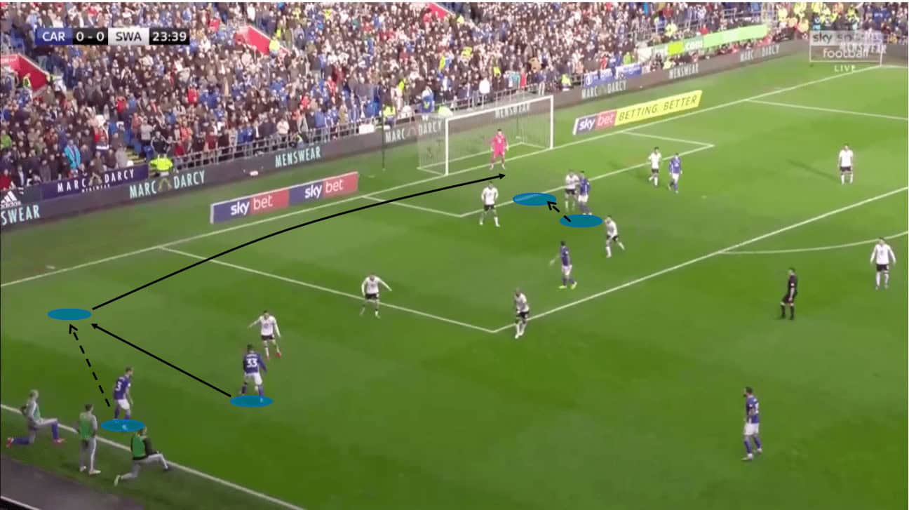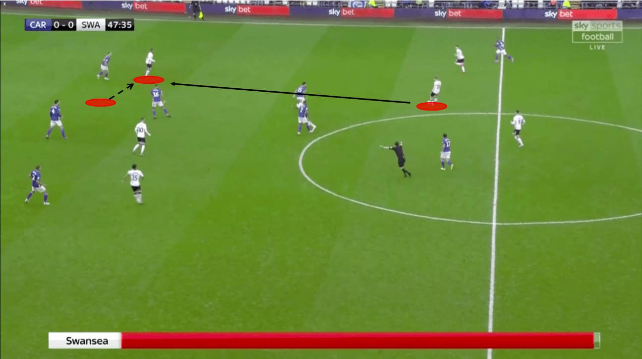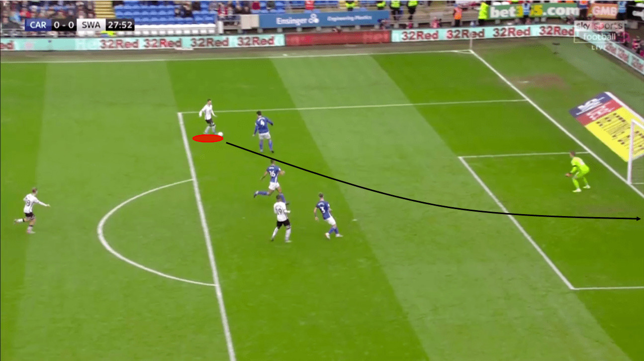 As Swansea drive towards goal, they committed numbers and had clear channels. Options were established both on the defensive line but also slightly deeper for a longer-ranged effort. As Celina drove towards goal, he opened up his chest and swept the ball onto his right foot for a driven strike that used the defender as a shield. Despite beating the keeper, Celina’s strike hit the post and rebounded back across goal. Celina’s footwork and pace were both equally impressive and provided a dangerous opportunity for the home team. It affirmed the manager’s faith in youth over experience and showed how he felt Swansea could outmanoeuvre Cardiff. With many in the crowd looking to Brewster to break the deadlock, Celina proved to be the more dangerous of the two.