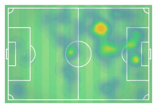 Above is his heatmap, and the most evident concentration is within the left half-space, linking with Cavaleiro. The distribution of ‘heat’ is sparse, portraying his inclination to roam and drop back.