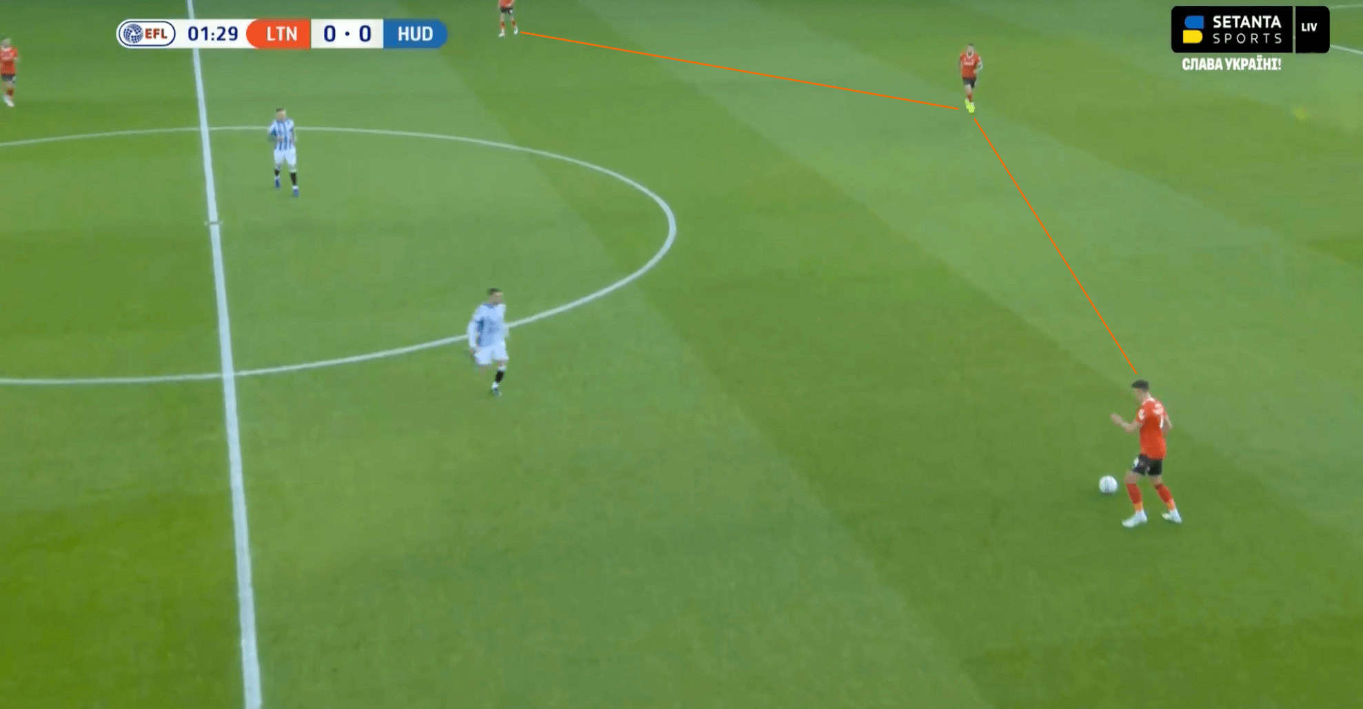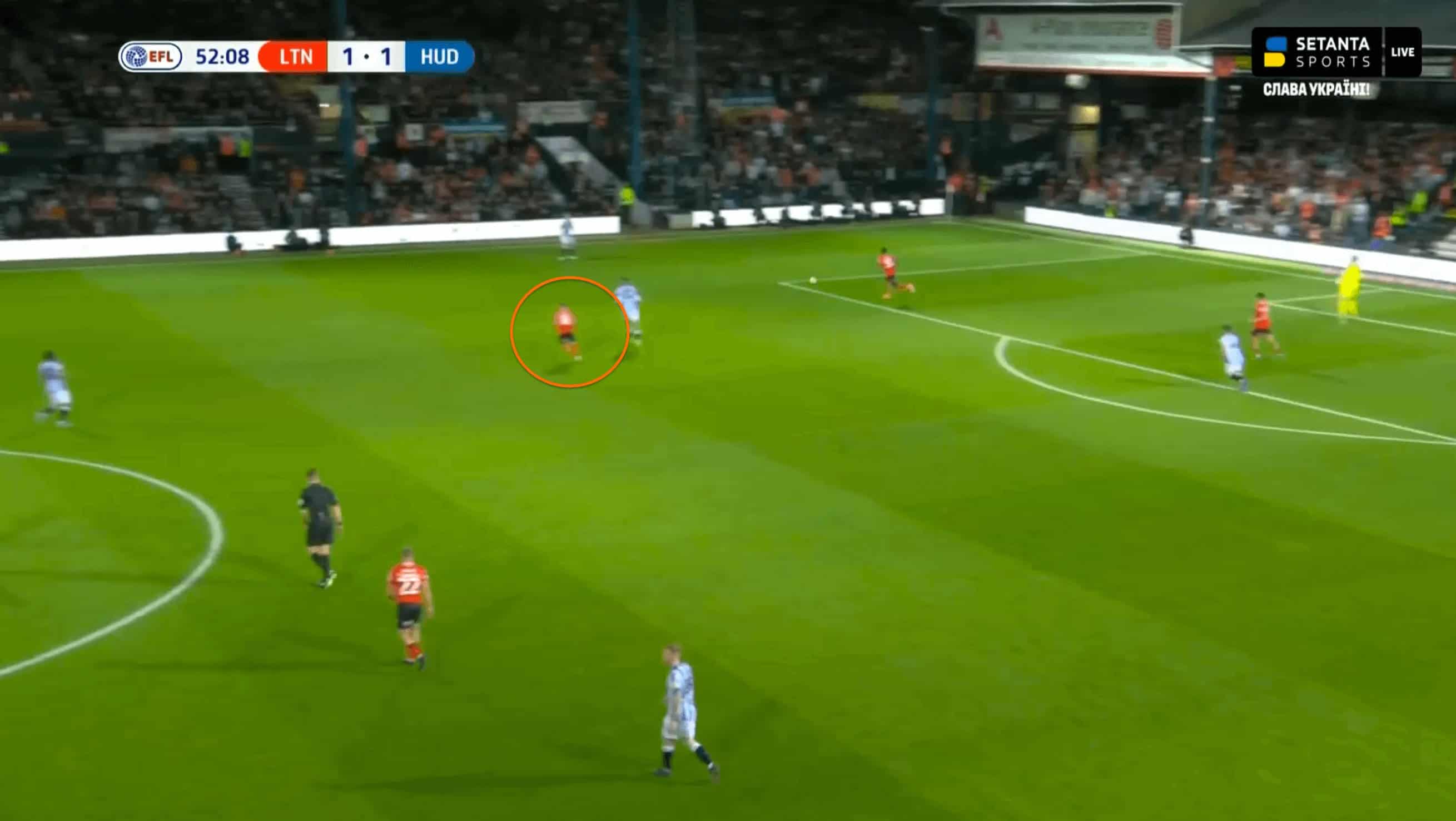 The image above was one example where they looked to exploit the line and space behind them. Luton’s forwards and midfielders looked to make diagonal runs across the pitch and look to run in behind the Huddersfield defence where Cornick in the image above does that to receive a pass from his teammate.