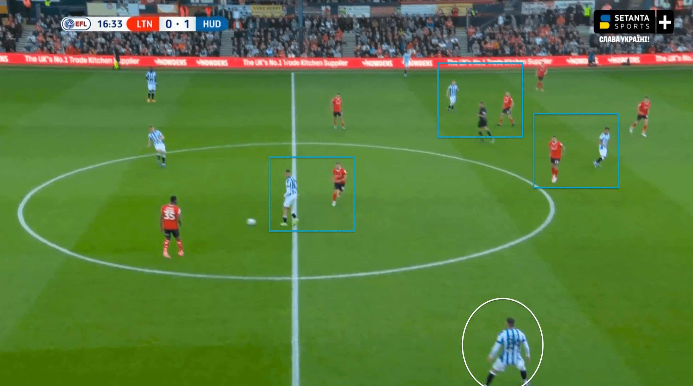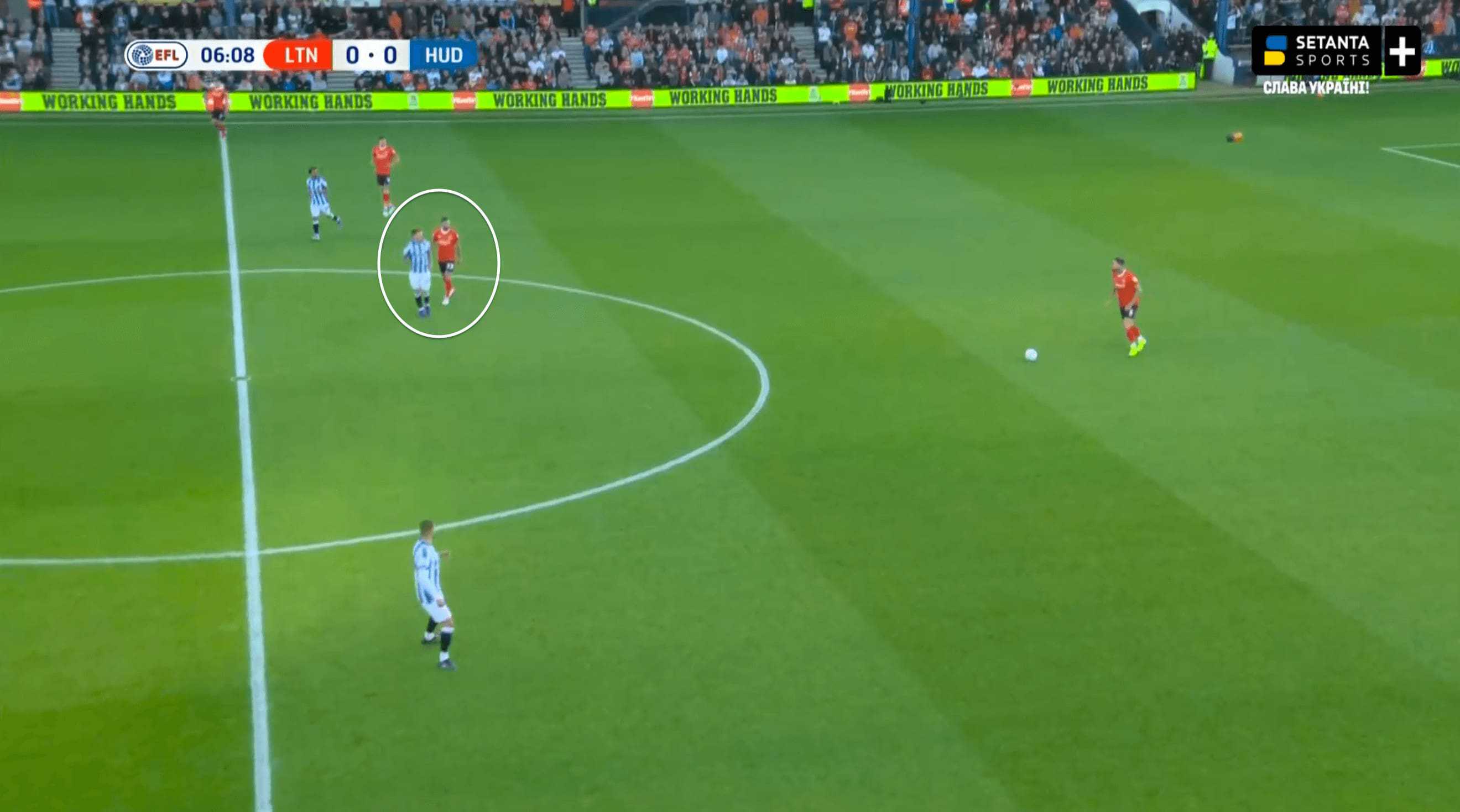 In this game, Huddersfield went with a 3-4-3 formation that was lopsided without possession whereas Luton Town went with a 3-5-2 system that slightly varied into a 3-4-1-2 without possession during moments in the game. Both wanted to have a defensive line of five players and also an attacking line of players which can be seen in the image below where five Luton attacking players are being defended by the five Huddersfield players.