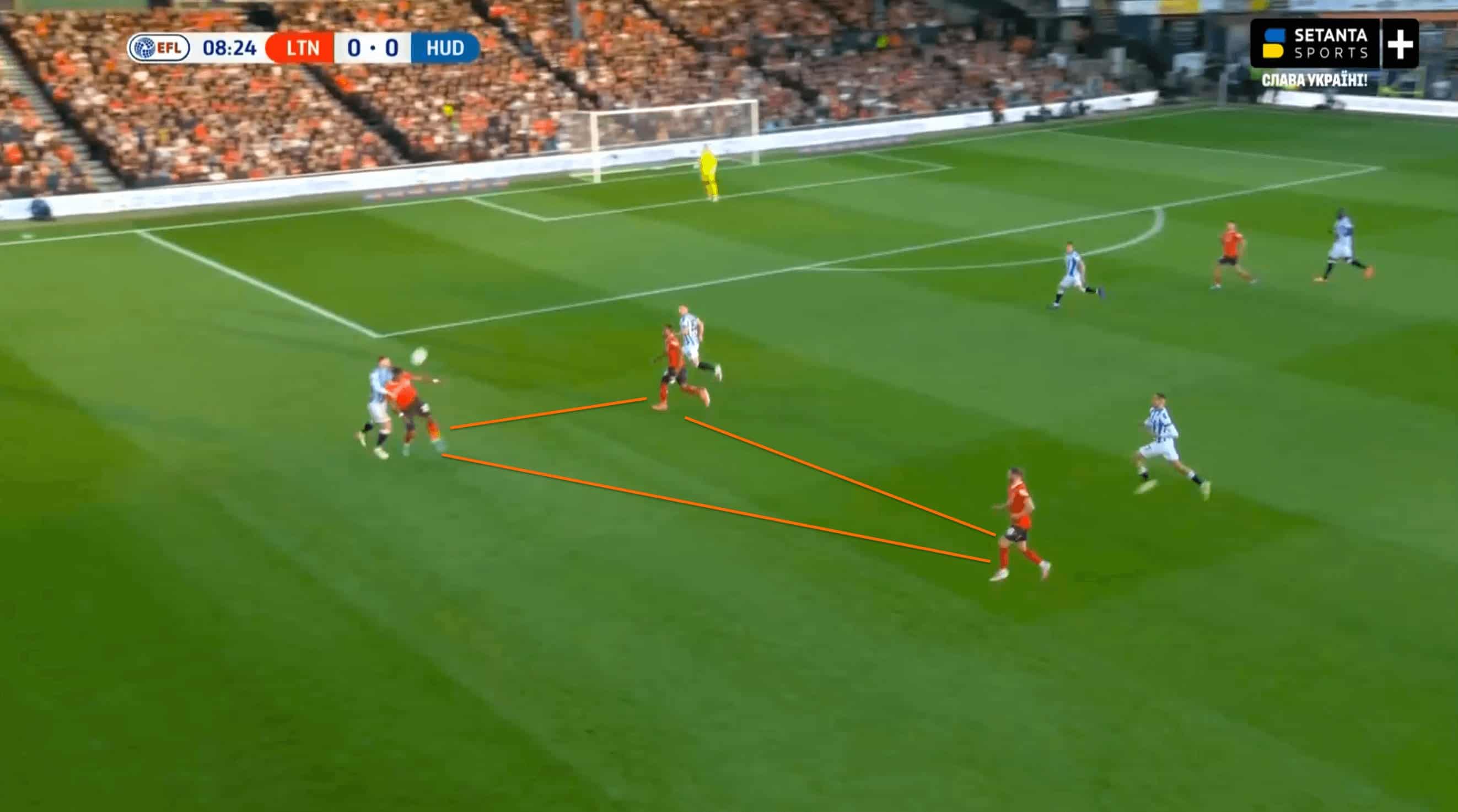 Luton also had some neat interchanges between their players and looked to form triangles around the pitch. We can see how a triangle has been formed with the wing-back, forward and the central midfielder as they look to interchange. All of them are very good in the air and share some very similar traits allowing them to interchange seamlessly.