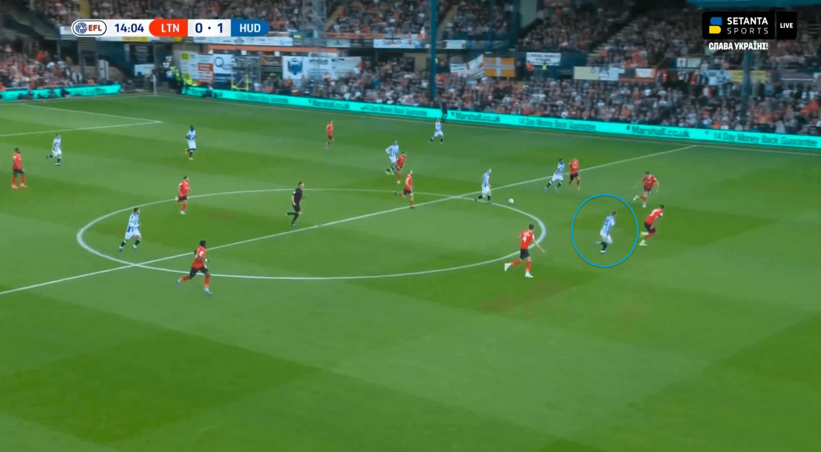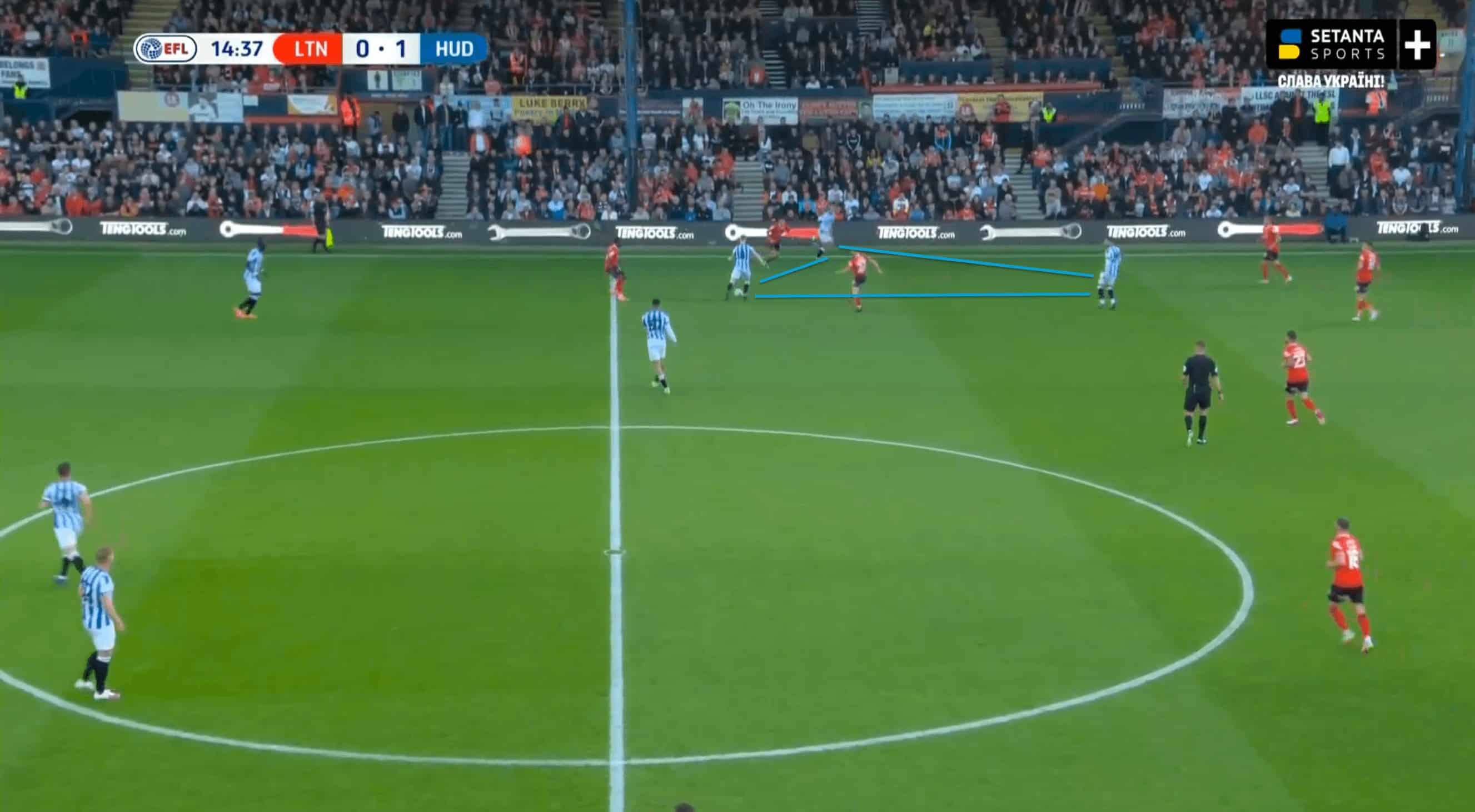 We can see in the image above how an extra man in the midfield in the form of the winger dropping deep has helped Huddersfield to move the ball upfield. All the other three Luton Town midfielders are closely marking the other Huddersfield players and when Sinani dropped deep, he is able to receive the ball from the centre centre-back who we mentioned was already free in the build-up phase.