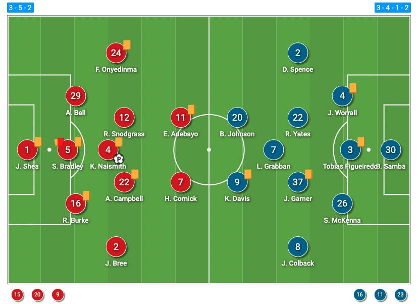Luton Town made use of a 3-1-4-2 formation. James Shea started in goa, with Reece Burke, Sonny Bradley and Amarii Bell within the back three. The wing-back roles were occupied by Fred Onyedinma and James Bree. In midfield, Kal Naismith, Allan Campbell, and former Premier League player Robert Snodgrass. Harry Cornick and Elijah Adebayo lead the line regarding Luton’s attack.