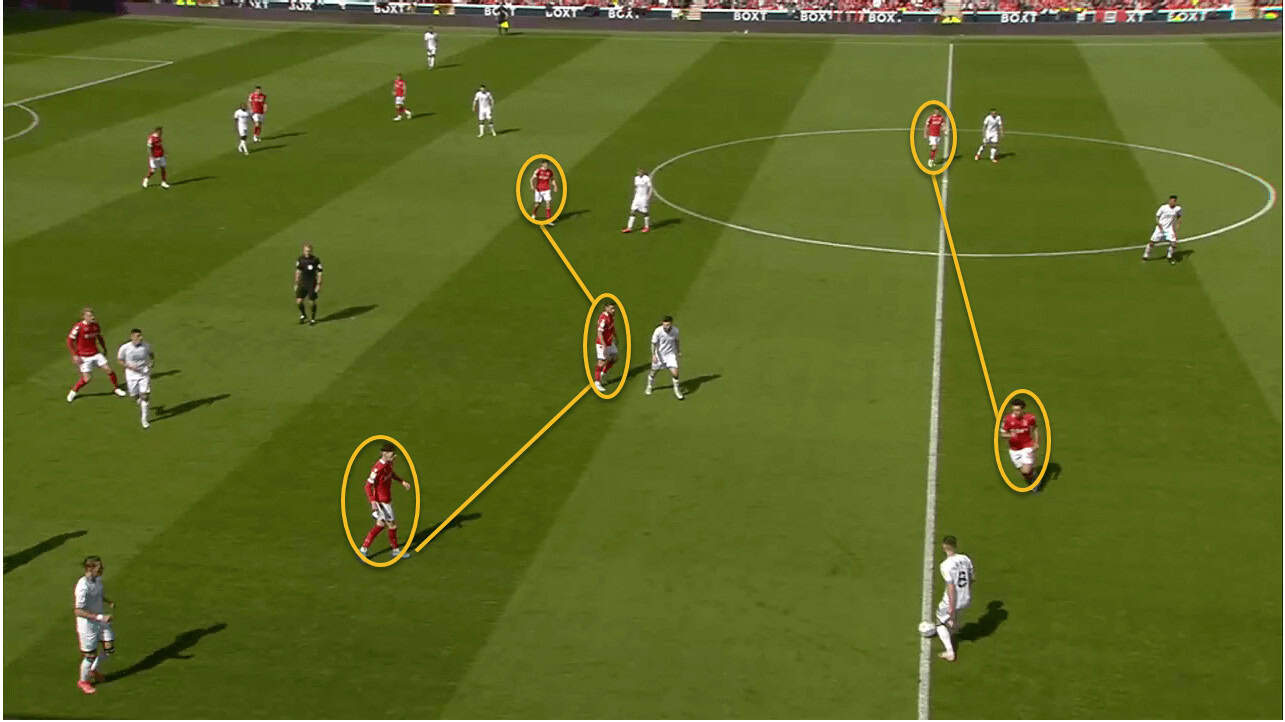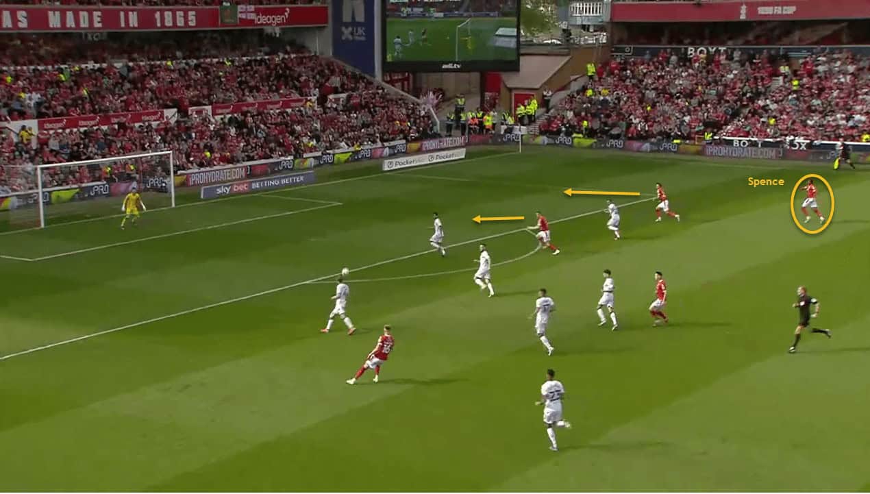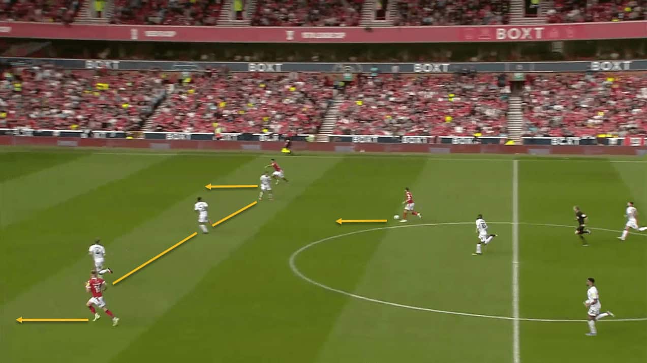 Once Forest wins the ball back, James Garner breaks, putting Forest in a 3v3 counter-attack.