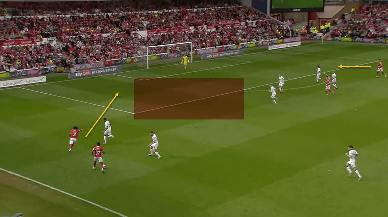 However, when Forest won the ball back on the edge of the penalty area, they were able to counter-attack with a 4v2 against Swansea’s centre-backs.