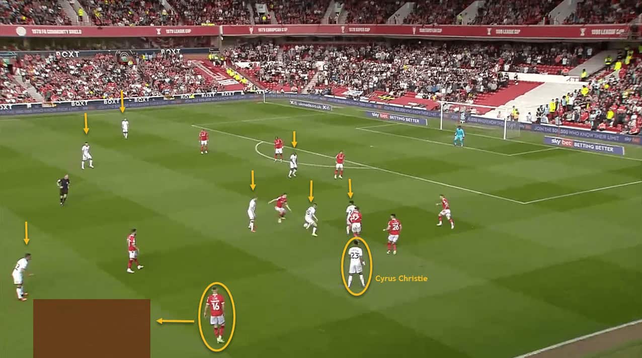 As you can see in this image, this passage of play starts with Swansea holding possession on the left-hand side of Forest’s penalty area.