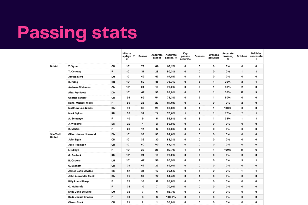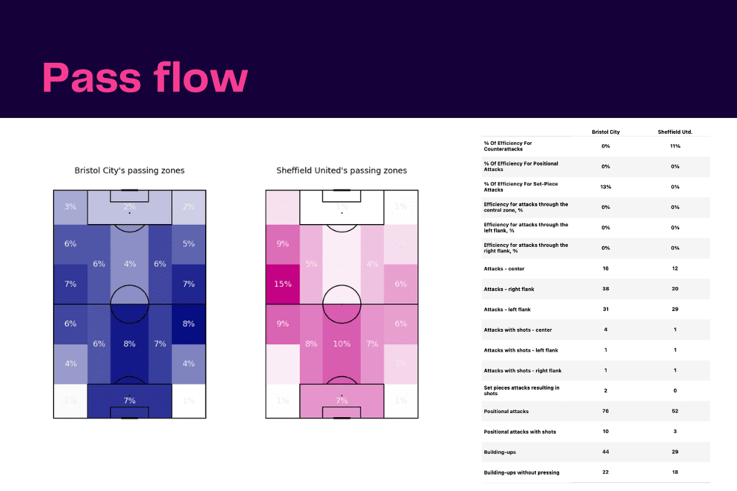 Tuesday night saw <a href="https://totalfootballanalysis.com/article/efl-championship-2022-23-why-iliman-ndiaye-is-sheffield-uniteds-best-performer-so-far">Bristol City vs Sheffield United</a> in the <a href="https://totalfootballanalysis.com/category/competitions/efl-championship">EFL Championship</a>. We've broken down all the key <a href="https://totalfootballanalysis.com/match-analysis/free-download-premier-league-gw8-analytics-reports-data-viz-and-stats">stats</a> for you to digest in this tactical analysis and provide <a href="https://totalfootballanalysis.com/player-analysis/but-what-does-that-visual-actually-tell-us">insights</a> around; * shot maps * pass flow * heatmaps * defensive actions * average positions and much more! We also try to answer some questions for you with the visuals; Who was <a href="https://totalfootballanalysis.com/match-analysis/efl-championship-202223-sheffield-united-vs-norwich-city-tactical-analysis-tactics">Sheffield United's</a> biggest threat? Who made the most recoveries in the opposition half? Who had the highest xG in the match? To navigate the stats gallery simply click on the numbers to move through the pages. <a href="https://totalfootballanalysis.com/wp-content/uploads/2022/11/2-11.png"><img class="aligncenter size-large wp-image-350496" src="https://totalfootballanalysis.com/wp-content/uploads/2022/11/2-11-1024x683.png" alt="EFL Championship 2022/23: Bristol City vs Sheffield United - data viz, stats and insights" width="640" height="427" /></a> <a href="https://totalfootballanalysis.com/wp-content/uploads/2022/11/3-12.png"><img class="aligncenter size-large wp-image-350497" src="https://totalfootballanalysis.com/wp-content/uploads/2022/11/3-12-1024x683.png" alt="EFL Championship 2022/23: Bristol City vs Sheffield United - data viz, stats and insights" width="640" height="427" /></a> <a href="https://totalfootballanalysis.com/wp-content/uploads/2022/11/4-11.png"><img class="aligncenter size-large wp-image-350498" src="https://totalfootballanalysis.com/wp-content/uploads/2022/11/4-11-1024x683.png" alt="EFL Championship 2022/23: Bristol City vs Sheffield United - data viz, stats and insights" width="640" height="427" /></a> <a href="https://totalfootballanalysis.com/wp-content/uploads/2022/11/5-11.png"><img class="aligncenter size-large wp-image-350499" src="https://totalfootballanalysis.com/wp-content/uploads/2022/11/5-11-1024x683.png" alt="EFL Championship 2022/23: Bristol City vs Sheffield United - data viz, stats and insights" width="640" height="427" /></a><!--nextpage--> <a href="https://totalfootballanalysis.com/wp-content/uploads/2022/11/6-11.png"><img class="aligncenter size-large wp-image-350500" src="https://totalfootballanalysis.com/wp-content/uploads/2022/11/6-11-1024x683.png" alt="EFL Championship 2022/23: Bristol City vs Sheffield United - data viz, stats and insights" width="640" height="427" /></a> <a href="https://totalfootballanalysis.com/wp-content/uploads/2022/11/7-11.png"><img class="aligncenter size-large wp-image-350501" src="https://totalfootballanalysis.com/wp-content/uploads/2022/11/7-11-1024x683.png" alt="EFL Championship 2022/23: Bristol City vs Sheffield United - data viz, stats and insights" width="640" height="427" /></a><!--nextpage--> <a href="https://totalfootballanalysis.com/wp-content/uploads/2022/11/8-11.png"><img class="aligncenter size-large wp-image-350502" src="https://totalfootballanalysis.com/wp-content/uploads/2022/11/8-11-1024x683.png" alt="EFL Championship 2022/23: Bristol City vs Sheffield United - data viz, stats and insights" width="640" height="427" /></a> <a href="https://totalfootballanalysis.com/wp-content/uploads/2022/11/9-11.png"><img class="aligncenter size-large wp-image-350503" src="https://totalfootballanalysis.com/wp-content/uploads/2022/11/9-11-1024x683.png" alt="EFL Championship 2022/23: Bristol City vs Sheffield United - data viz, stats and insights" width="640" height="427" /></a> <a href="https://totalfootballanalysis.com/wp-content/uploads/2022/11/10-11.png"><img class="aligncenter size-large wp-image-350504" src="https://totalfootballanalysis.com/wp-content/uploads/2022/11/10-11-1024x683.png" alt="EFL Championship 2022/23: Bristol City vs Sheffield United - data viz, stats and insights" width="640" height="427" /></a><!--nextpage--> <a href="https://totalfootballanalysis.com/wp-content/uploads/2022/11/11-11.png"><img class="aligncenter size-large wp-image-350505" src="https://totalfootballanalysis.com/wp-content/uploads/2022/11/11-11-1024x683.png" alt="EFL Championship 2022/23: Bristol City vs Sheffield United - data viz, stats and insights" width="640" height="427" /></a> <a href="https://totalfootballanalysis.com/wp-content/uploads/2022/11/12-11.png"><img class="aligncenter size-large wp-image-350506" src="https://totalfootballanalysis.com/wp-content/uploads/2022/11/12-11-1024x683.png" alt="EFL Championship 2022/23: Bristol City vs Sheffield United - data viz, stats and insights" width="640" height="427" /></a><!--nextpage--> <a href="https://totalfootballanalysis.com/wp-content/uploads/2022/11/13-10.png"><img class="aligncenter size-large wp-image-350507" src="https://totalfootballanalysis.com/wp-content/uploads/2022/11/13-10-1024x683.png" alt="EFL Championship 2022/23: Bristol City vs Sheffield United - data viz, stats and insights" width="640" height="427" /></a>