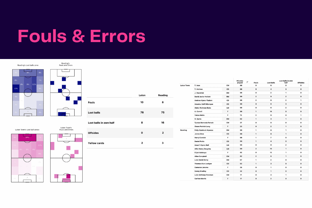 Tuesday night saw <a href="https://totalfootballanalysis.com/team-analysis/reading-202223-their-tactics-under-paul-ince-scout-report-tactical-analysis-tactics">Luton Town vs Reading</a> in the <a href="https://totalfootballanalysis.com/category/competitions/efl-championship">EFL Championship</a>. We've broken down all the key <a href="https://totalfootballanalysis.com/match-analysis/free-download-premier-league-gw8-analytics-reports-data-viz-and-stats">stats</a> for you to digest in this tactical analysis and provide <a href="https://totalfootballanalysis.com/player-analysis/but-what-does-that-visual-actually-tell-us">insights</a> around; * shot maps * pass flow * heatmaps * defensive actions * average positions and much more! We also try to answer some questions for you with the visuals; Who was <a href="https://totalfootballanalysis.com/match-analysis/efl-championship-2022-23-reading-vs-blackburn-data-viz-stats-and-insights">Reading's</a> biggest threat? Who made the most recoveries in the opposition half? Who had the highest xG in the match? To navigate the stats gallery simply click on the numbers to move through the pages. <a href="https://totalfootballanalysis.com/wp-content/uploads/2022/11/2-12.png"><img class="aligncenter size-large wp-image-350527" src="https://totalfootballanalysis.com/wp-content/uploads/2022/11/2-12-1024x683.png" alt="EFL Championship 2022/23: Luton Town vs Reading - data viz, stats and insights" width="640" height="427" /></a> <a href="https://totalfootballanalysis.com/wp-content/uploads/2022/11/3-13.png"><img class="aligncenter size-large wp-image-350528" src="https://totalfootballanalysis.com/wp-content/uploads/2022/11/3-13-1024x683.png" alt="EFL Championship 2022/23: Luton Town vs Reading - data viz, stats and insights" width="640" height="427" /></a> <a href="https://totalfootballanalysis.com/wp-content/uploads/2022/11/4-12.png"><img class="aligncenter size-large wp-image-350529" src="https://totalfootballanalysis.com/wp-content/uploads/2022/11/4-12-1024x683.png" alt="EFL Championship 2022/23: Luton Town vs Reading - data viz, stats and insights" width="640" height="427" /></a> <a href="https://totalfootballanalysis.com/wp-content/uploads/2022/11/5-12.png"><img class="aligncenter size-large wp-image-350530" src="https://totalfootballanalysis.com/wp-content/uploads/2022/11/5-12-1024x683.png" alt="EFL Championship 2022/23: Luton Town vs Reading - data viz, stats and insights" width="640" height="427" /></a><!--nextpage--> <a href="https://totalfootballanalysis.com/wp-content/uploads/2022/11/6-12.png"><img class="aligncenter size-large wp-image-350531" src="https://totalfootballanalysis.com/wp-content/uploads/2022/11/6-12-1024x683.png" alt="EFL Championship 2022/23: Luton Town vs Reading - data viz, stats and insights" width="640" height="427" /></a> <a href="https://totalfootballanalysis.com/wp-content/uploads/2022/11/7-12.png"><img class="aligncenter size-large wp-image-350532" src="https://totalfootballanalysis.com/wp-content/uploads/2022/11/7-12-1024x683.png" alt="EFL Championship 2022/23: Luton Town vs Reading - data viz, stats and insights" width="640" height="427" /></a><!--nextpage--> <a href="https://totalfootballanalysis.com/wp-content/uploads/2022/11/8-12.png"><img class="aligncenter size-large wp-image-350533" src="https://totalfootballanalysis.com/wp-content/uploads/2022/11/8-12-1024x683.png" alt="EFL Championship 2022/23: Luton Town vs Reading - data viz, stats and insights" width="640" height="427" /></a> <a href="https://totalfootballanalysis.com/wp-content/uploads/2022/11/9-12.png"><img class="aligncenter size-large wp-image-350534" src="https://totalfootballanalysis.com/wp-content/uploads/2022/11/9-12-1024x683.png" alt="EFL Championship 2022/23: Luton Town vs Reading - data viz, stats and insights" width="640" height="427" /></a> <a href="https://totalfootballanalysis.com/wp-content/uploads/2022/11/10-12.png"><img class="aligncenter size-large wp-image-350535" src="https://totalfootballanalysis.com/wp-content/uploads/2022/11/10-12-1024x683.png" alt="EFL Championship 2022/23: Luton Town vs Reading - data viz, stats and insights" width="640" height="427" /></a><!--nextpage--> <a href="https://totalfootballanalysis.com/wp-content/uploads/2022/11/11-12.png"><img class="aligncenter size-large wp-image-350536" src="https://totalfootballanalysis.com/wp-content/uploads/2022/11/11-12-1024x683.png" alt="EFL Championship 2022/23: Luton Town vs Reading - data viz, stats and insights" width="640" height="427" /></a> <a href="https://totalfootballanalysis.com/wp-content/uploads/2022/11/12-12.png"><img class="aligncenter size-large wp-image-350537" src="https://totalfootballanalysis.com/wp-content/uploads/2022/11/12-12-1024x683.png" alt="EFL Championship 2022/23: Luton Town vs Reading - data viz, stats and insights" width="640" height="427" /></a><!--nextpage--> <a href="https://totalfootballanalysis.com/wp-content/uploads/2022/11/13-11.png"><img class="aligncenter size-large wp-image-350538" src="https://totalfootballanalysis.com/wp-content/uploads/2022/11/13-11-1024x683.png" alt="EFL Championship 2022/23: Luton Town vs Reading - data viz, stats and insights" width="640" height="427" /></a>