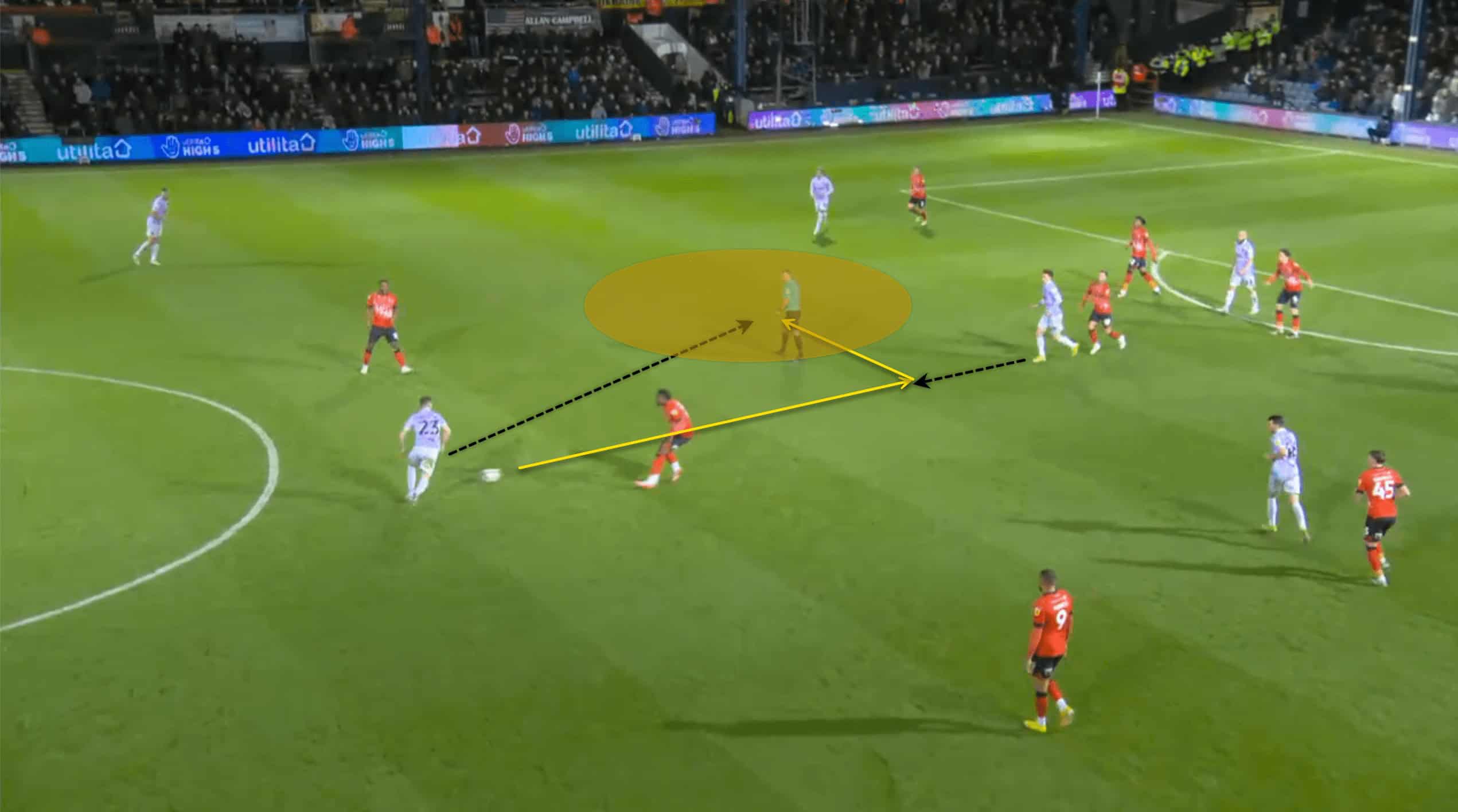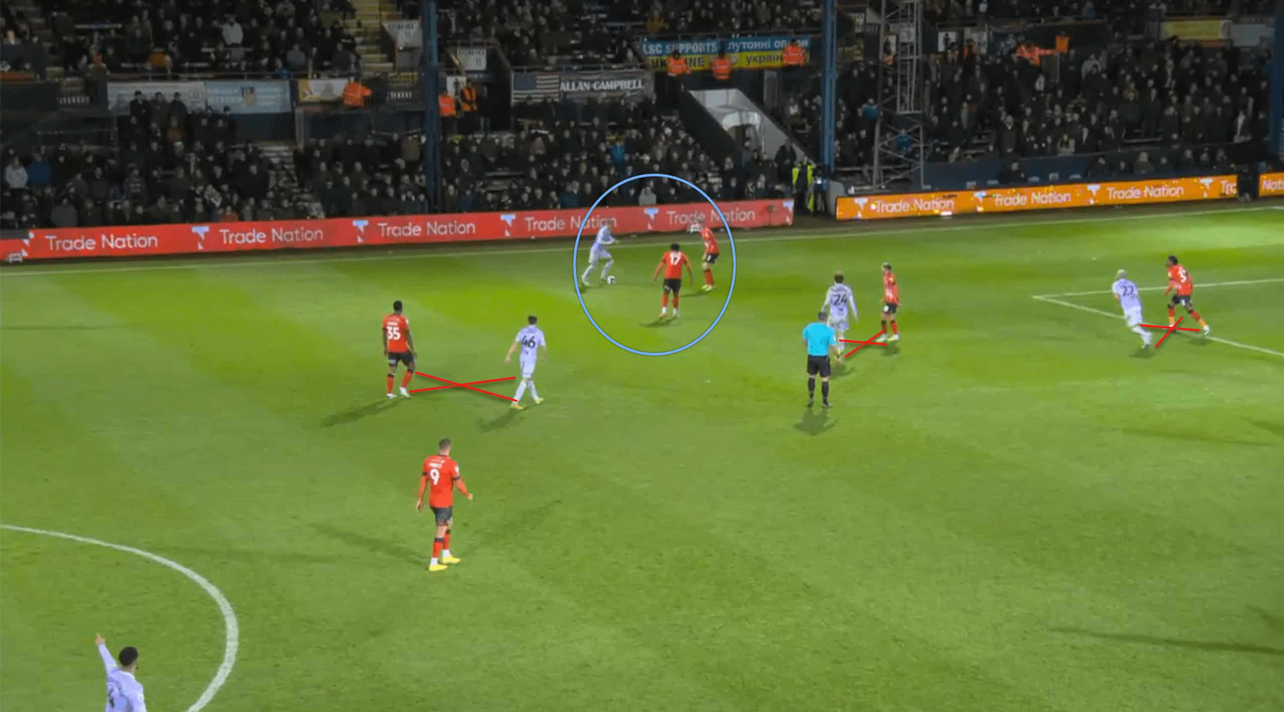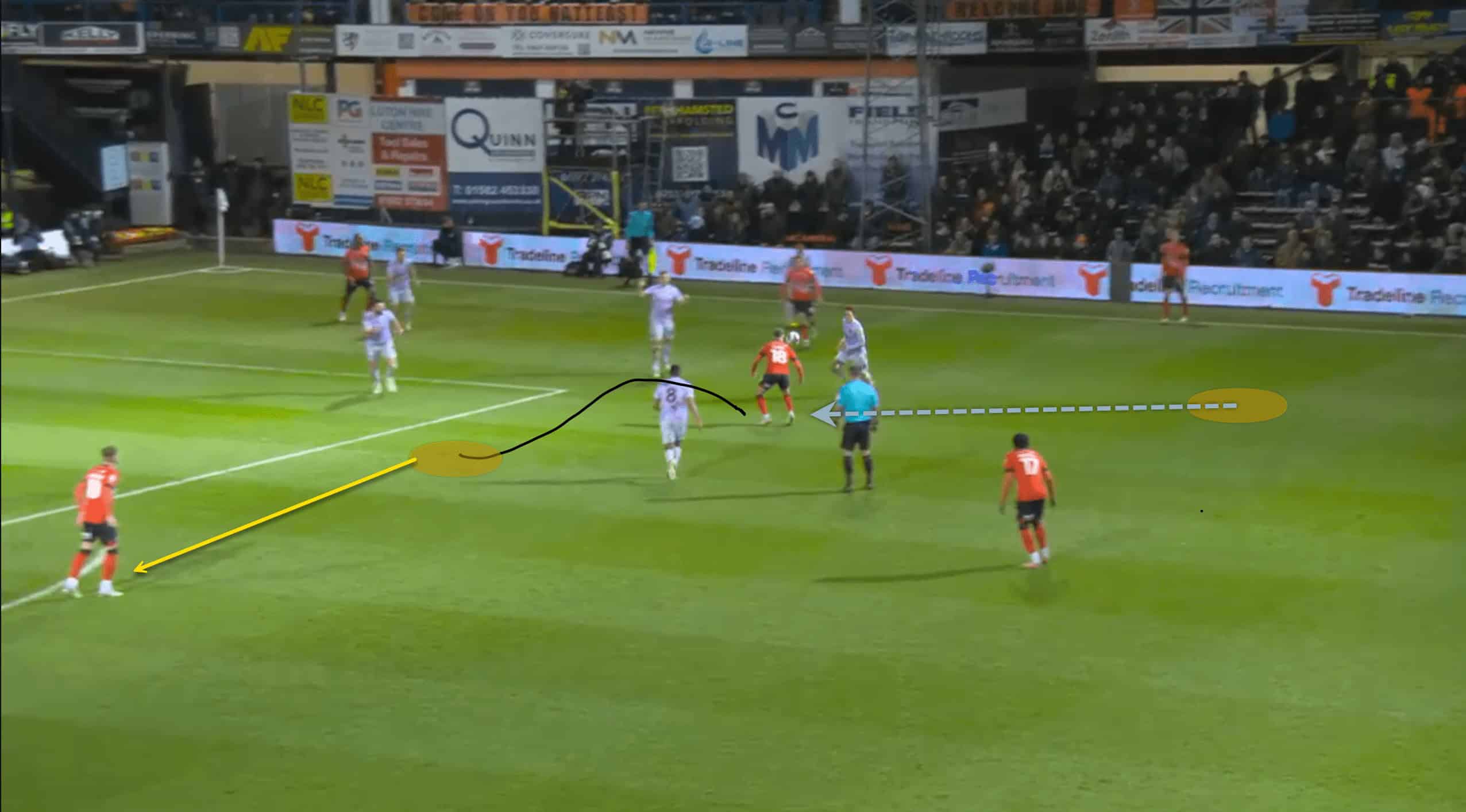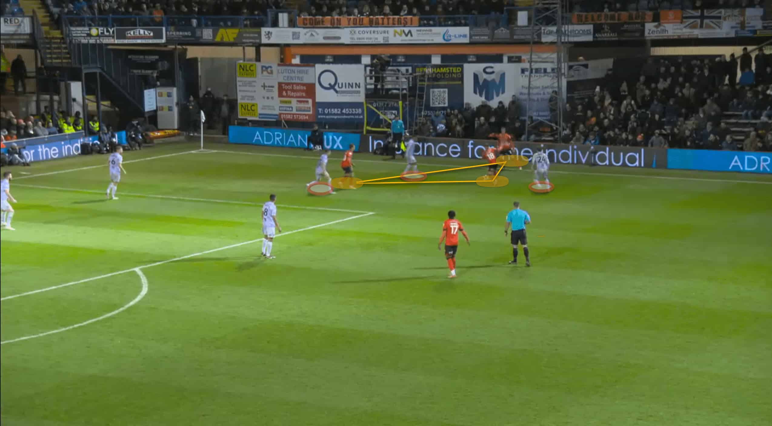 Following the red card, Luton was able to operate in tight areas and execute fast passes to escape the situation. This allowed their morale to remain high and produce as much as possible. The above and below pictures resemble how confident Luton was with the ball at their feet even though the space was minimal to an extent.