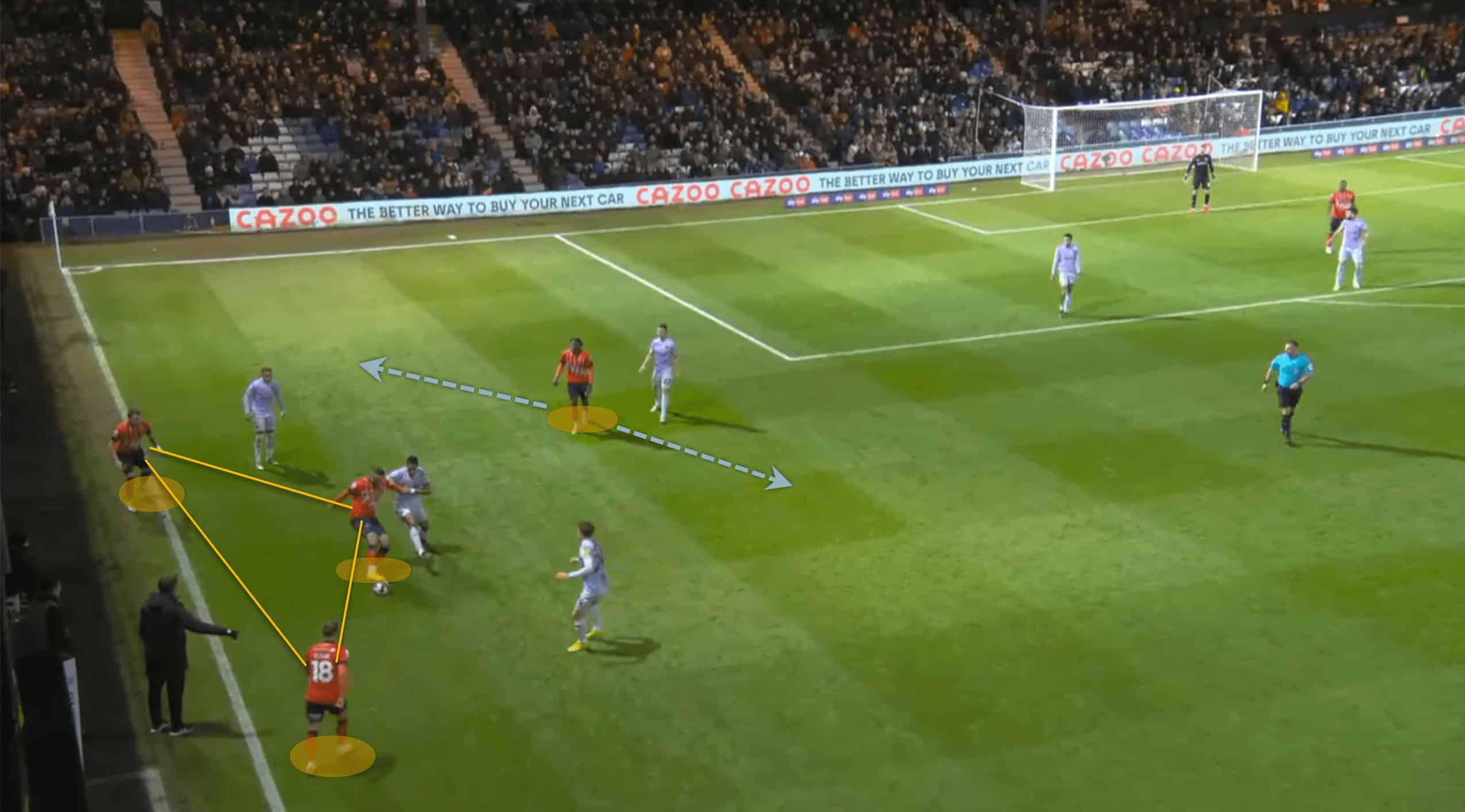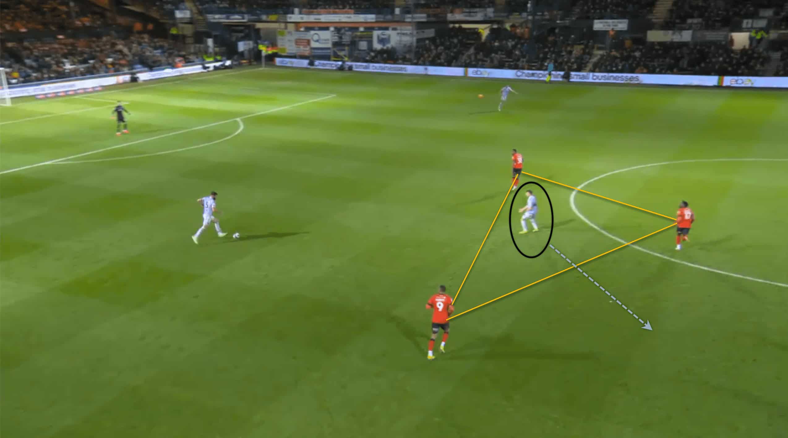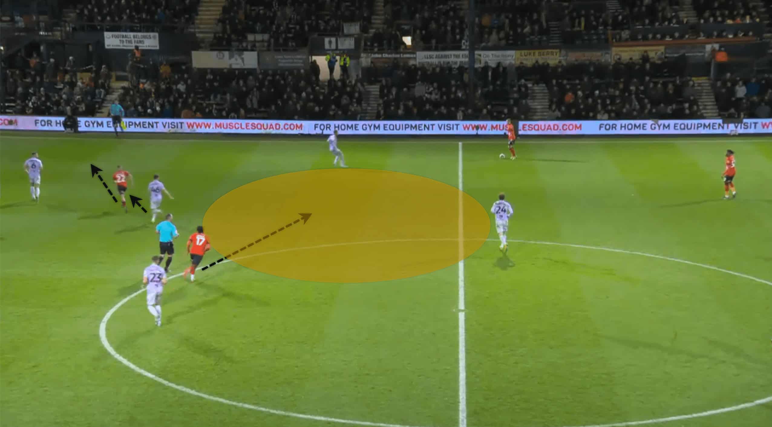 Following the red card, Luton was able to operate in tight areas and execute fast passes to escape the situation. This allowed their morale to remain high and produce as much as possible. The above and below pictures resemble how confident Luton was with the ball at their feet even though the space was minimal to an extent.