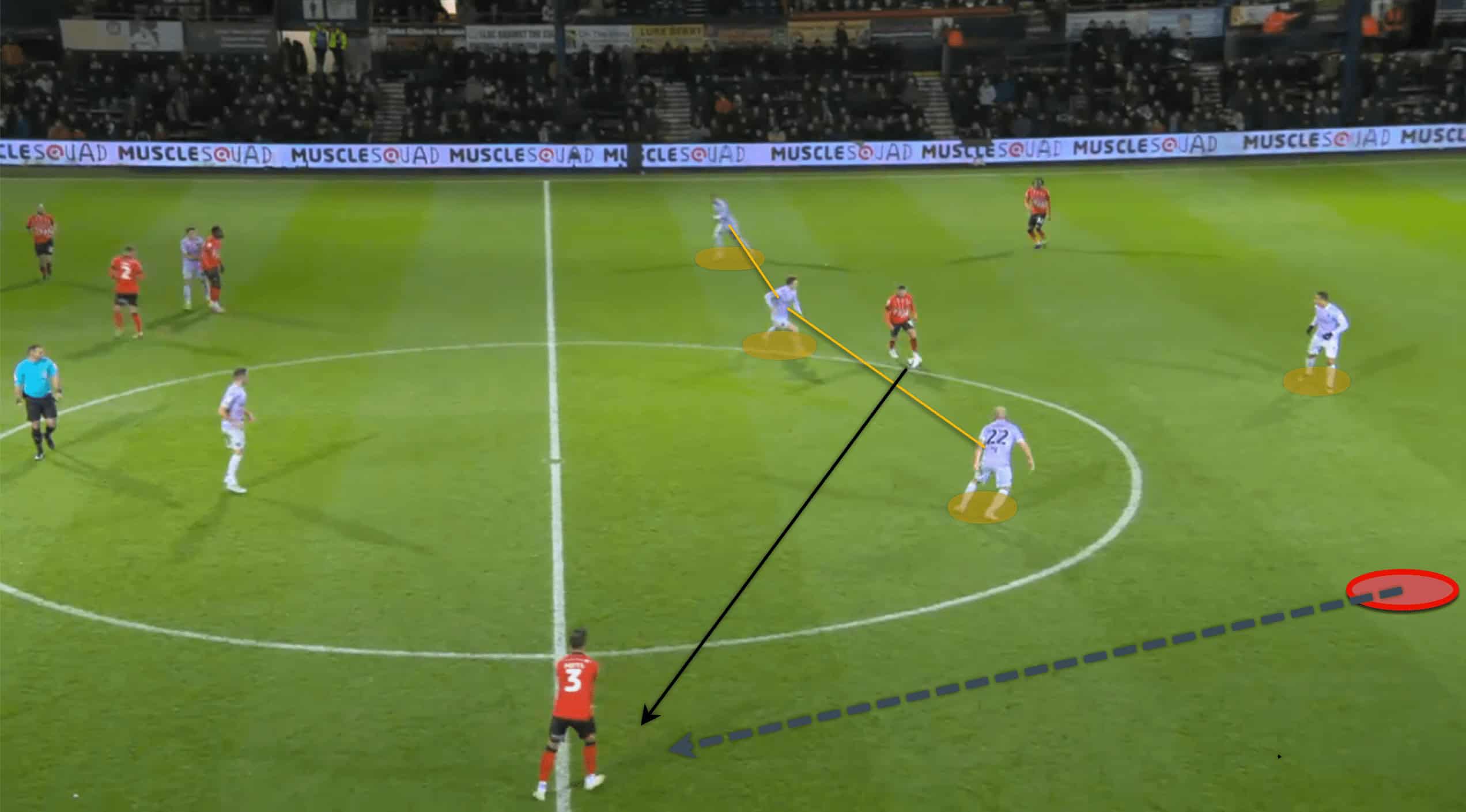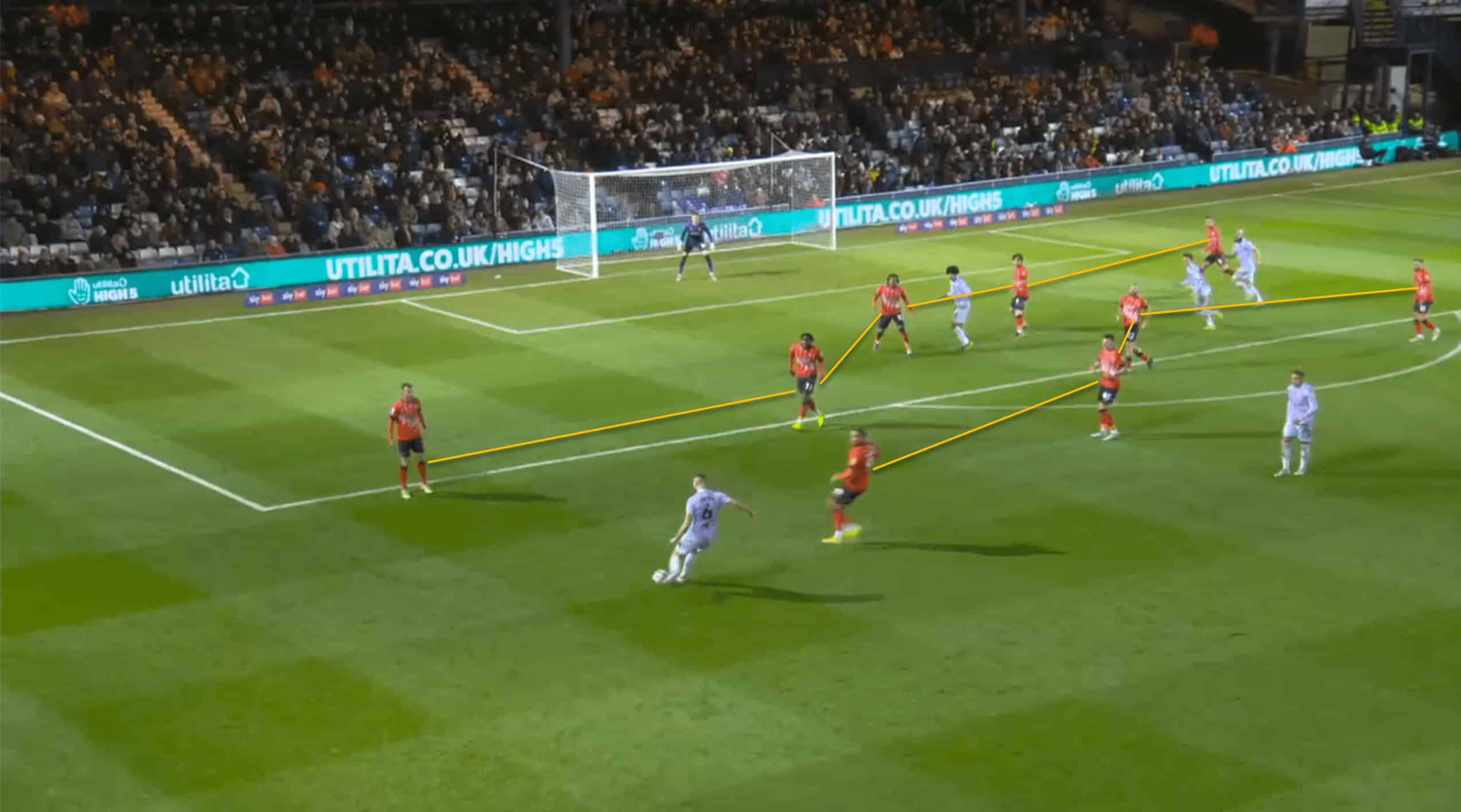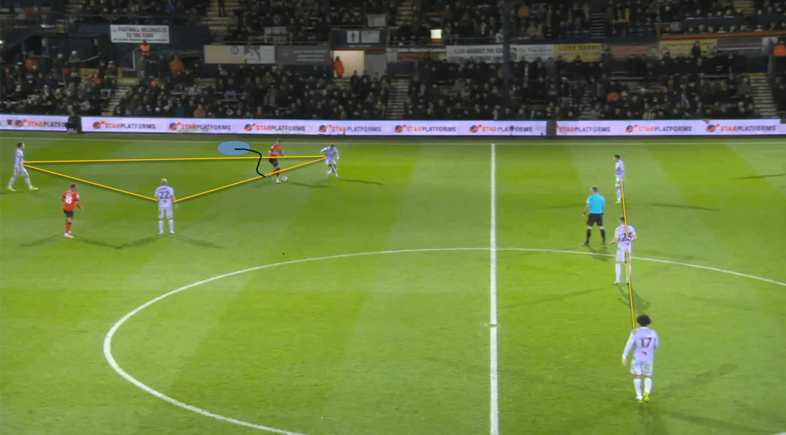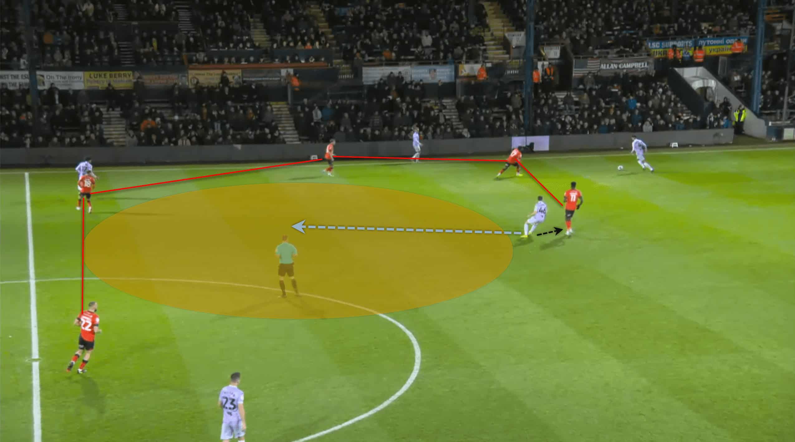 Following the red card, Luton was able to operate in tight areas and execute fast passes to escape the situation. This allowed their morale to remain high and produce as much as possible. The above and below pictures resemble how confident Luton was with the ball at their feet even though the space was minimal to an extent.