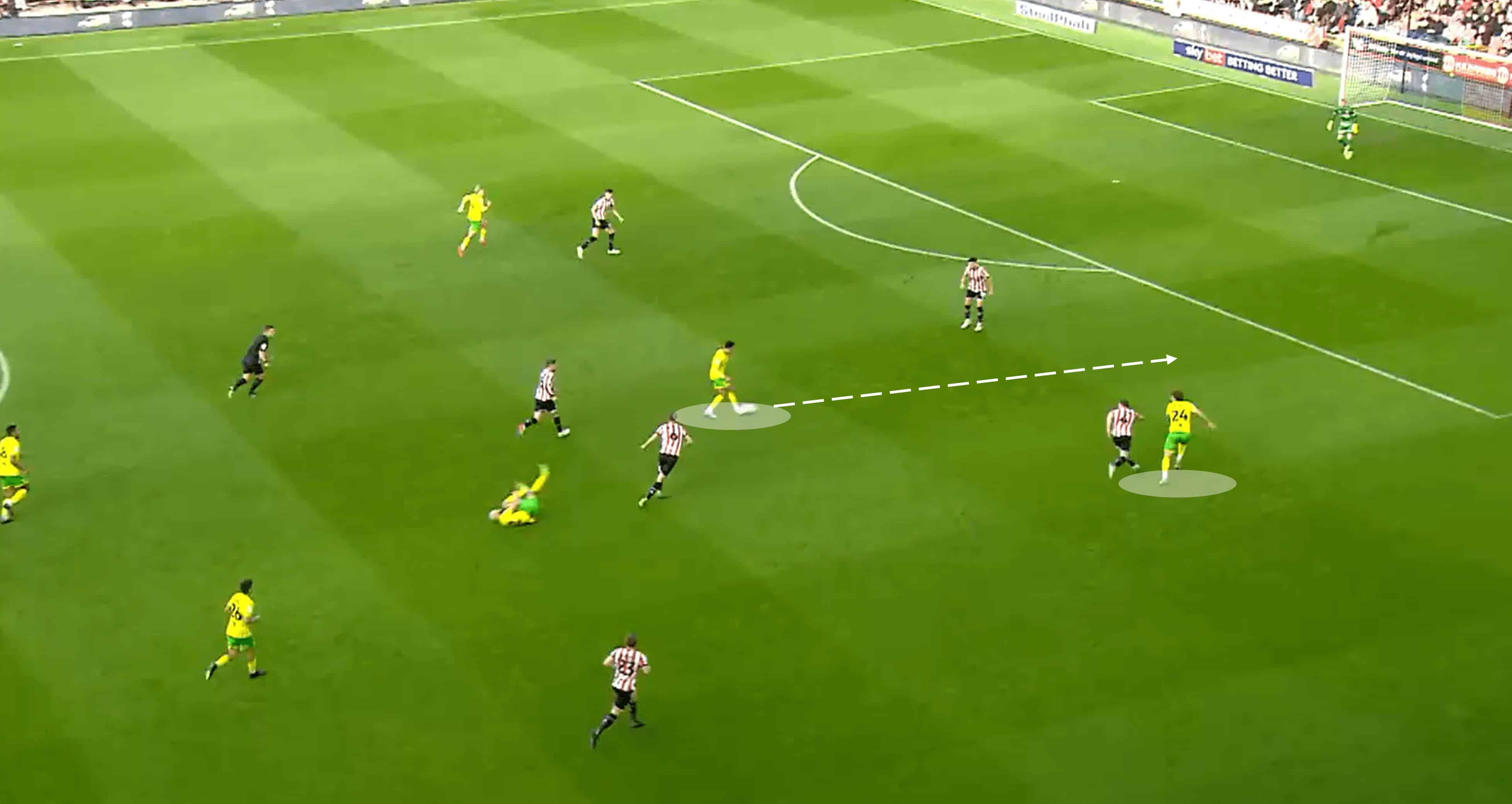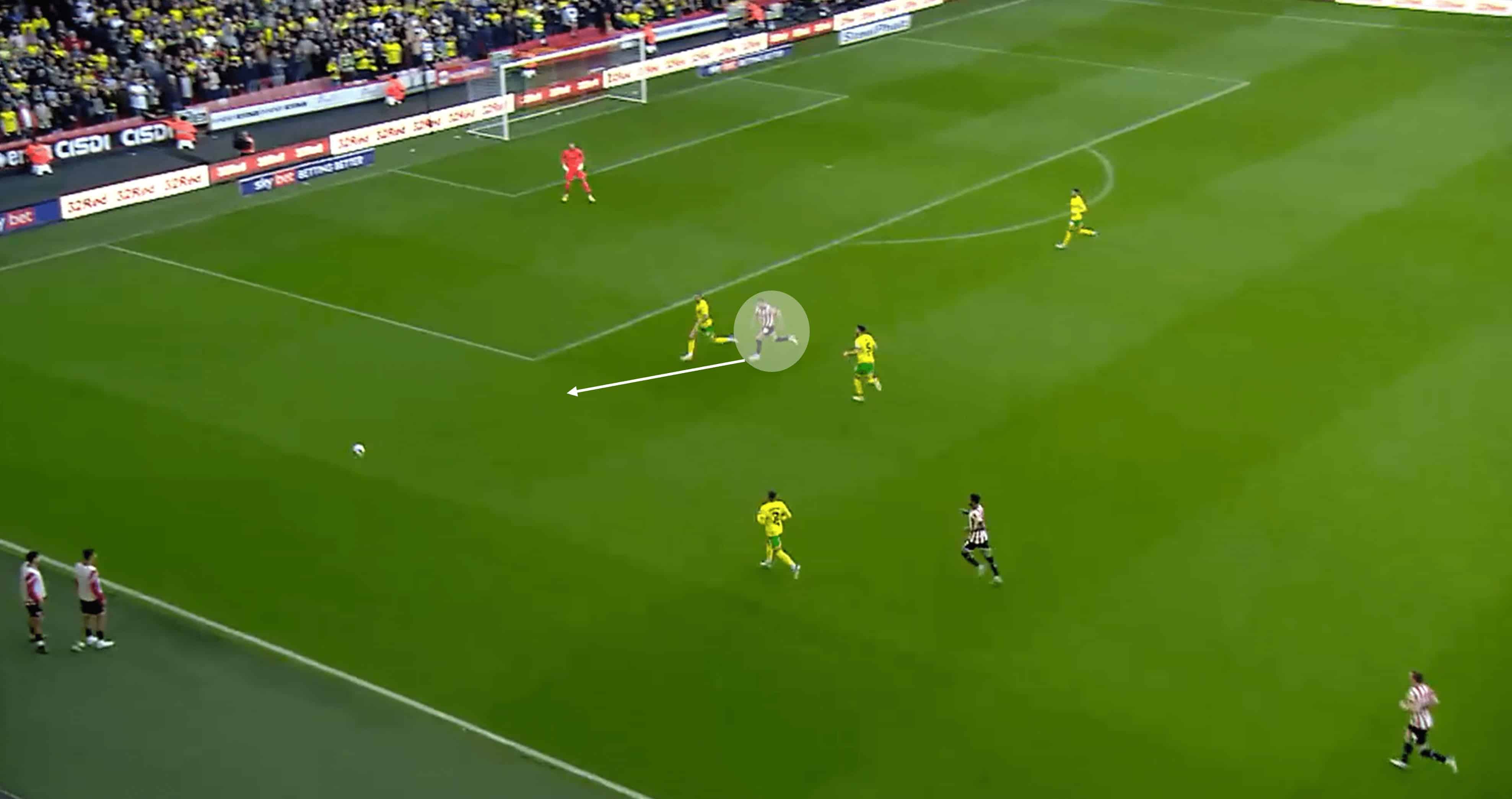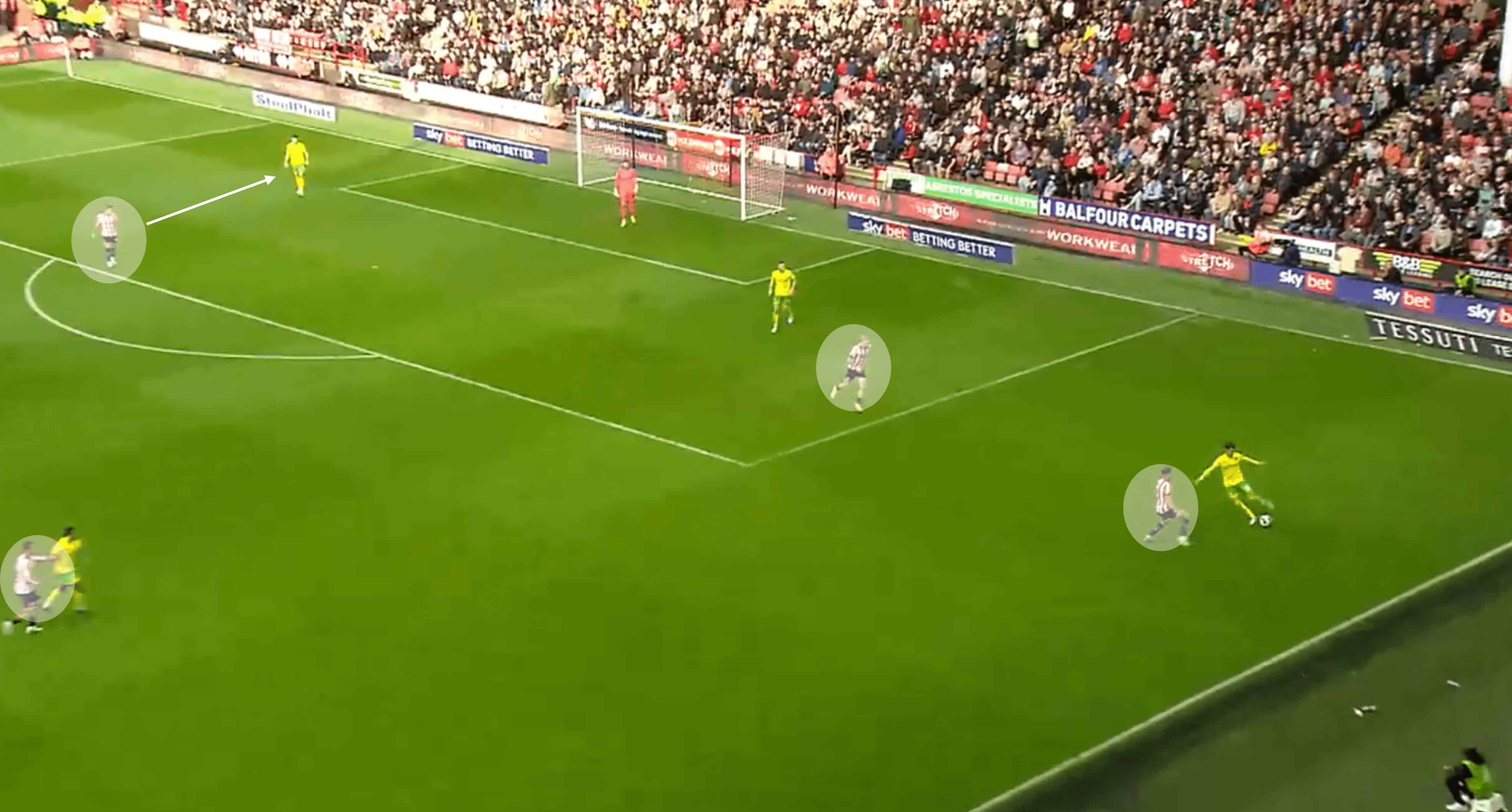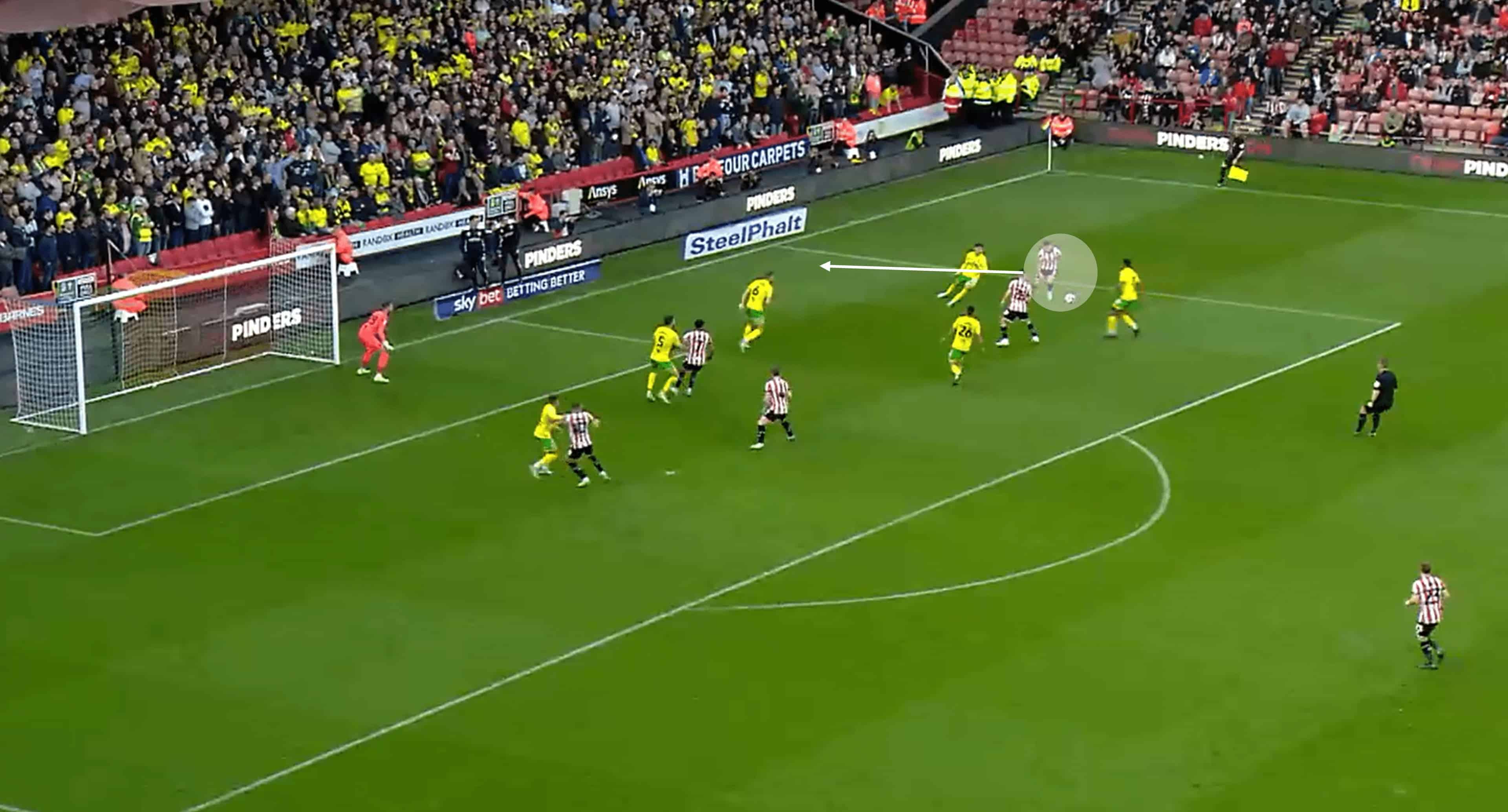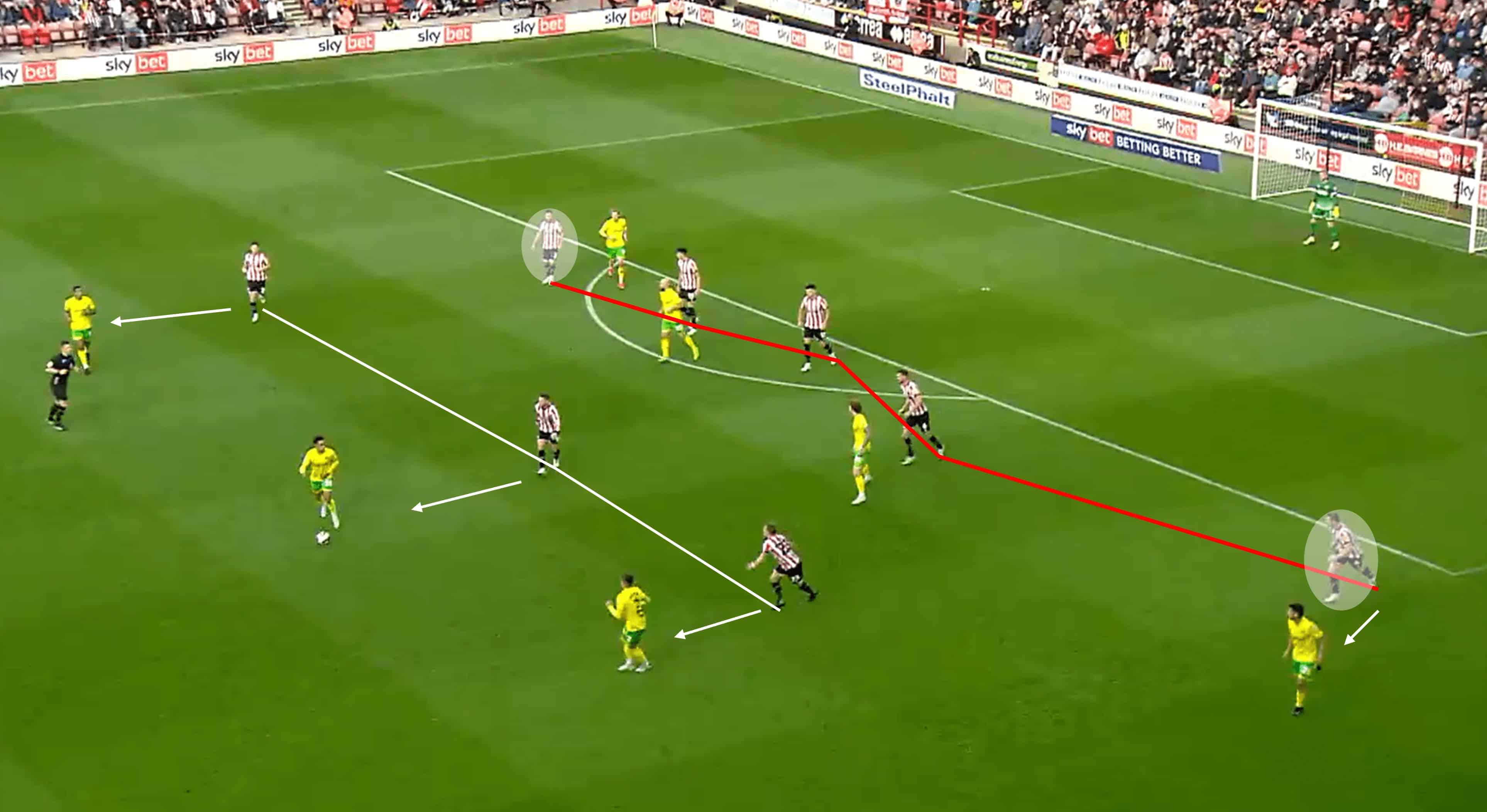We can already gauge their confidence and attacking intent by the number of players in the final third, and with four of them in a wide area, their emphasis is clear. The pass is played into Oliver Norwood who plays a clever first-time swinging pass into the channel behind the Norwich full-back, meeting the run of the Blades’ George Baldock.