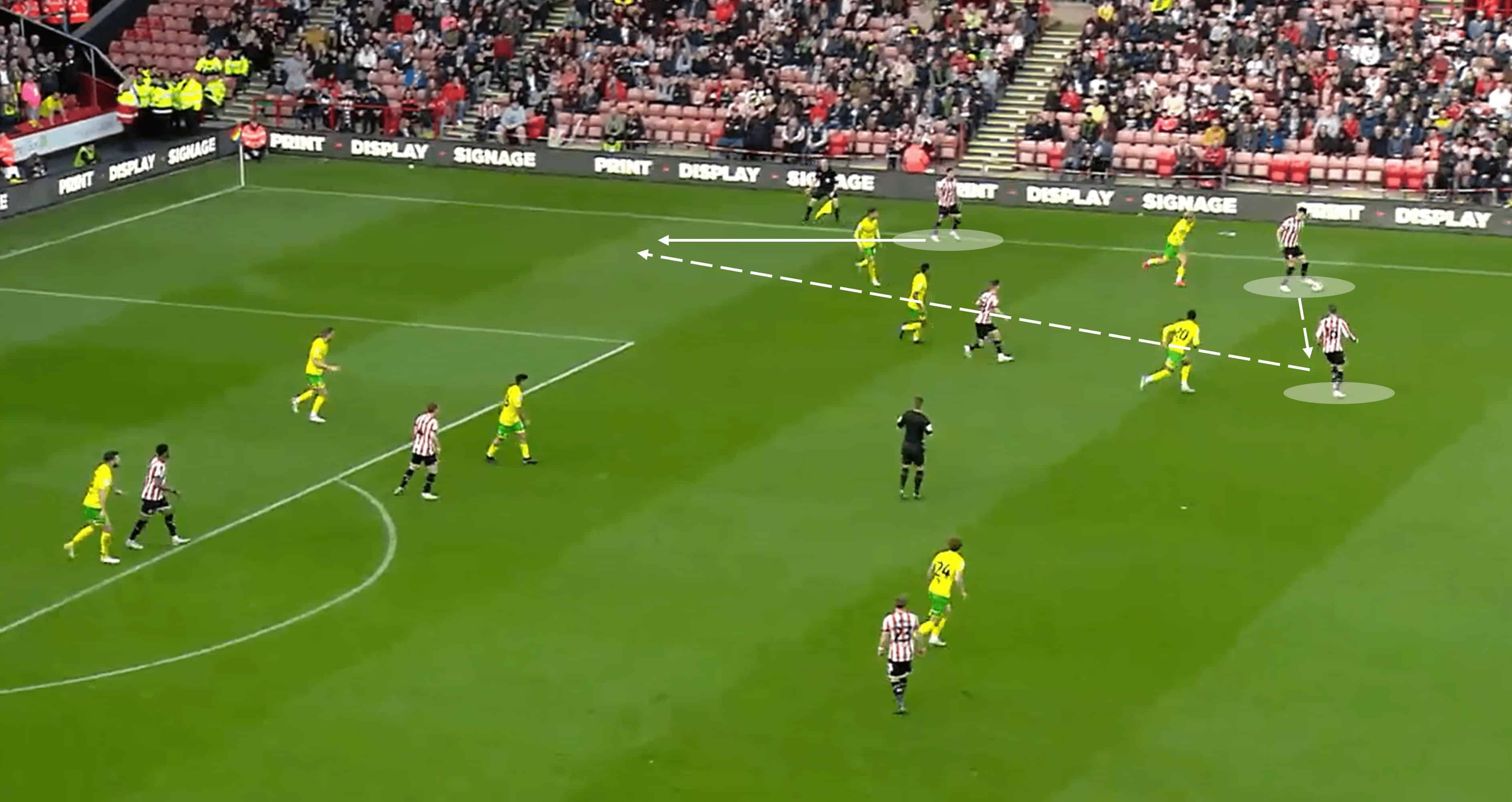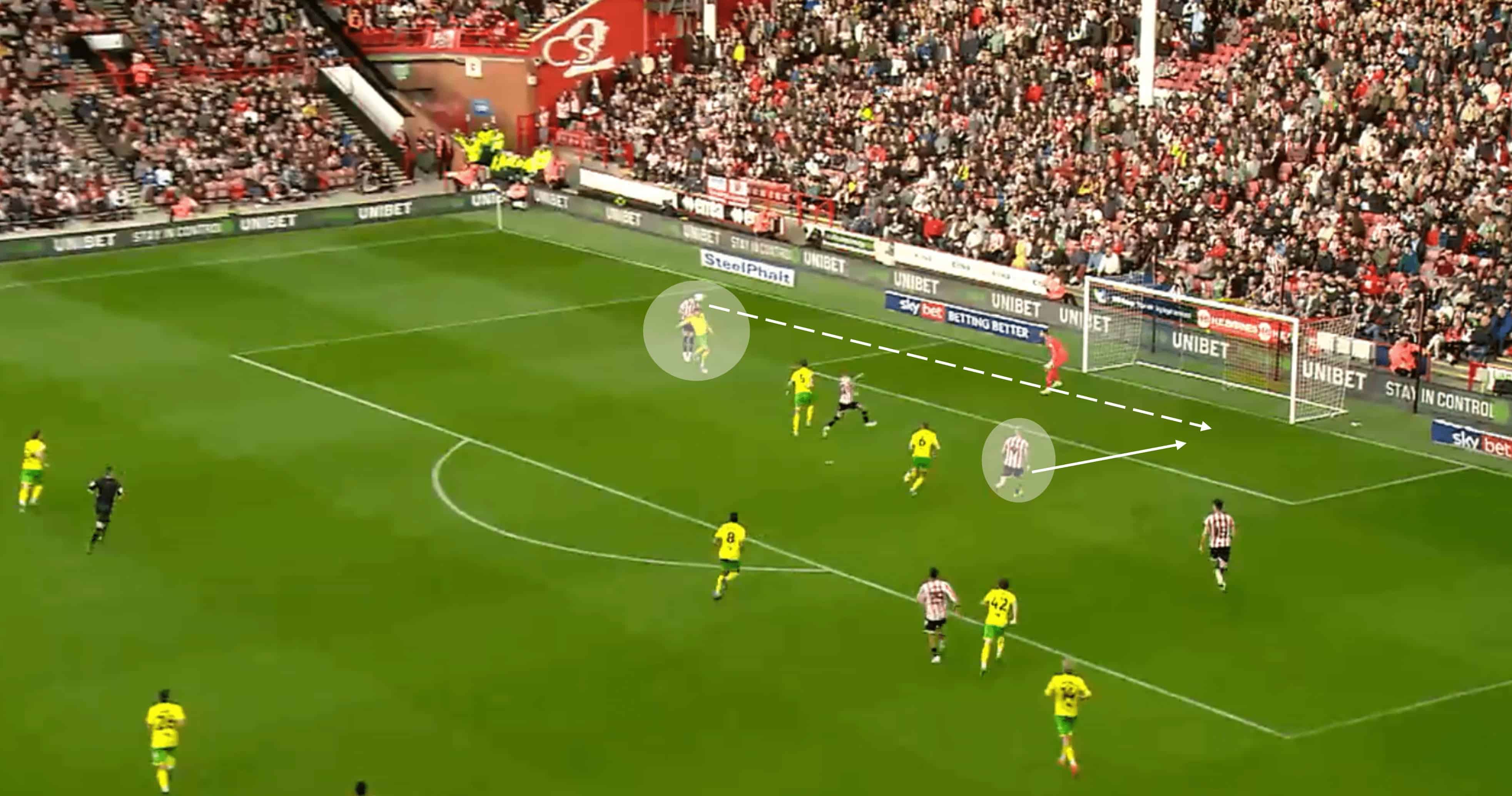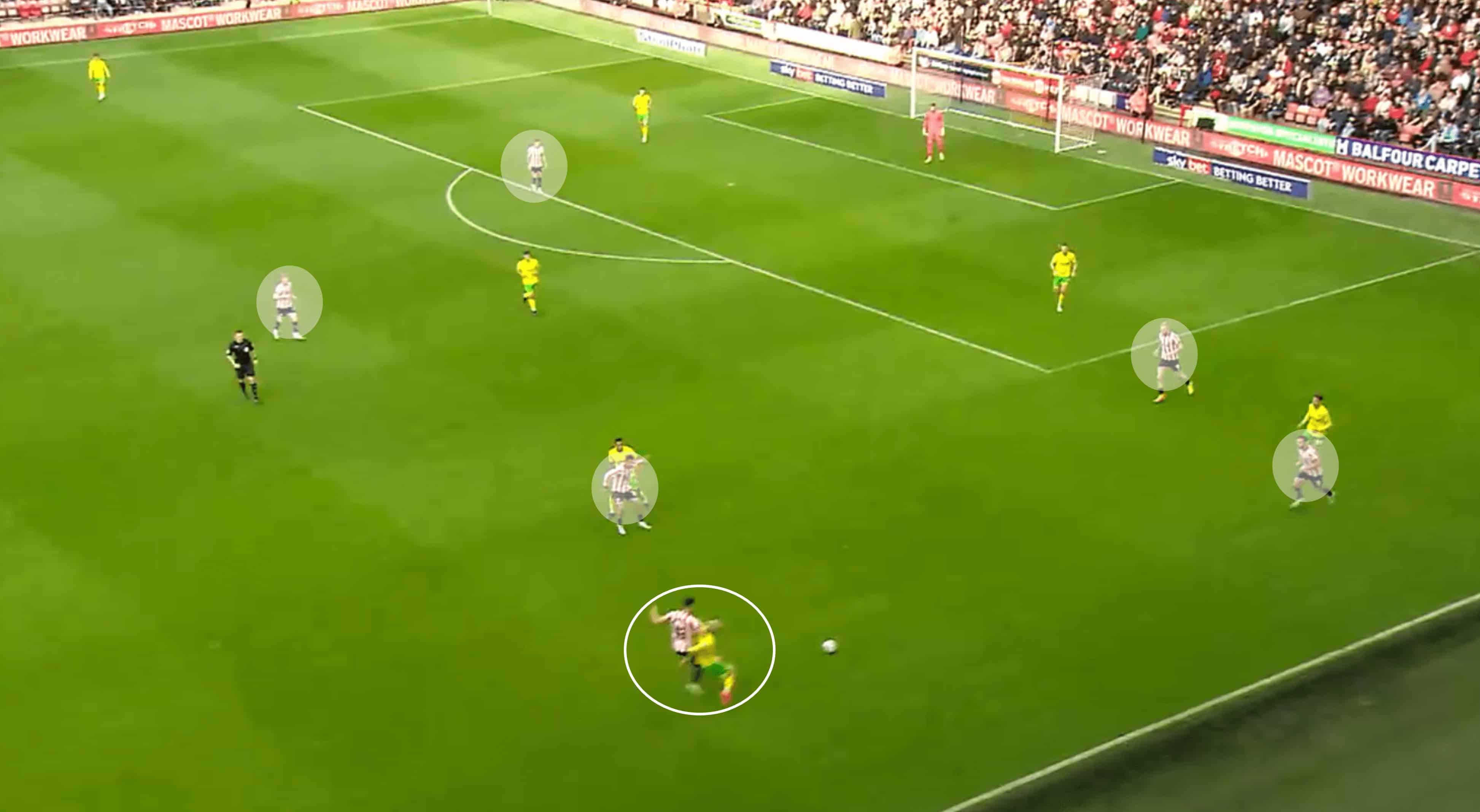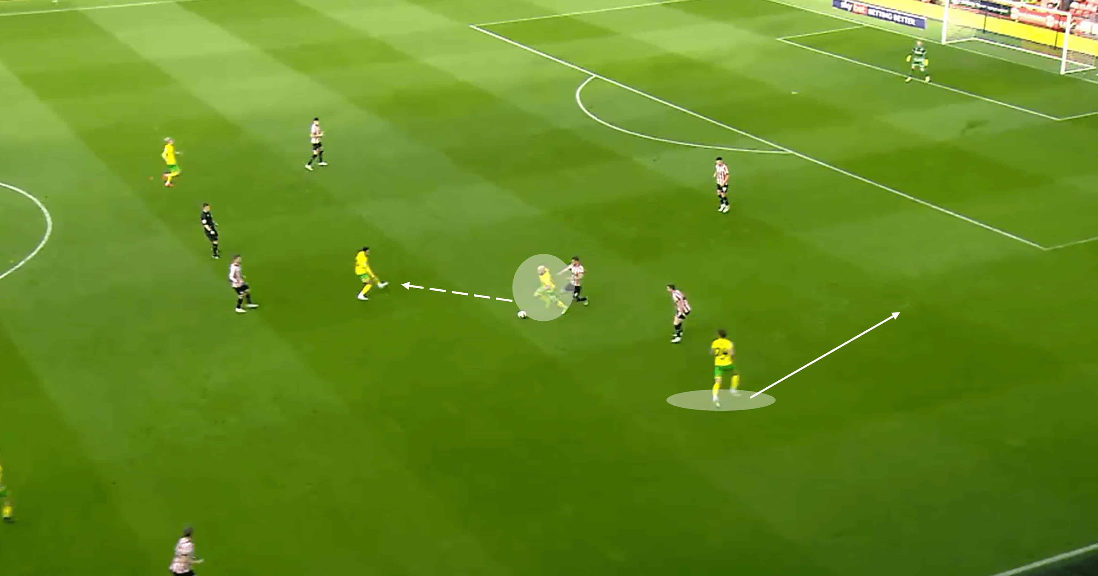 We can already gauge their confidence and attacking intent by the number of players in the final third, and with four of them in a wide area, their emphasis is clear. The pass is played into Oliver Norwood who plays a clever first-time swinging pass into the channel behind the Norwich full-back, meeting the run of the Blades’ George Baldock.