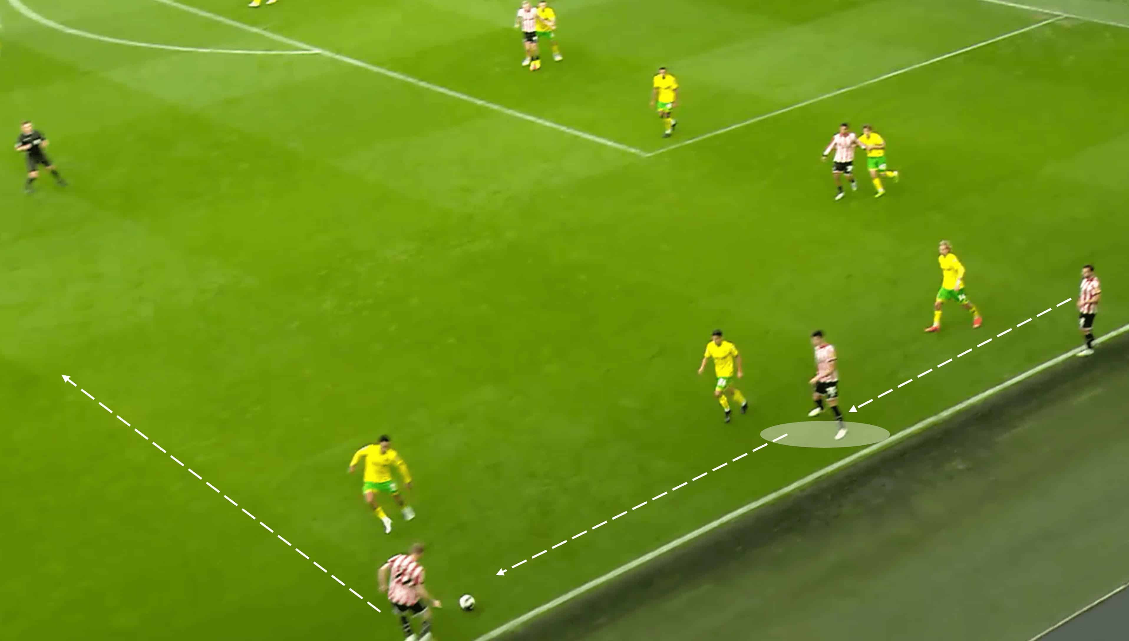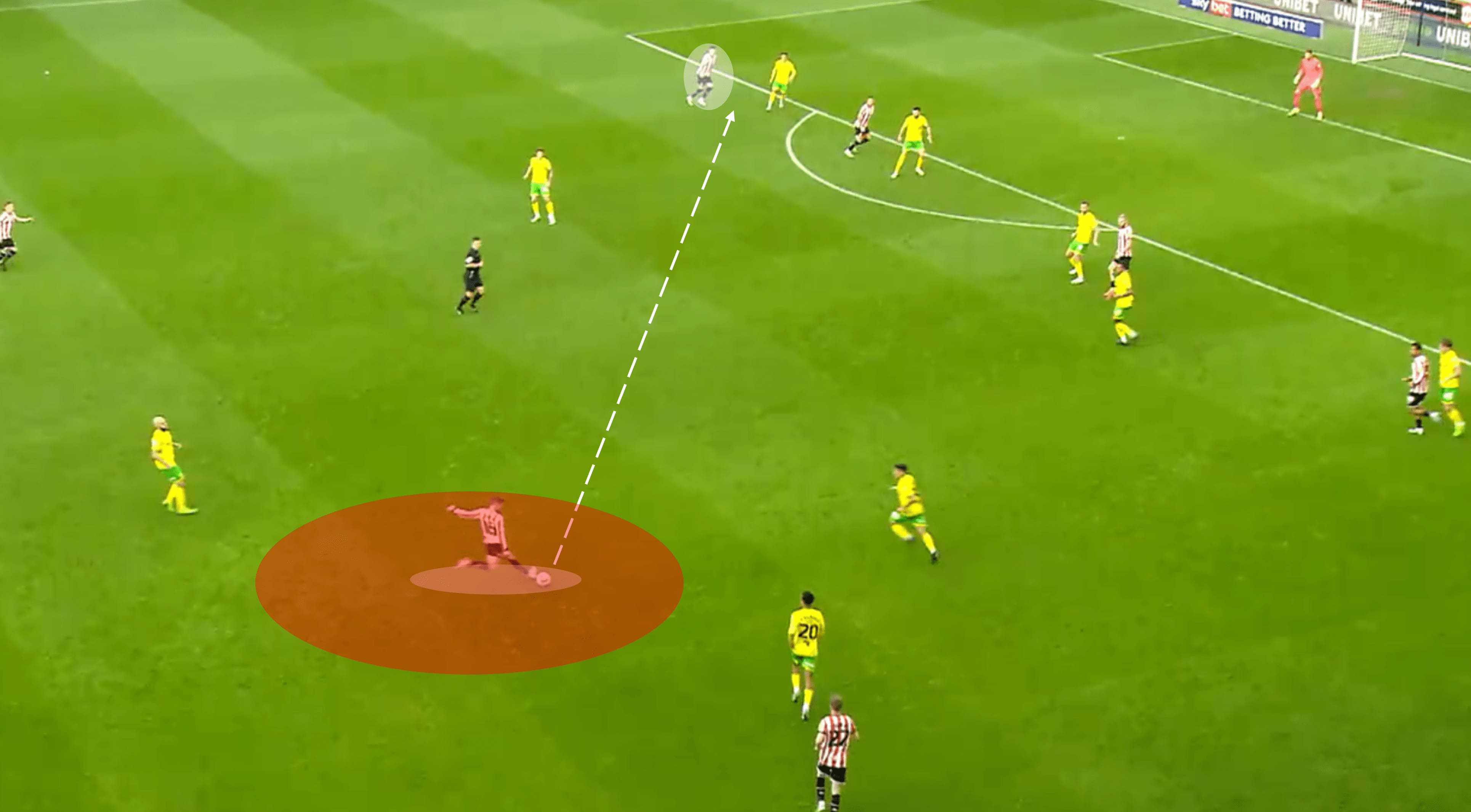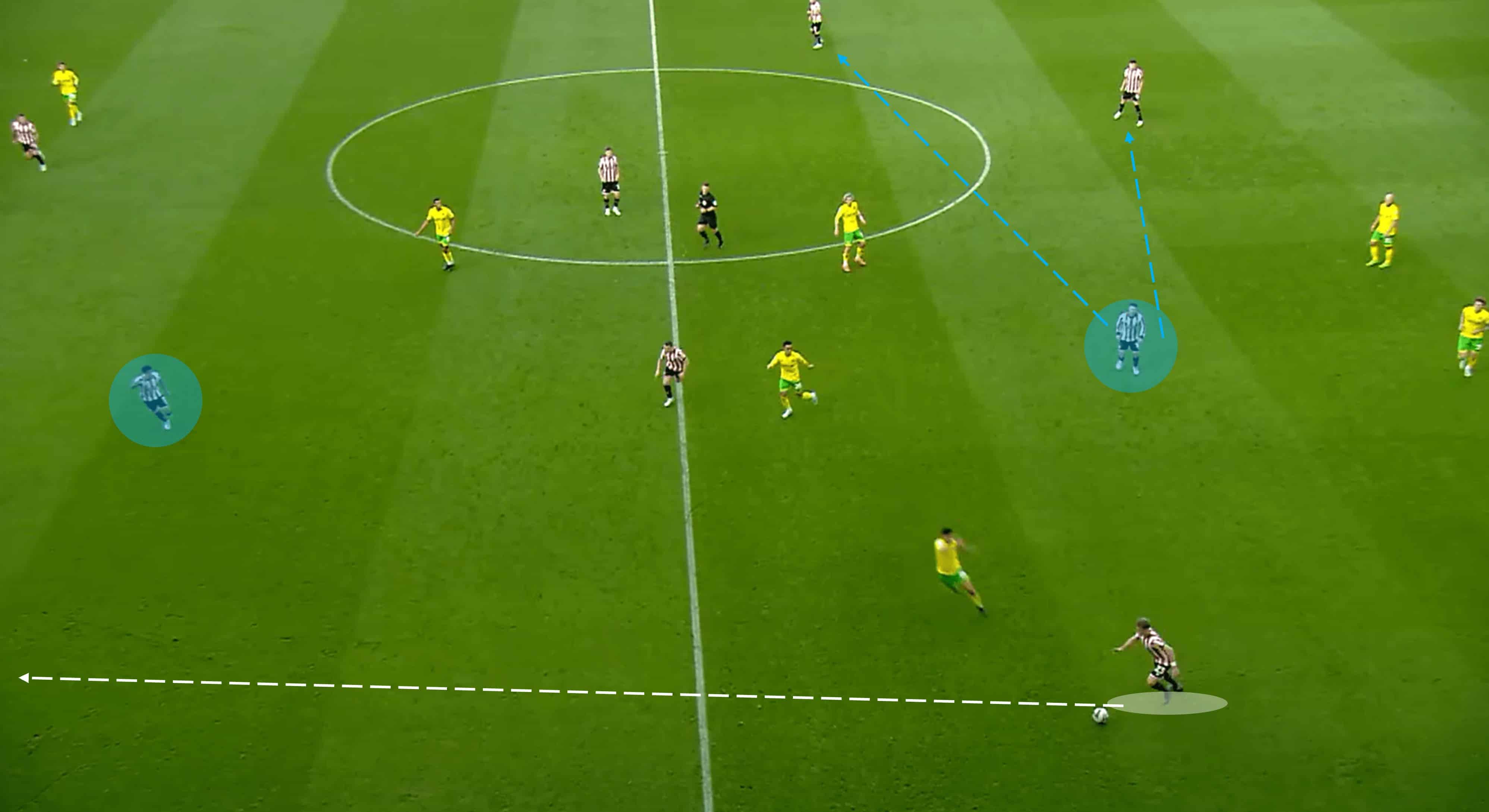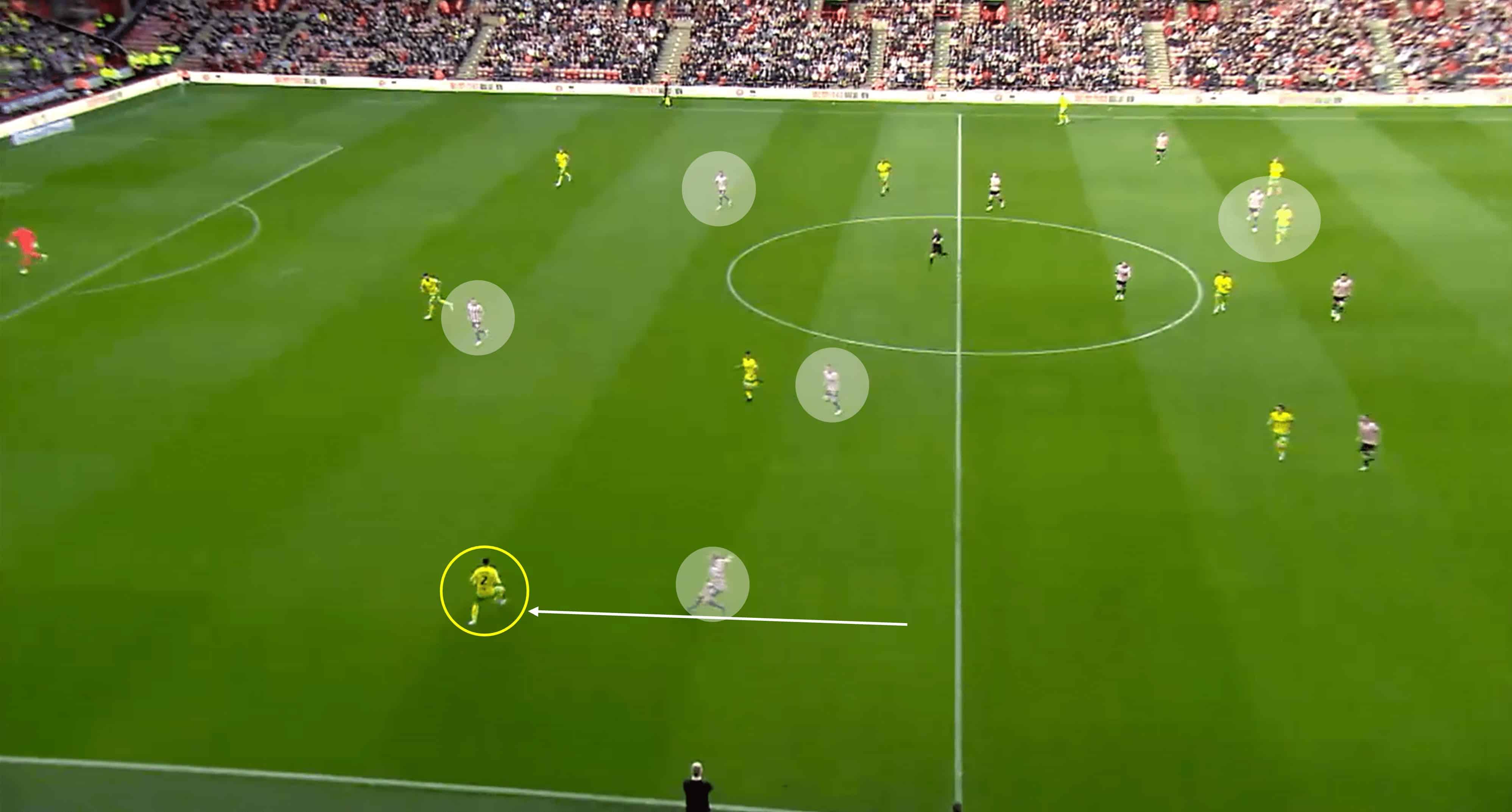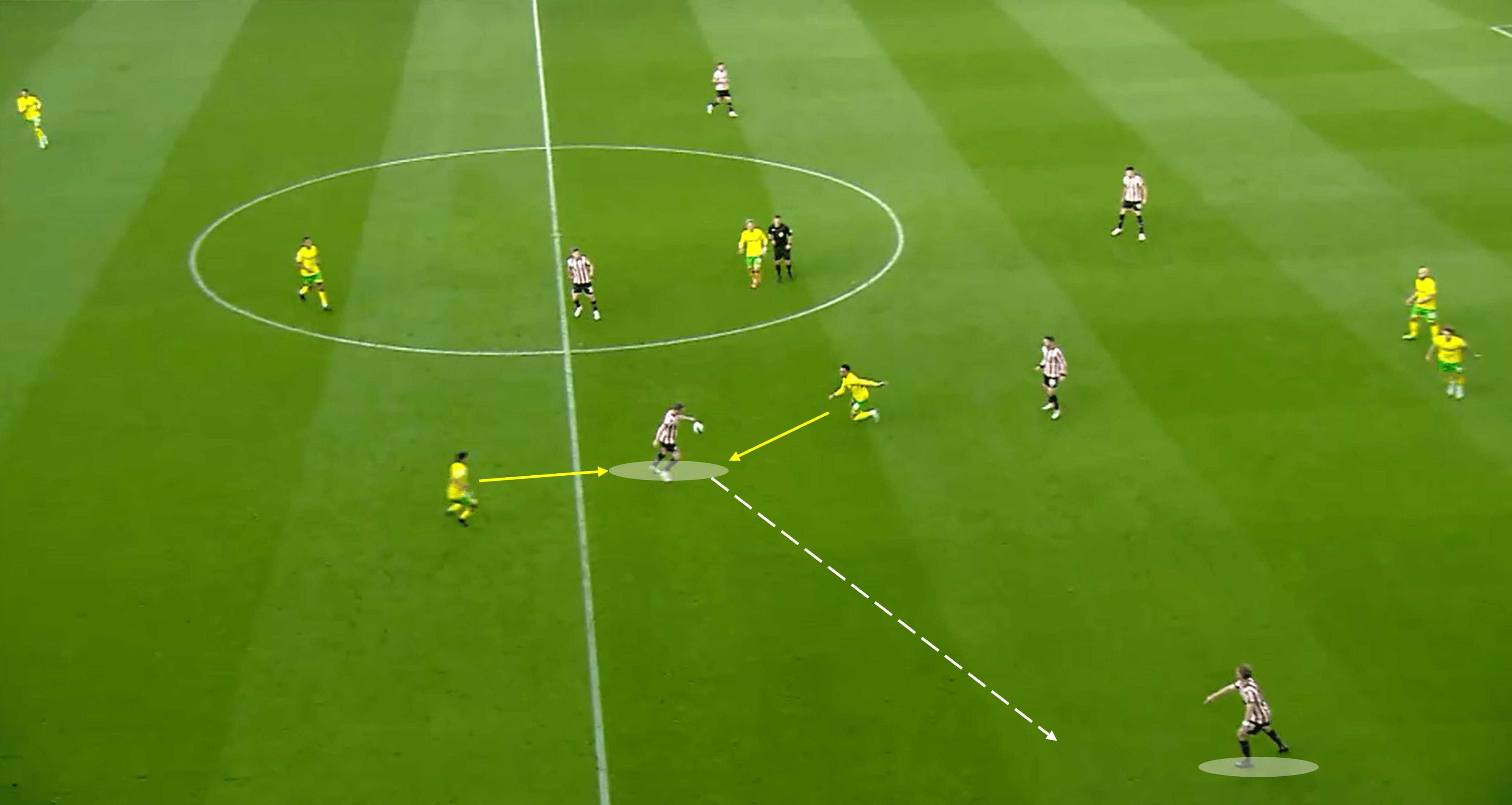 We can already gauge their confidence and attacking intent by the number of players in the final third, and with four of them in a wide area, their emphasis is clear. The pass is played into Oliver Norwood who plays a clever first-time swinging pass into the channel behind the Norwich full-back, meeting the run of the Blades’ George Baldock.