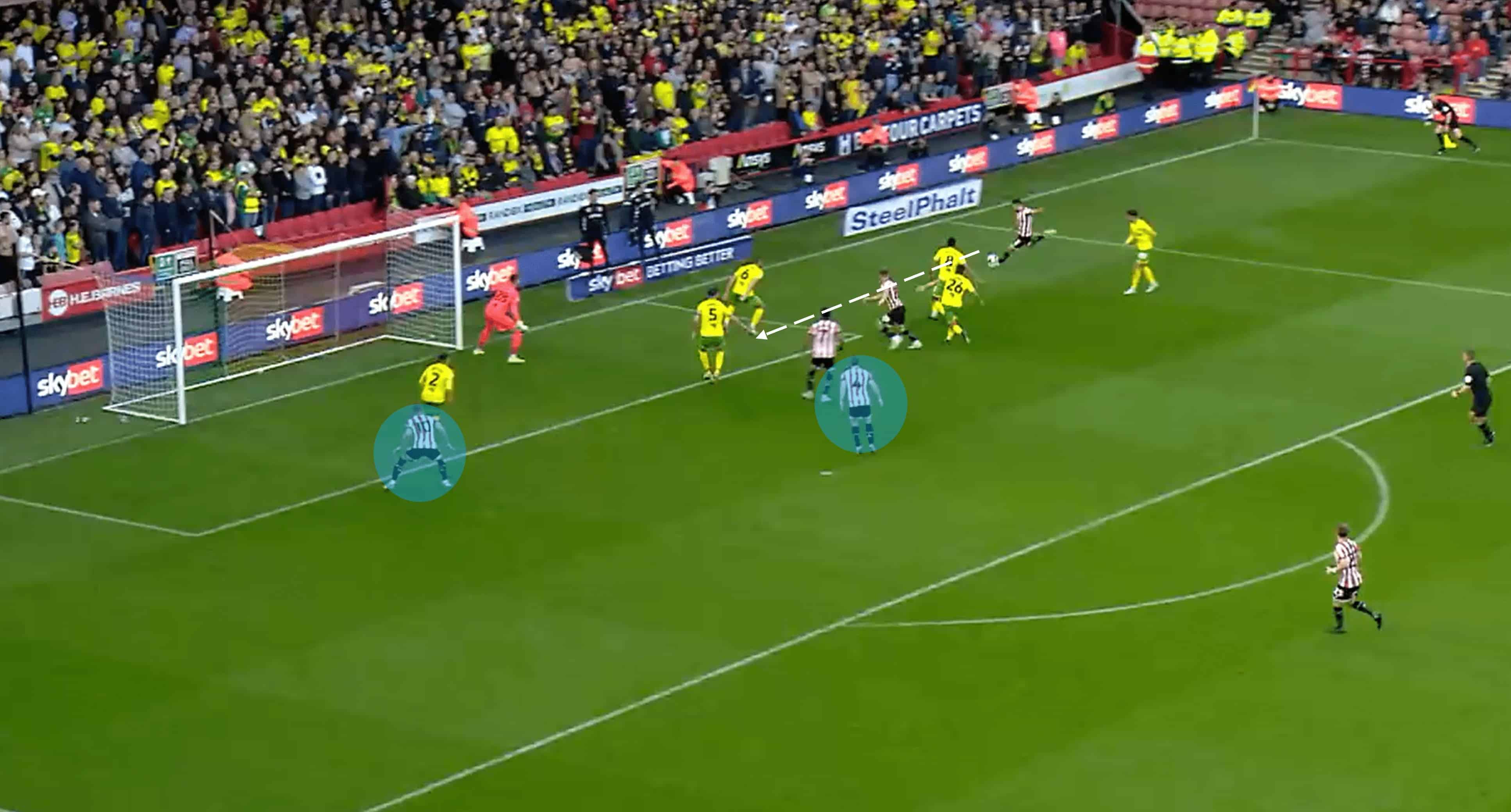 The man at the far post was able to rise high and win his header and did well to get sufficient power on it to send it across the Norwich back-line, who were slow to react. Especially slow to react was the man marking Oli McBurnie – the Scotsman was free to scramble the ball in at the far post to seal the goal. It was somewhat surprising to see Norwich fail to learn and adapt to combat their counterparts’ direct play.