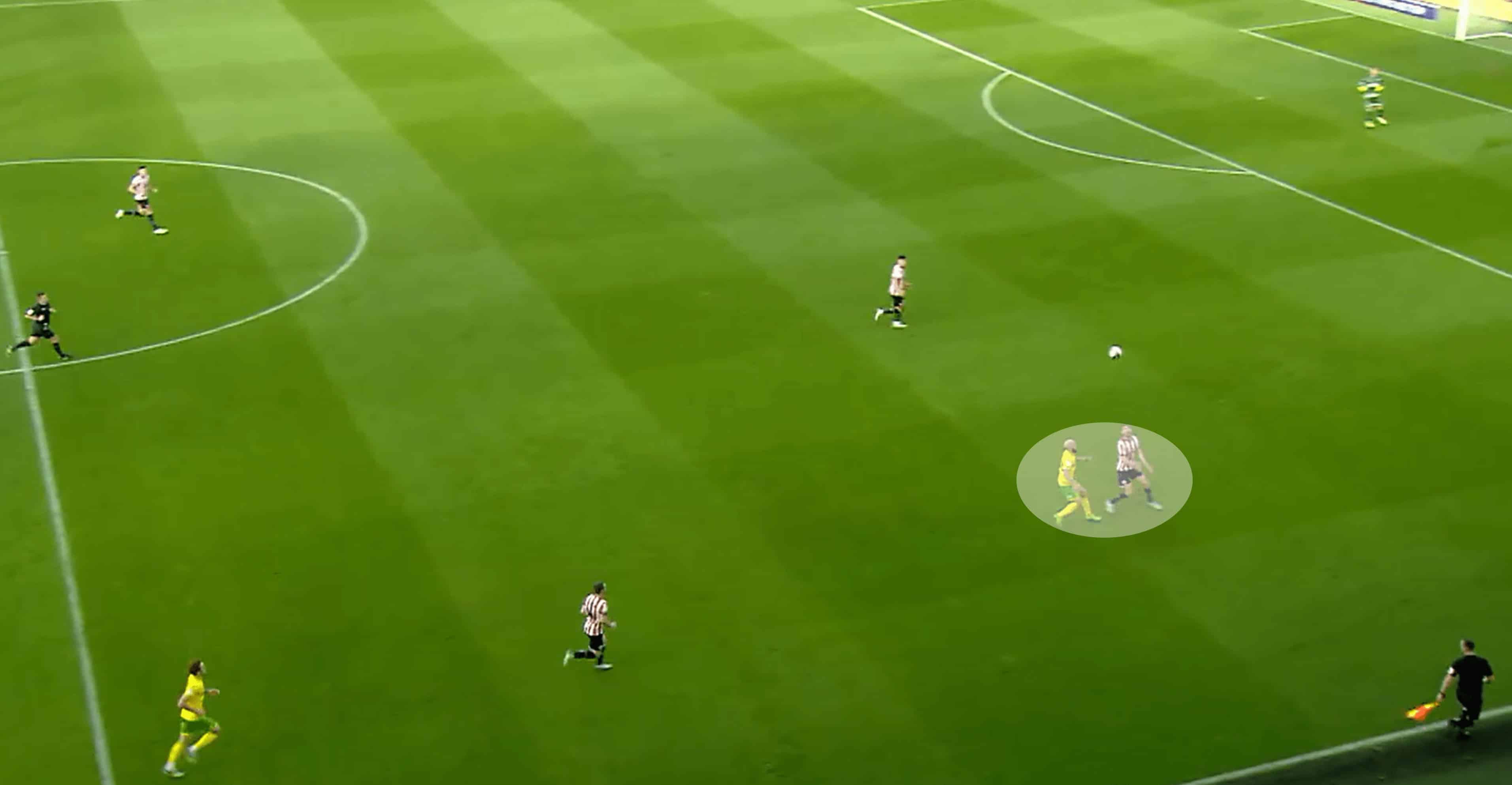 While there are the foundations of a good press – a good presence high up the pitch with nearby options marked, Ben Osborn was simply too slow in getting to the Norwich right-back Max Aarons, and his attempted challenge that followed was too slow and weak to stop Aarons from sending a lofted ball into Pukki, who bullied the Blades defender to collect the ball and go through to double his team’s lead.