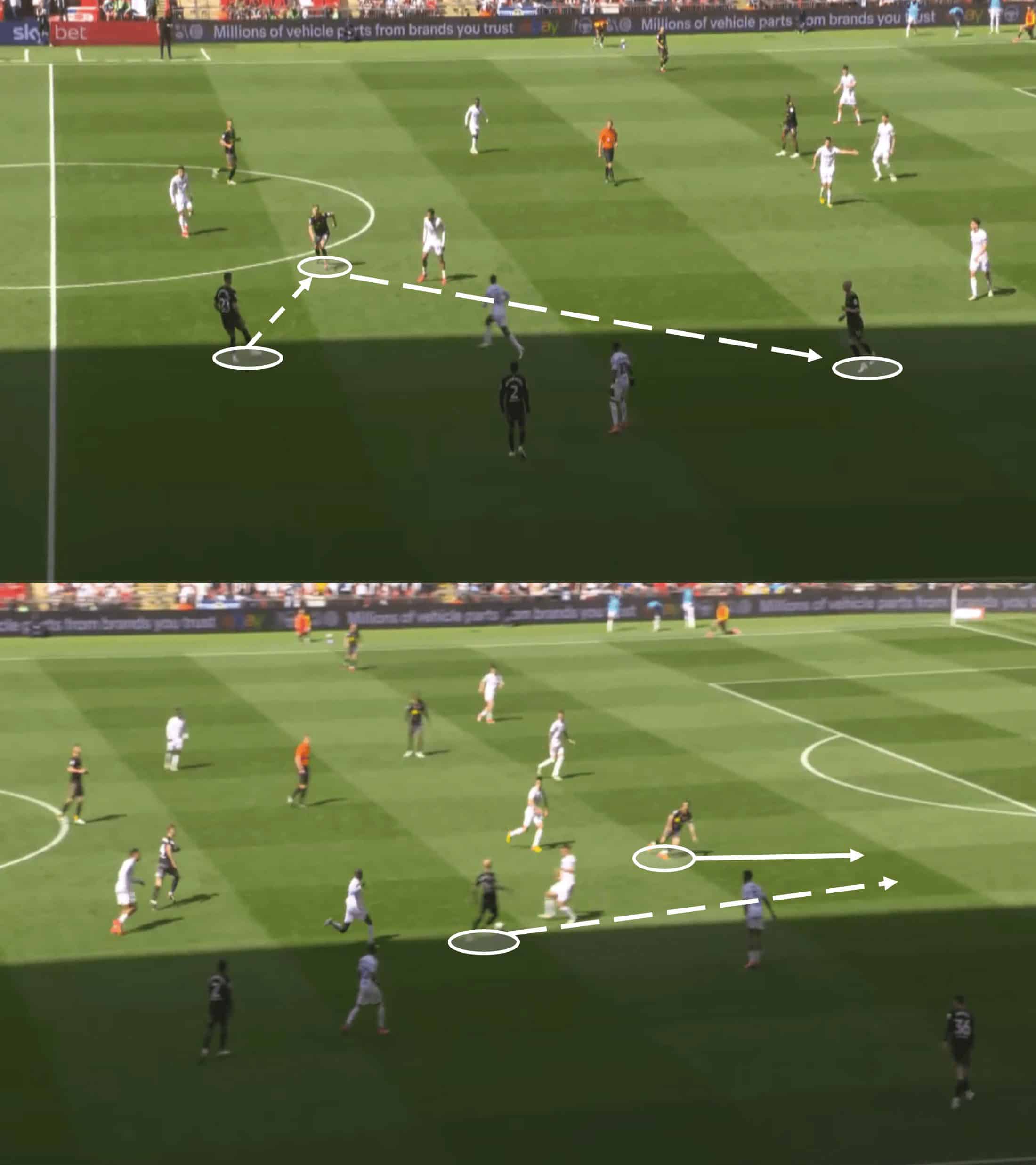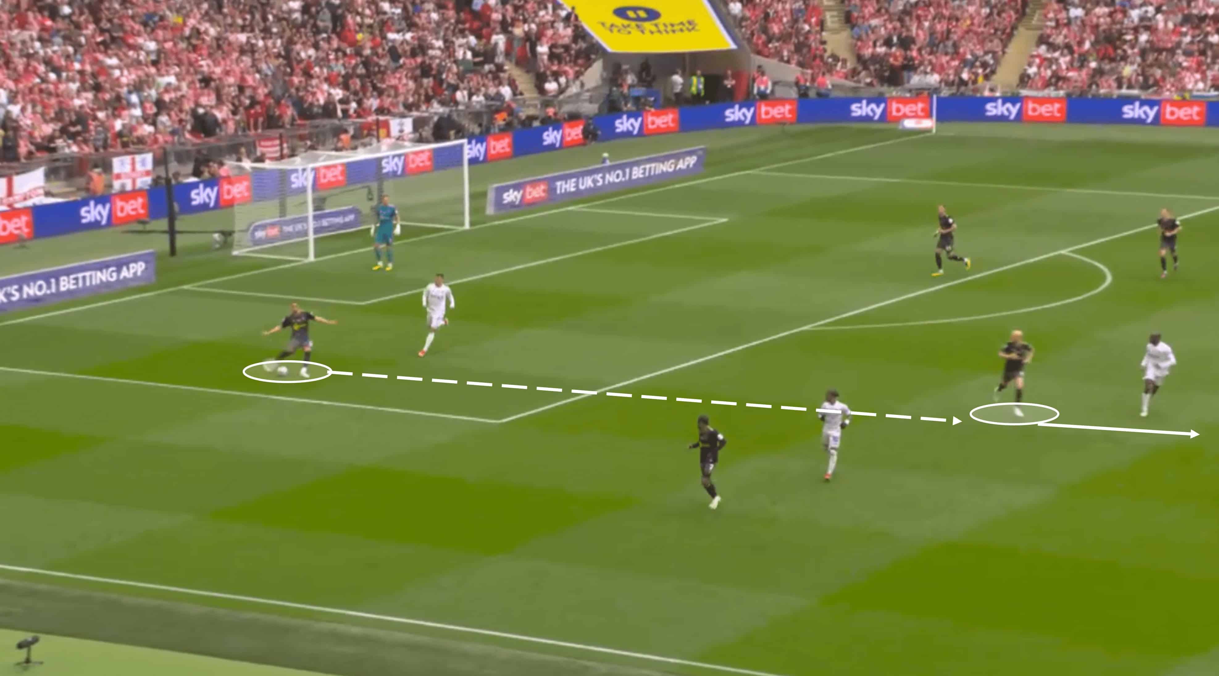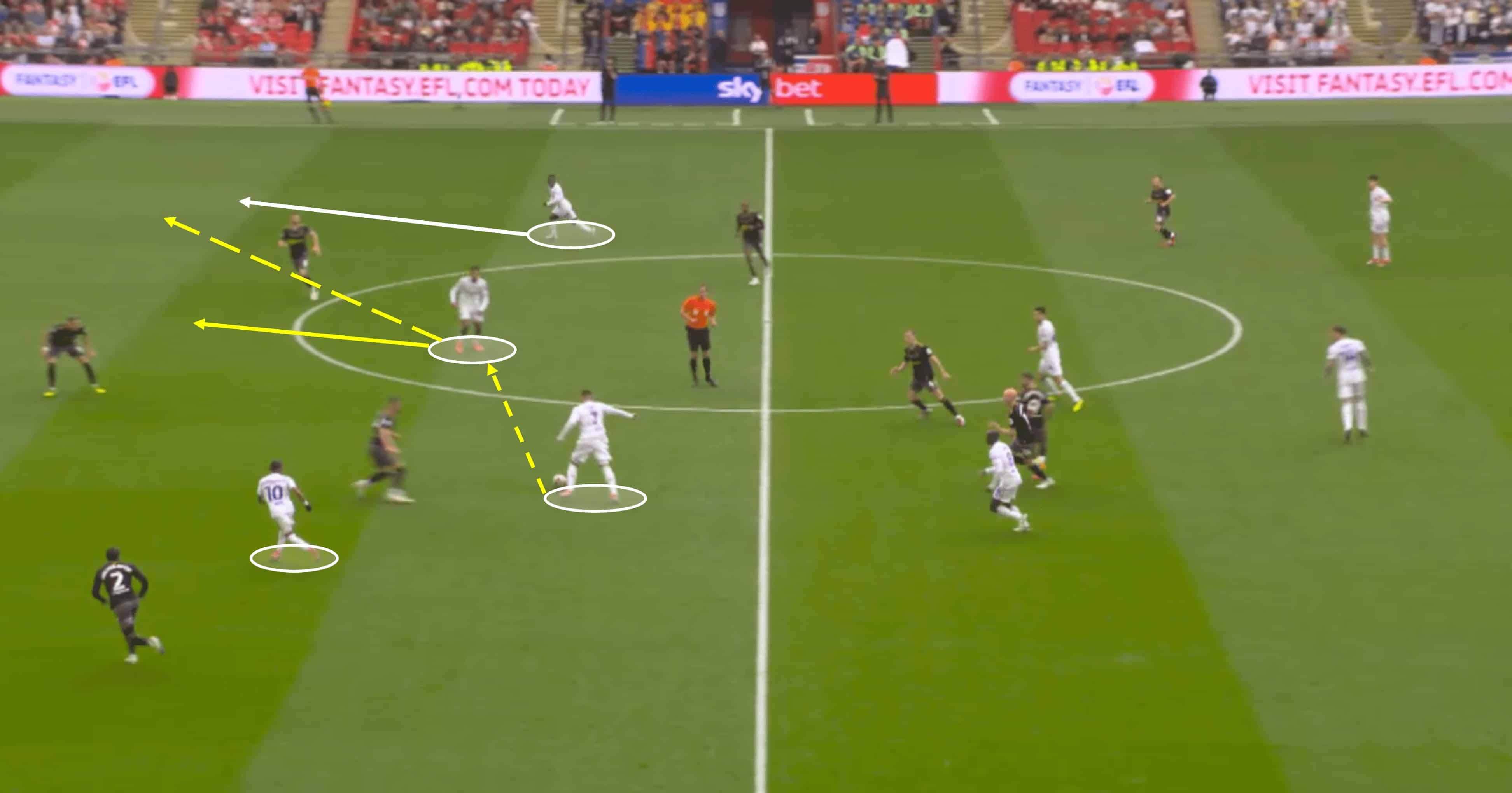 Knowing which pass type to use and when was key to their tactics, especially in these early exchanges—the one above shows us what they wanted to achieve. A pass into midfielder Will Smallbone may seem dangerous given Leeds’ presence, but the execution of the pass, the speed of it, allowed Smallbone to receive the ball with the option of pushing forward.