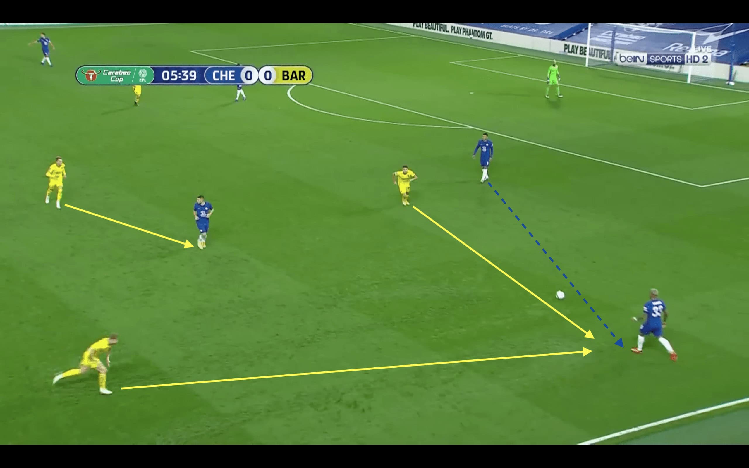 It should be noted that Barkley had a lot of success in ball progression from deep in this game because of Barnsley’s sometimes disjointed press but also seemed to over prioritise Kovačić’s ability which left the Englishman open. This move isn’t indicative of this success but Barnsley tried to trap Barkley by making him the pressing trigger but his technical quality proved to be too good in this case.