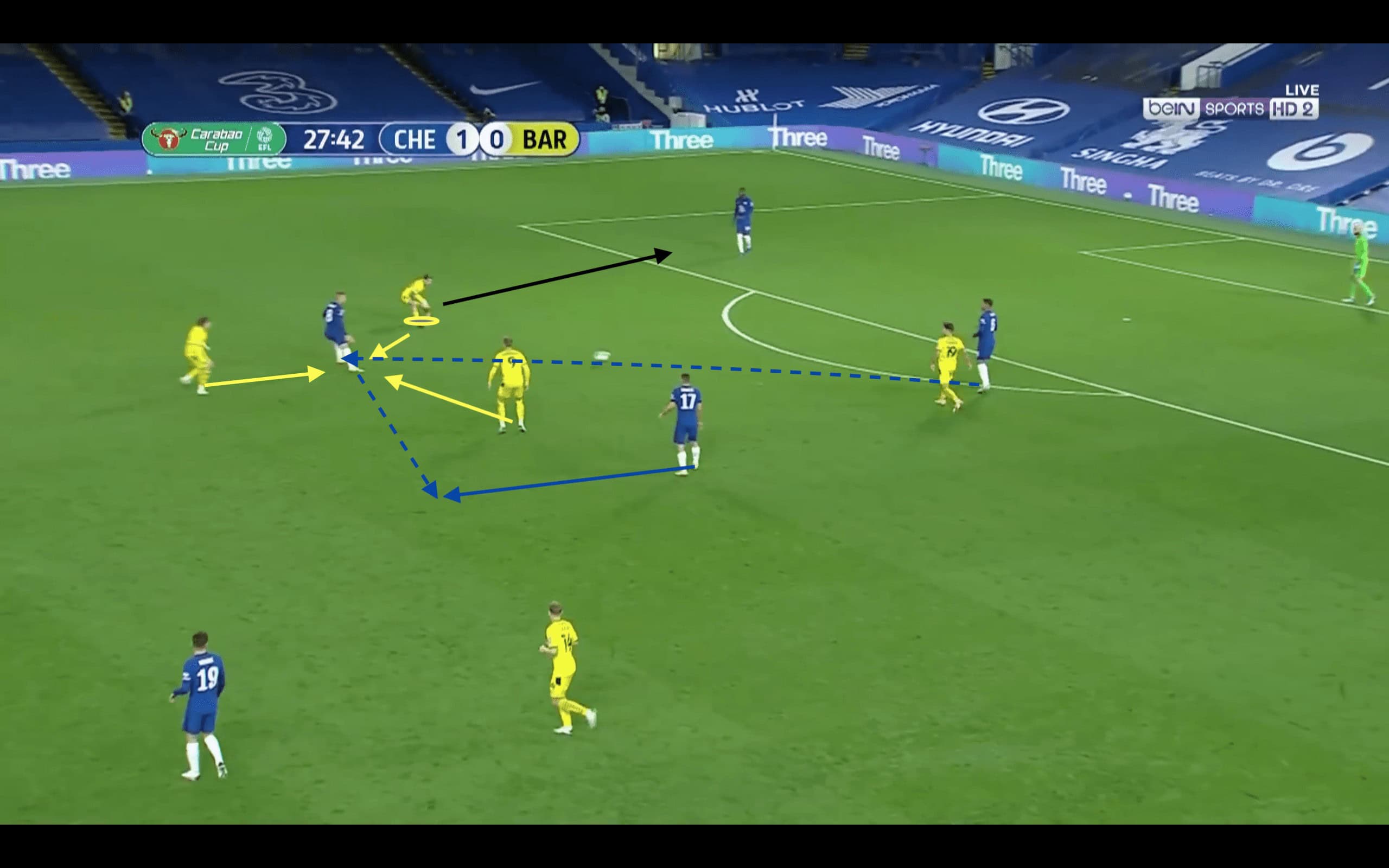 Thiago Silva played the pass into Emerson but when the centre-back had the ball, the Barnsley forward forced that pass to the left-back. The reason for this was that Emerson was the pressing trigger more often than not. As soon as the pass is played to the left-back, Barnsley’s right-back flies in to put pressure on Emerson. The striker who pressed Thiago Silva is also looking to close in and will look to keep Silva in his cover shadow to prevent a pass back to him. With Kovačić looking to drop for a passing option, one of the attacking tridents is closing in on the Croatian to make that pass a very risky one. In the end, with two players closing in on Emerson, the Brazilian looks to send it long but the ball ends up going out of play.