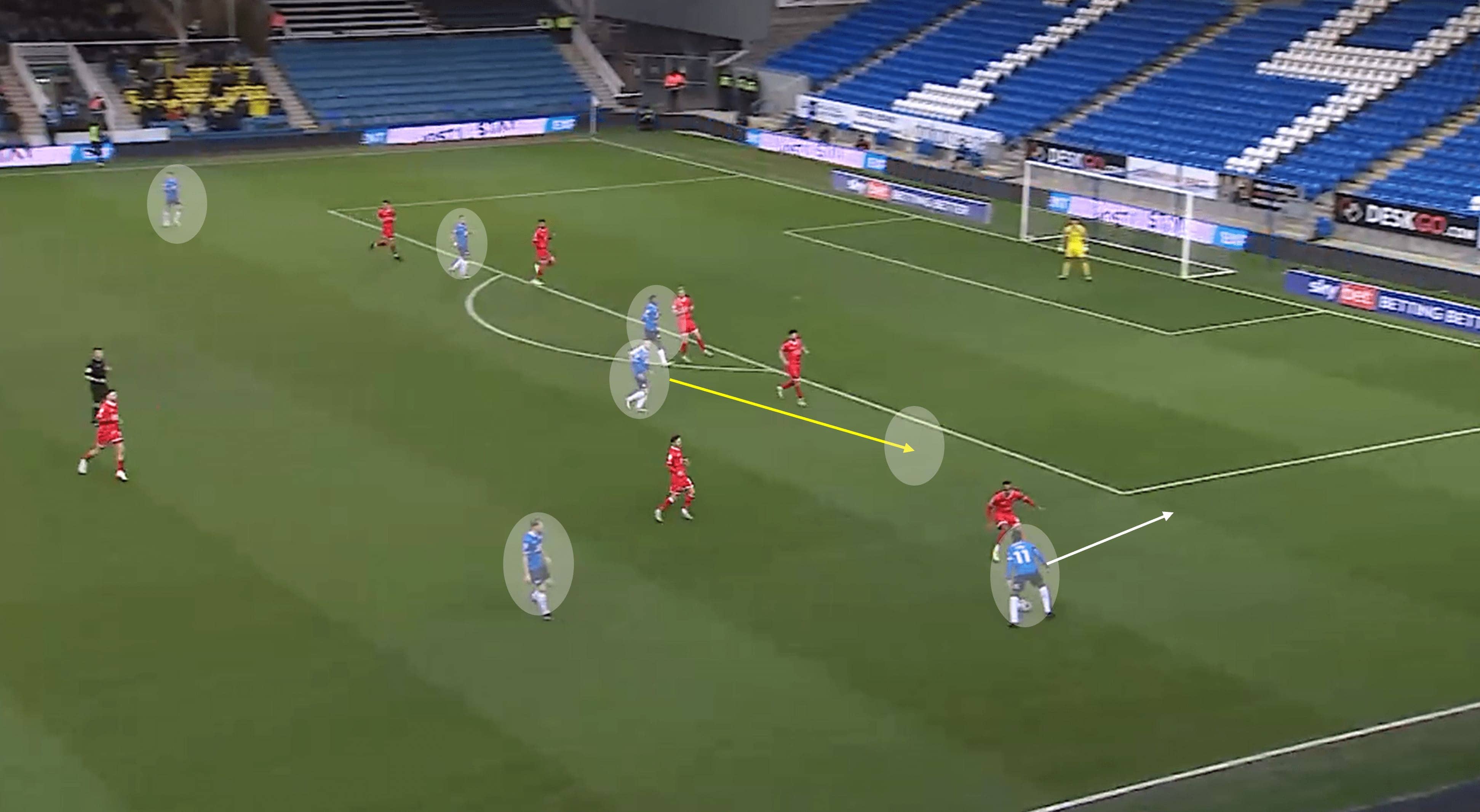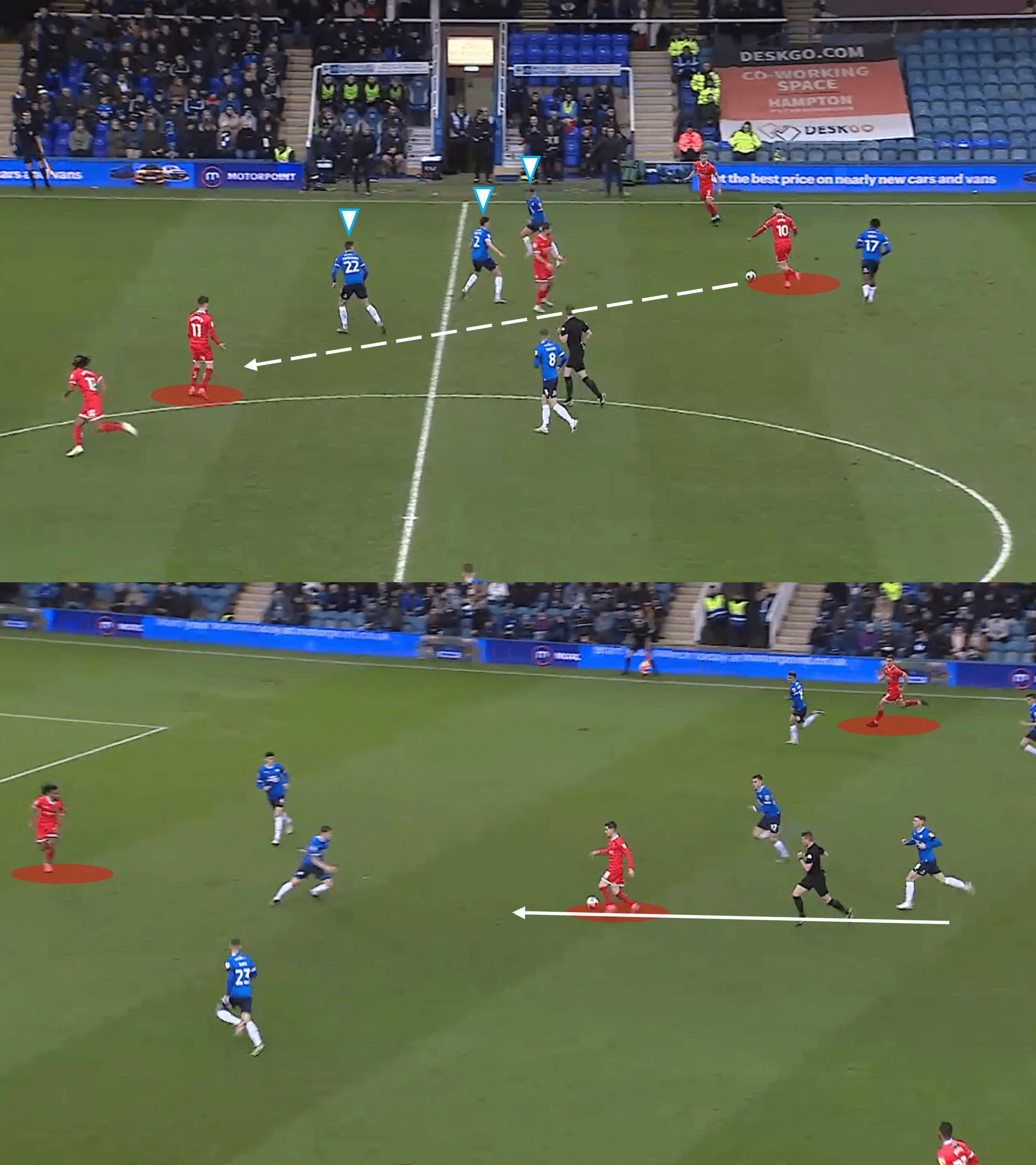 As mentioned, attacking in transitions was a key part of Wycombe’s tactics in this tie. With the method of attacking in transition comes other important factors, like exploiting space left by the opponent, and exploiting even the smallest lapse in concentration to make that quick leap up the pitch.