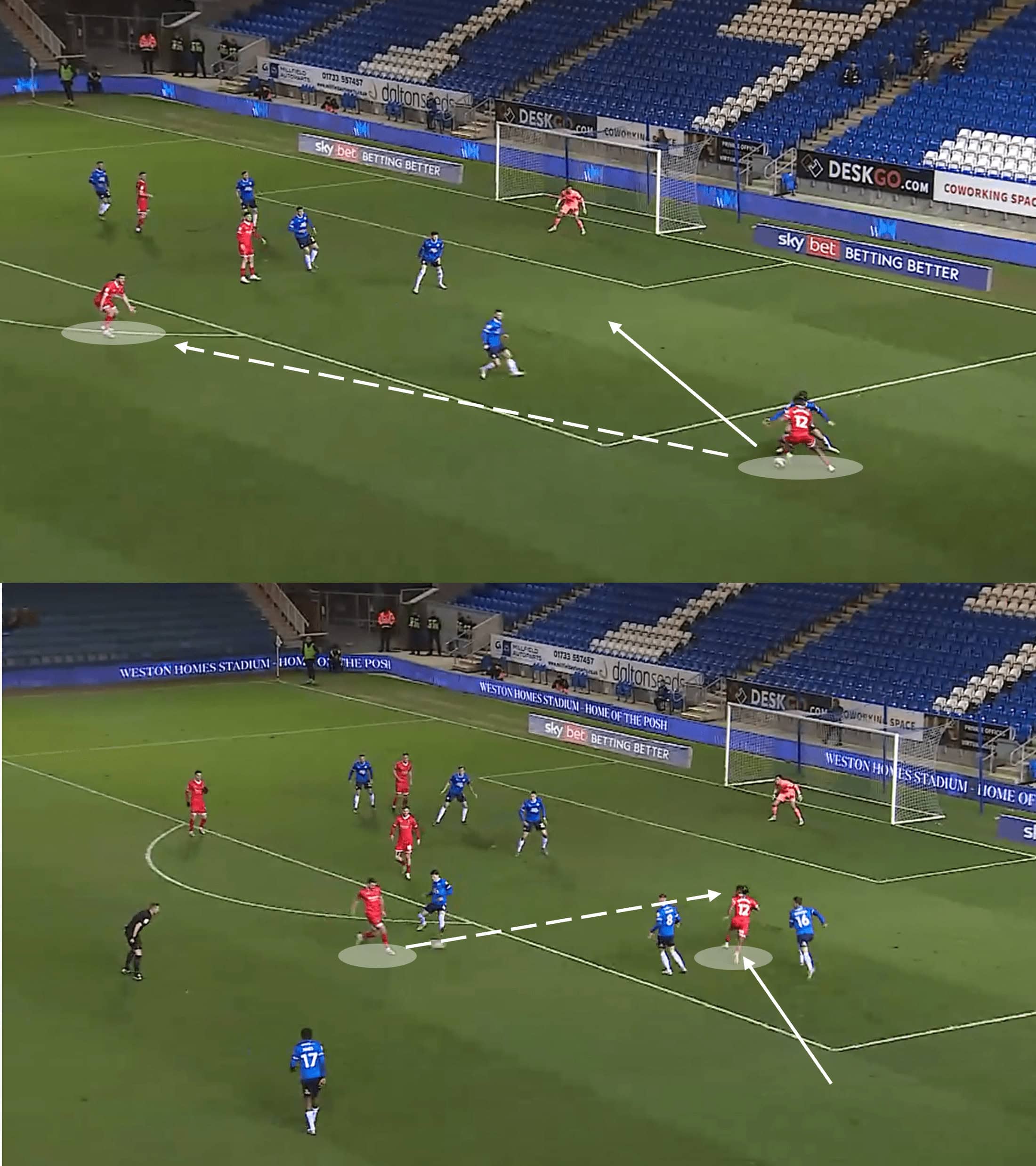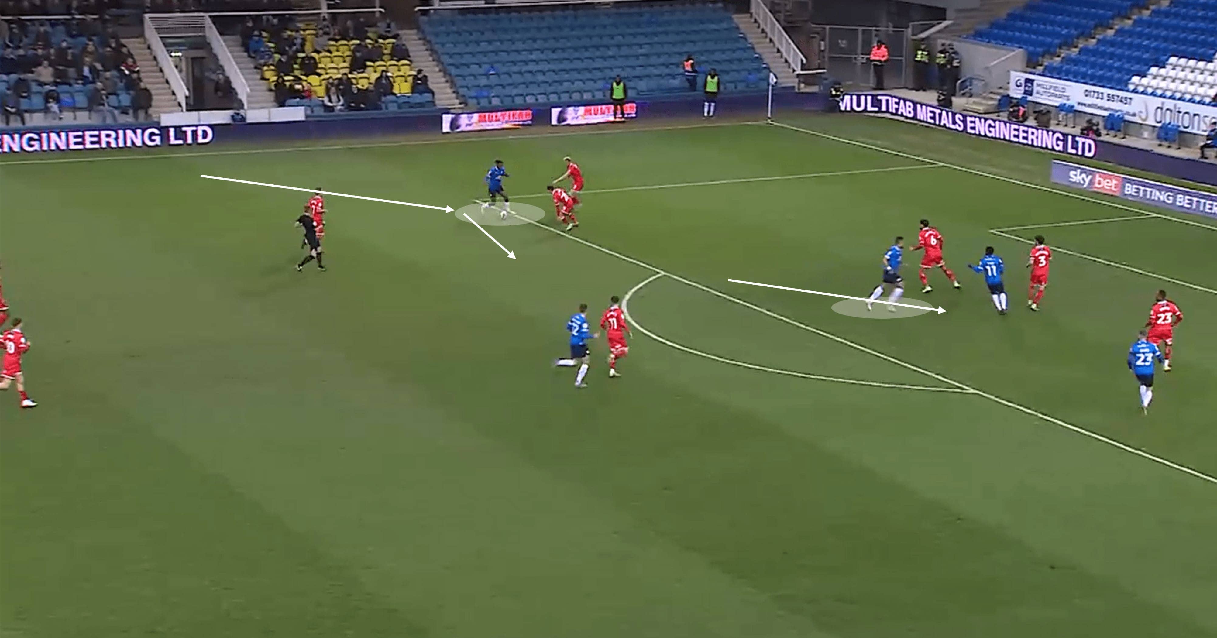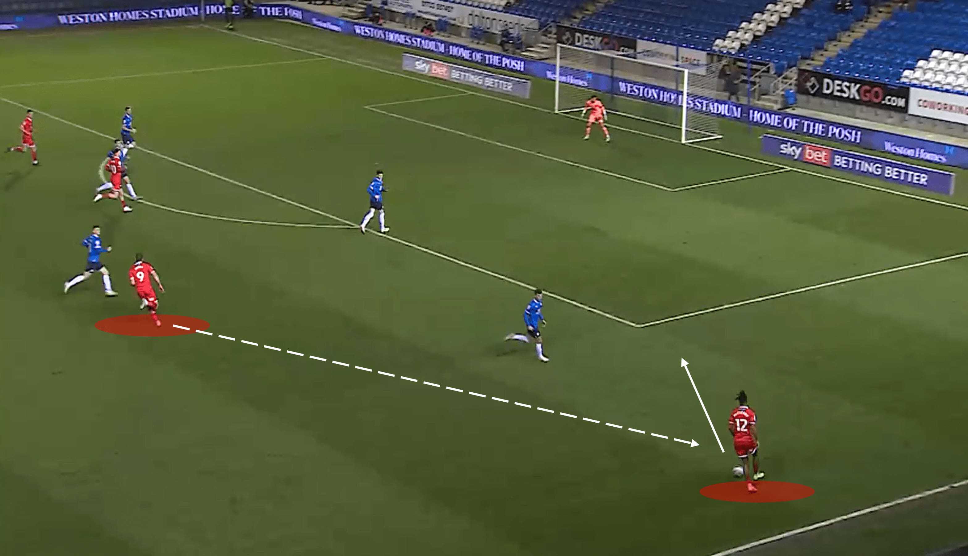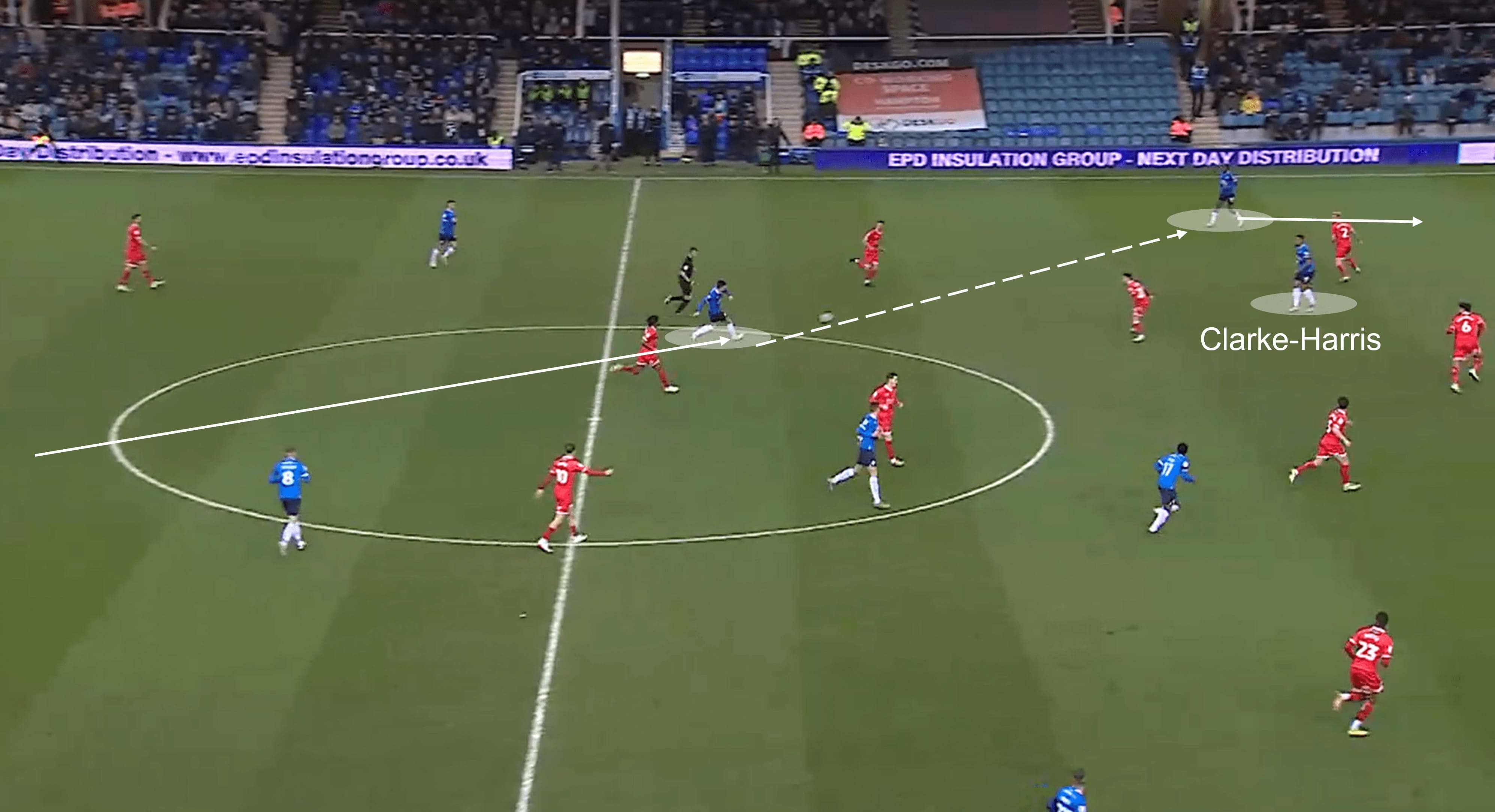 Another noteworthy element of Posh’s attacking tactics was the role of Clarke-Harris, who often dropped in deeper to operate as a link between thirds. He showed good awareness and tactical understanding in doing this and often positioned himself in close proximity to the nearest winger to increase the chance of combination plays in those areas.