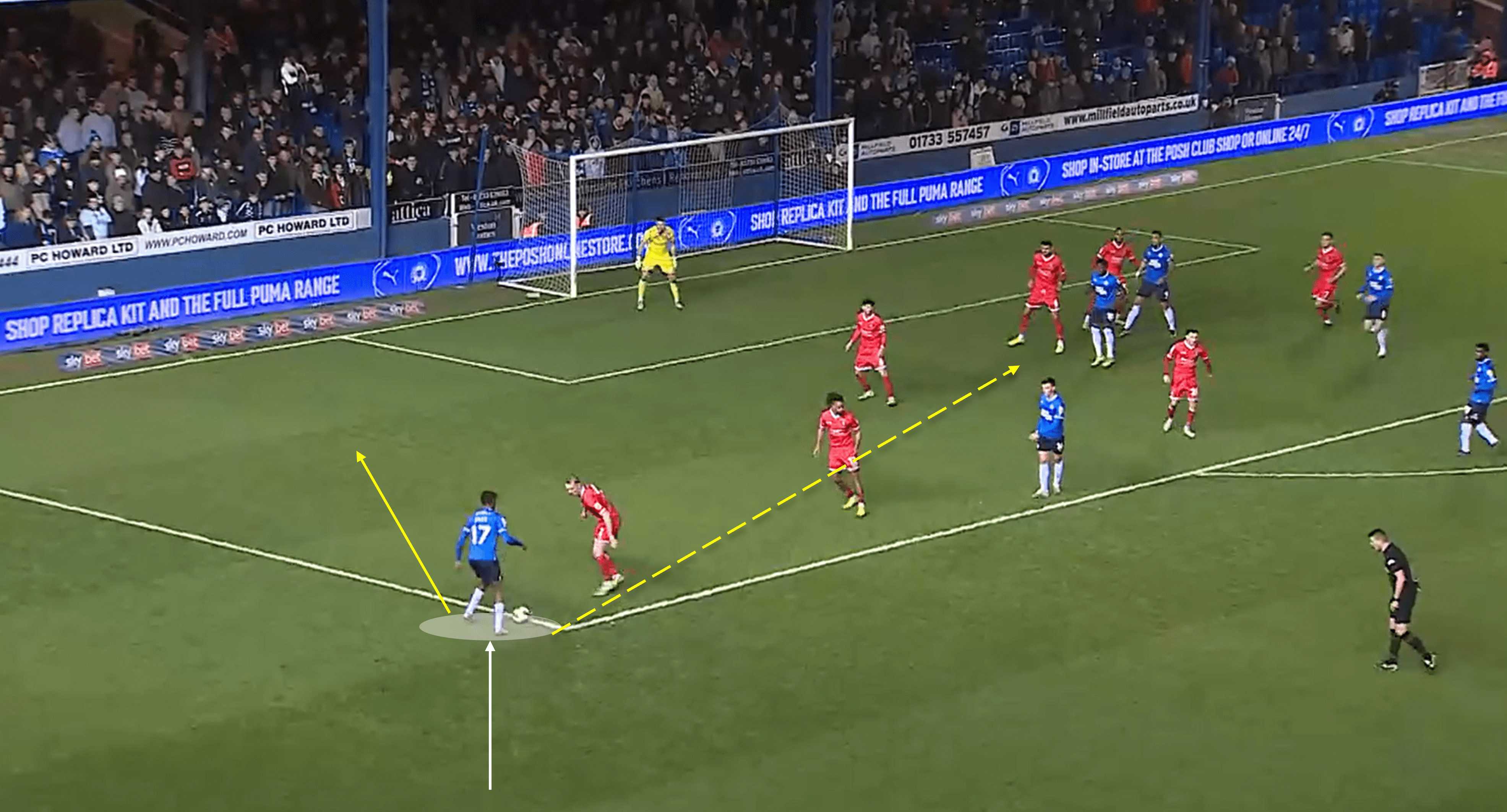 Typically, this was the ideal attacking picture for Posh – plenty of players in the attacking unit with coverage in both wide and central areas. The player on the ball is Kwame Poku, and the tricky winger was unlucky not to register an assist in this game with his contributions. We saw a glimpse of Peterborough’s tactics in these areas here, as it became apparent that they wanted Puko to get into 1v1 situations and run at defenders before putting a cross in from the byline.