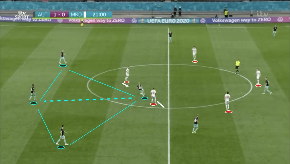 Austria’s back three outnumbered North Macedonia’s front two and played lots of short lateral passes with each other to try and open the passing lane into Schlager, however, as seen in figure 4, Pandev and Trajkovski were tasked with blocking those passing lanes and keeping Schlager in their cover shadow.