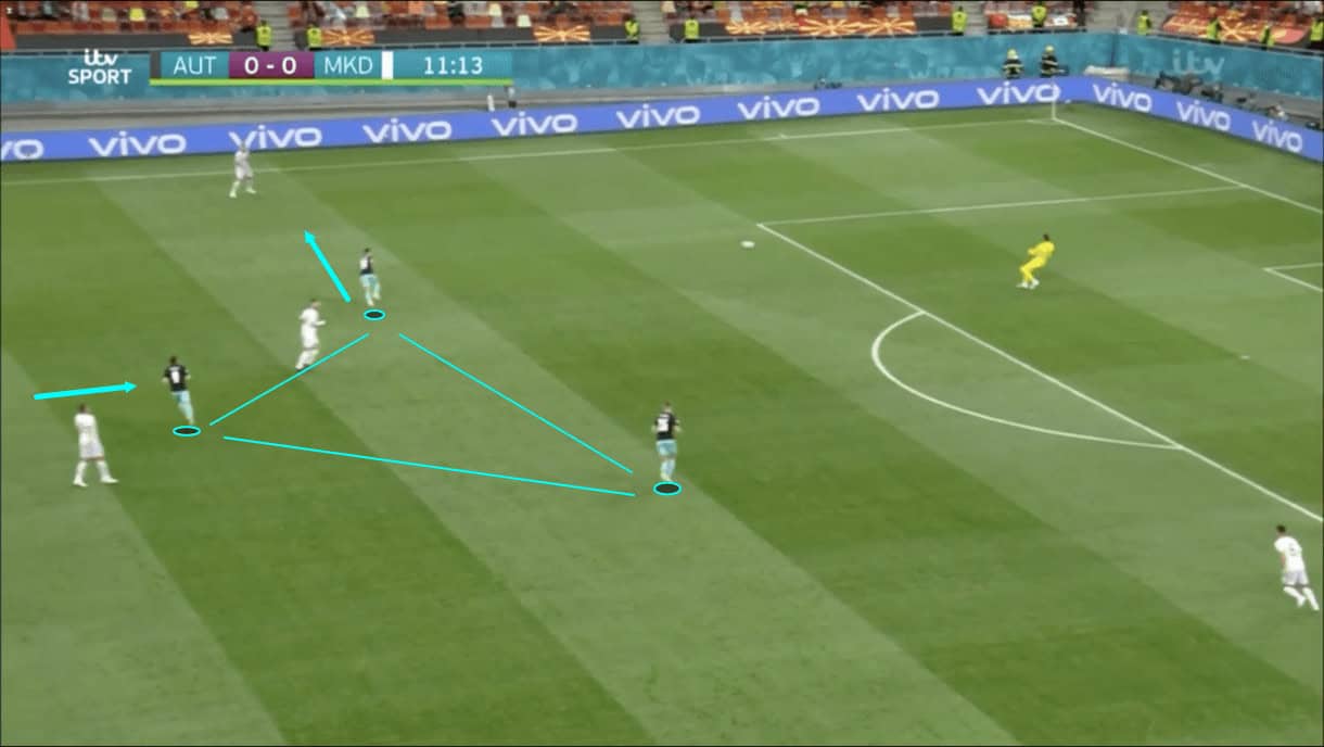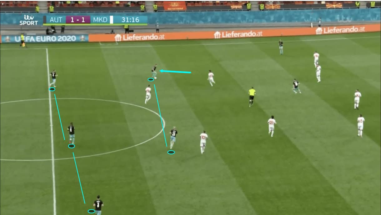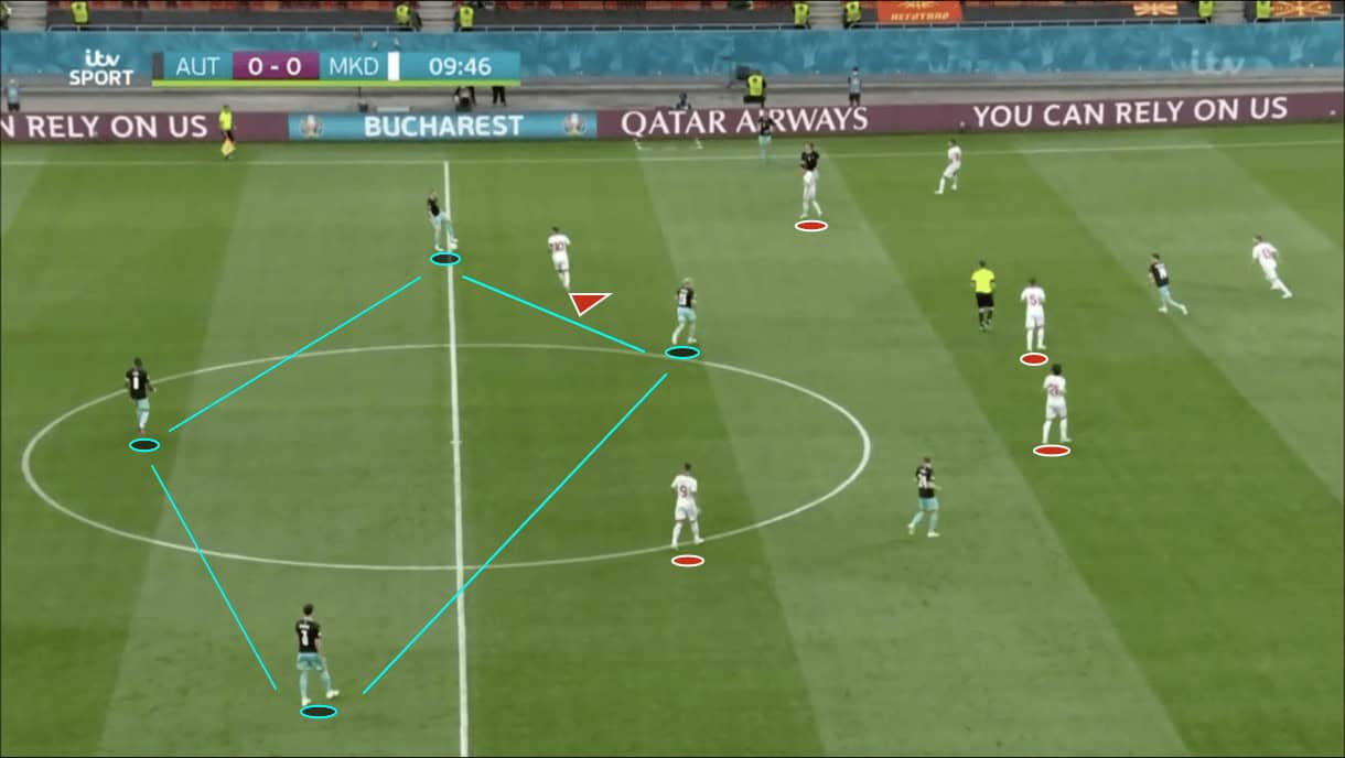 Austria set out to play through the centre, and holding midfielder Schlager, more than they ultimately ended up being able to. In figure 4, we see an example of how Austria looked for parts of this game, in and around the centre circle in their 3-1-4-2 shape, attempting to effectively progress the ball into North Macedonia’s half and give their more advanced teammates a chance to create goalscoring opportunities.